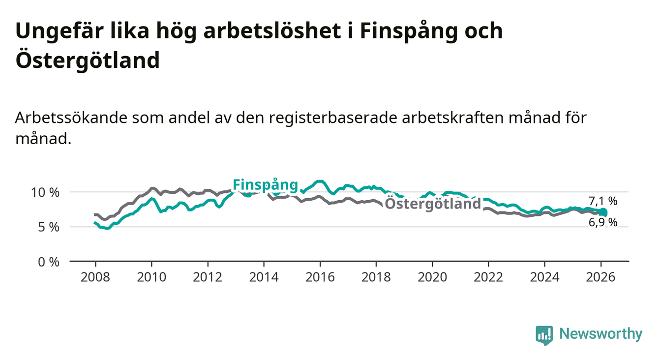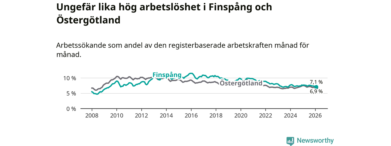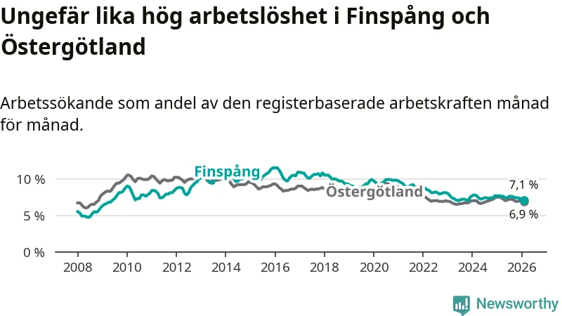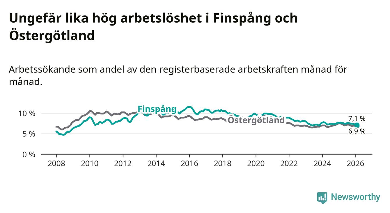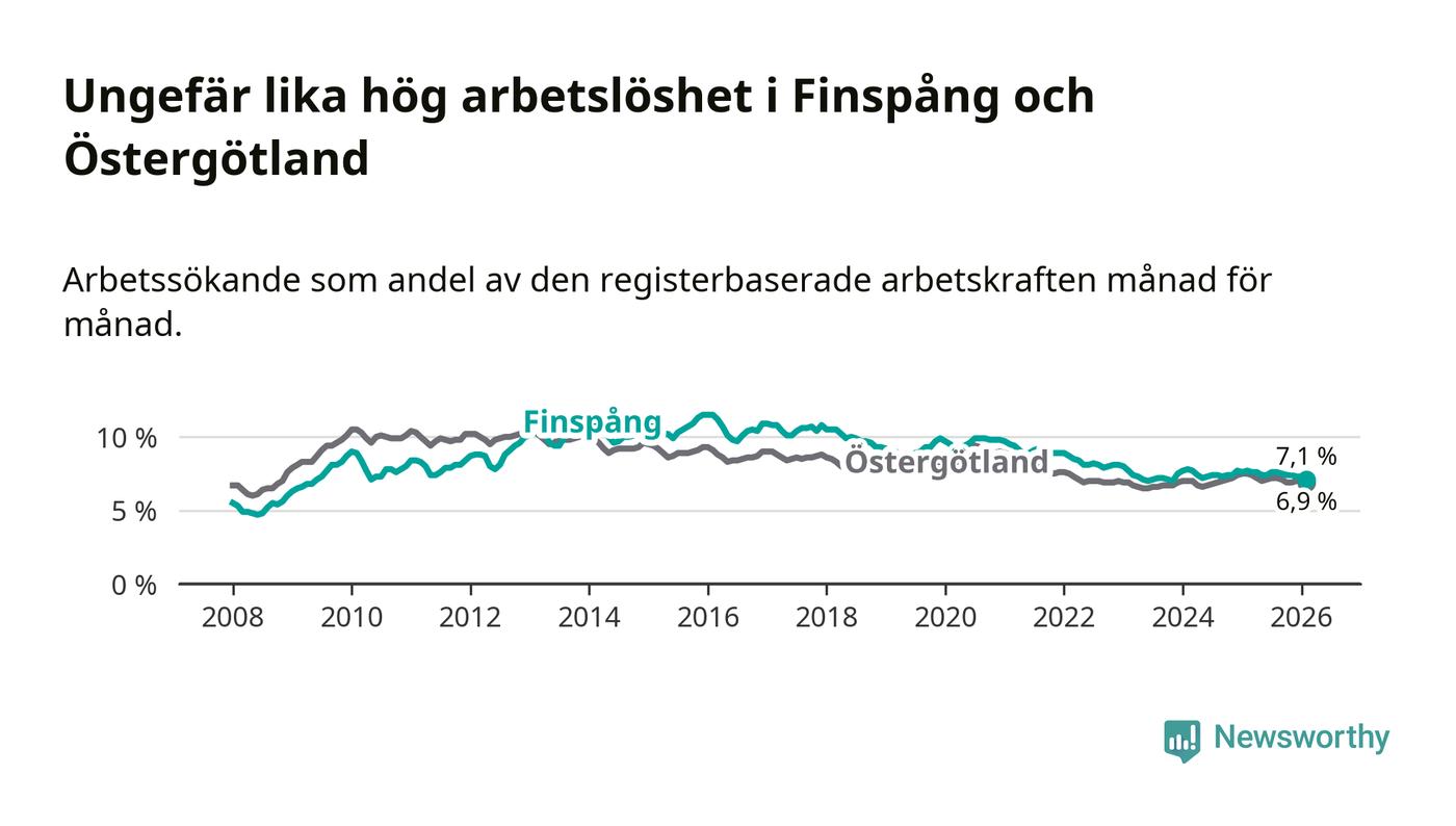 Under februari månad rapporterade Finspångs kommun en total arbetslöshet på 7,1 procent. Det är en minskning jämfört med samma tidpunkt i fjol (−0,6 procentenheter). Även i Östergötlands län sjunker arbetslösheten .