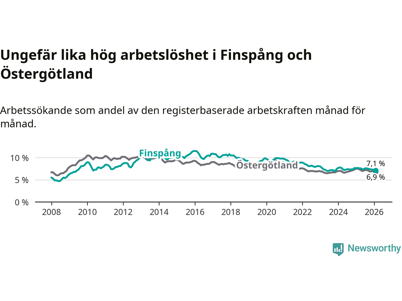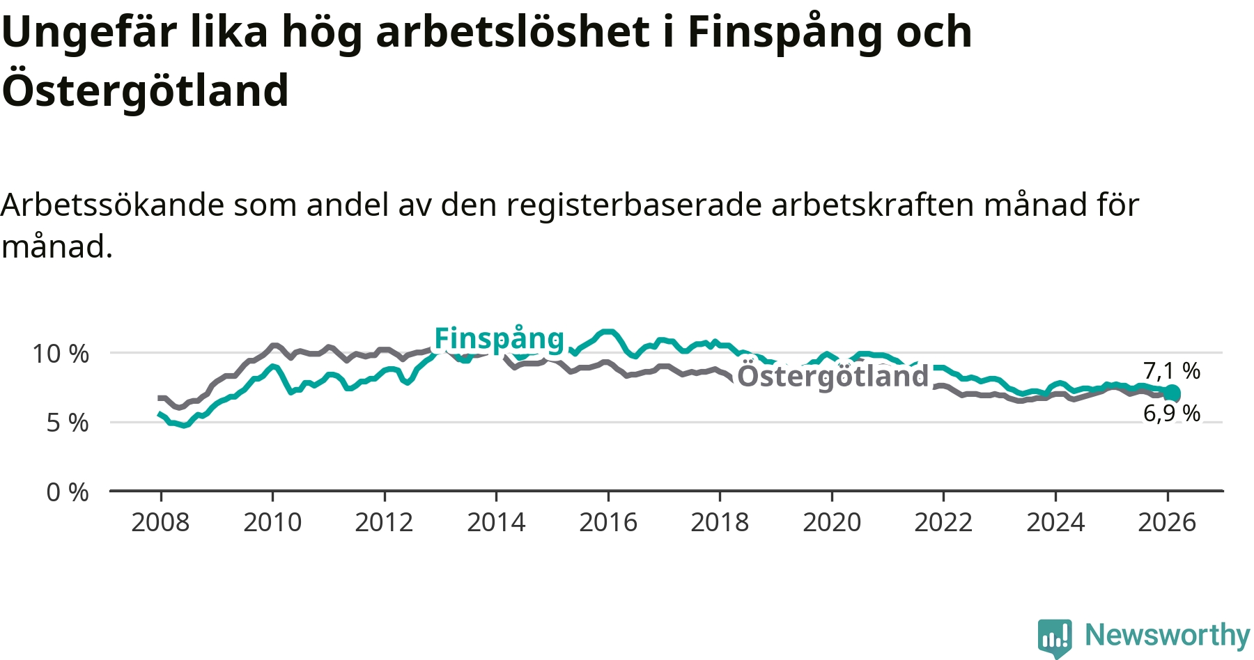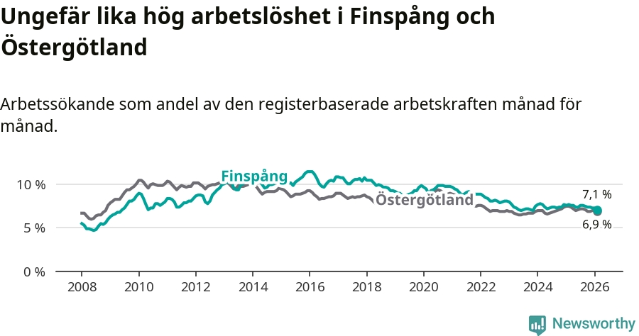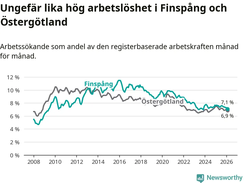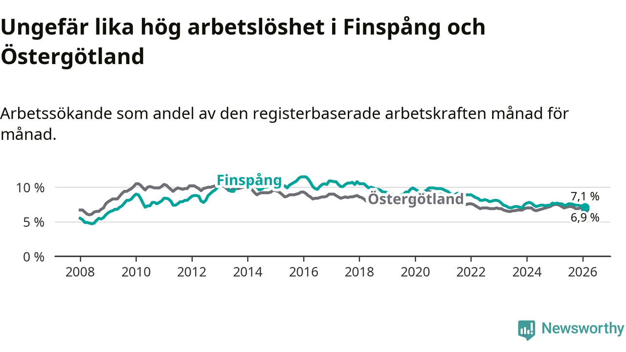 Under februari månad rapporterade Finspångs kommun en total arbetslöshet på 7,1 procent. Det är en minskning jämfört med samma tidpunkt i fjol (−0,6 procentenheter). Även i Östergötlands län sjunker arbetslösheten .