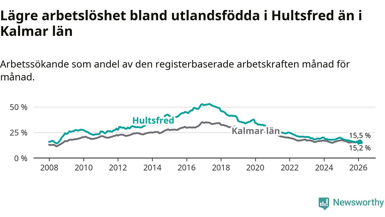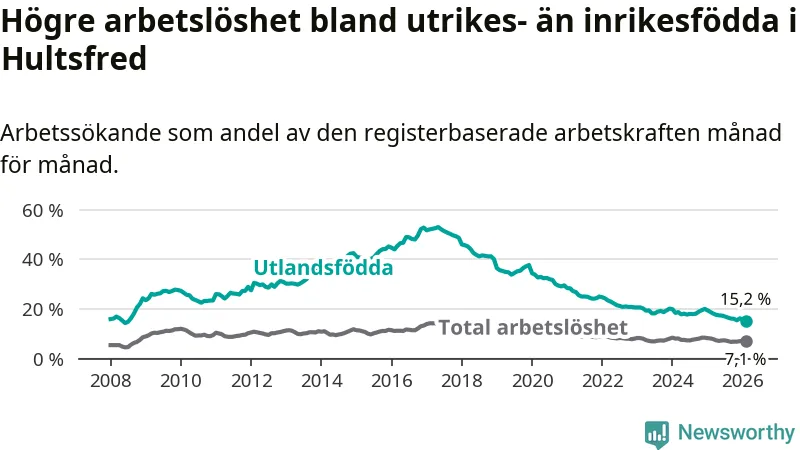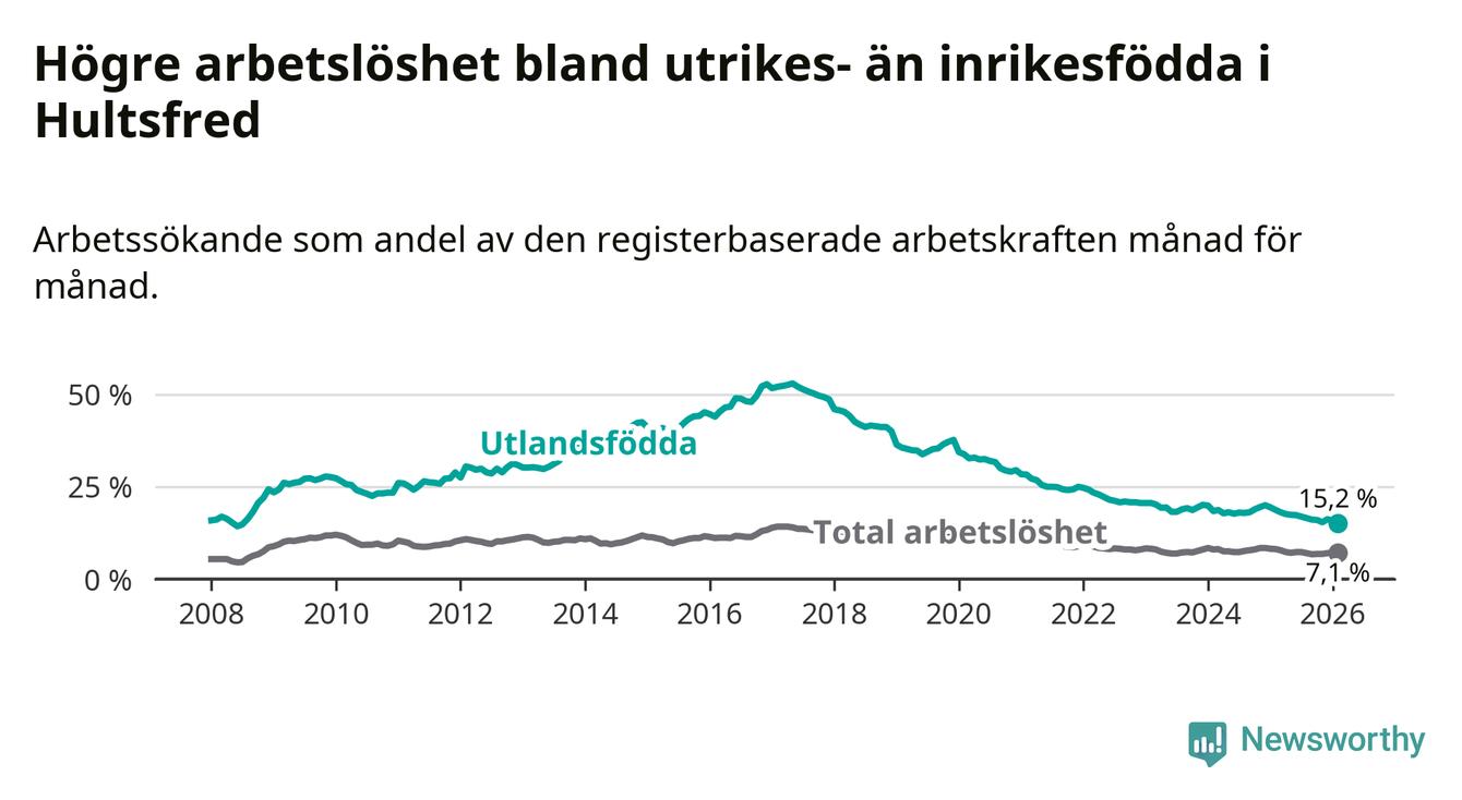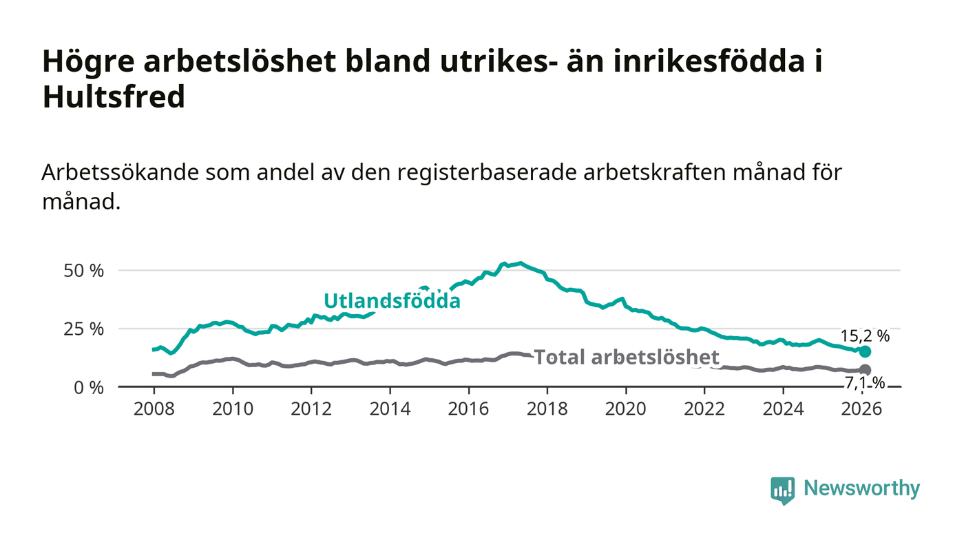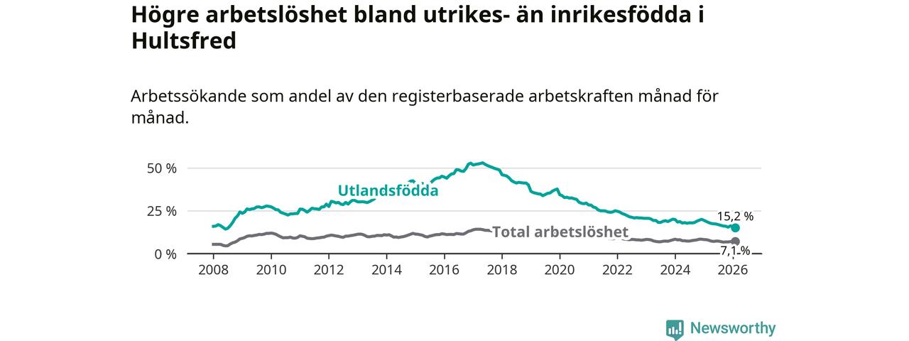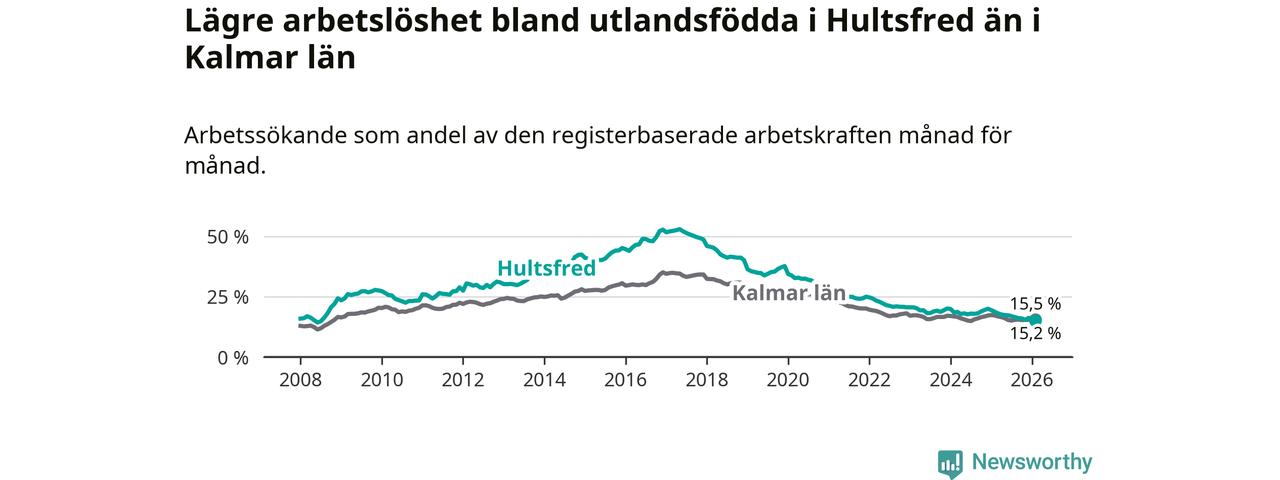 Arbetslösheten bland utlandsfödda var 15,2 procent i Hultsfred under februari månad, motsvarande 219 av 1 441 personer. Det är 3,5 procentenheter färre än vid samma tidpunkt i fjol (−53 om man räknar personer). Därmed är de utlandsföddas arbetslöshet lägre än vid samma tidpunkt i fjol för tolfte månaden i följd. Sedan februari 2025 har arbetslösheten bland utlandsfödda minskat från 18,7 till 15,2 procent. Den nuvarande arbetslöshetsnivån är den lägsta sedan juli 2008.