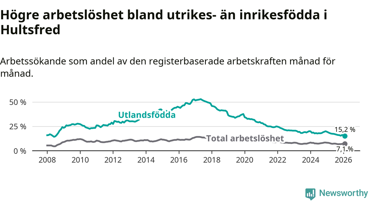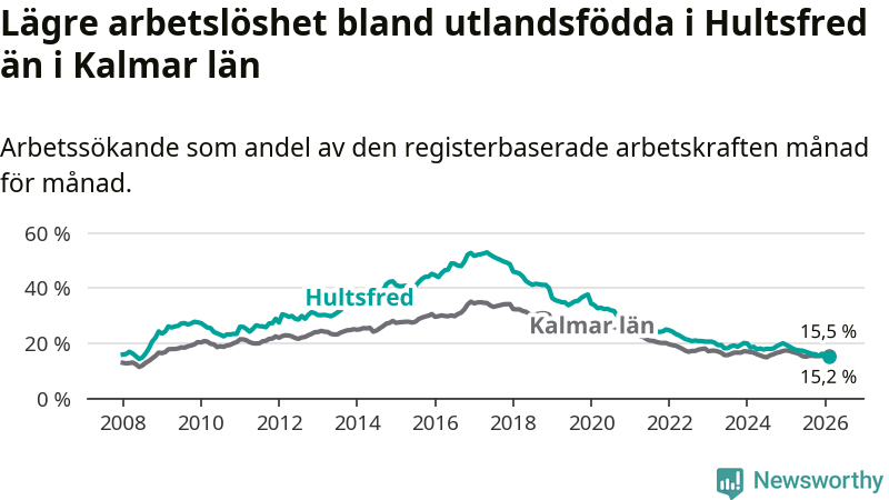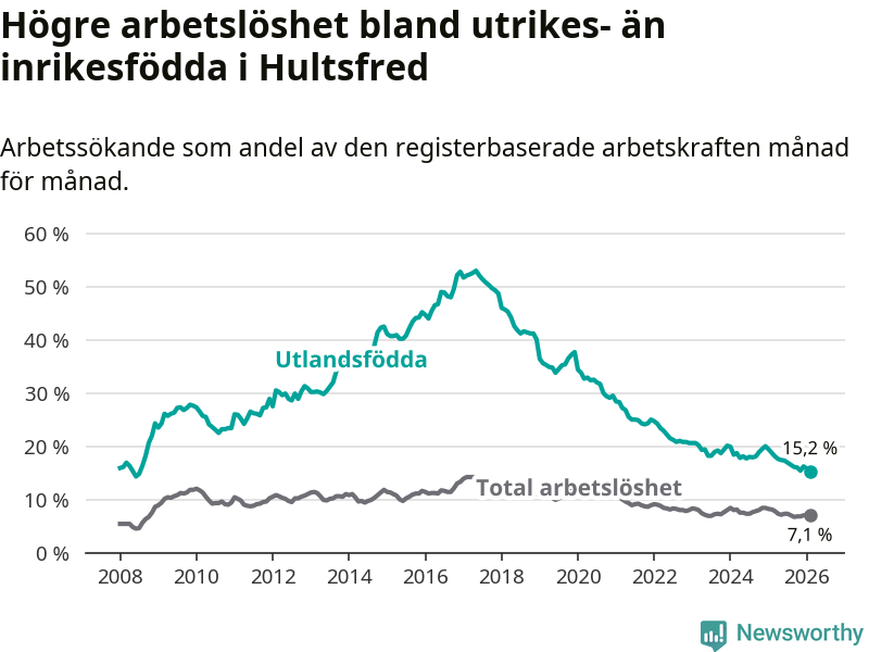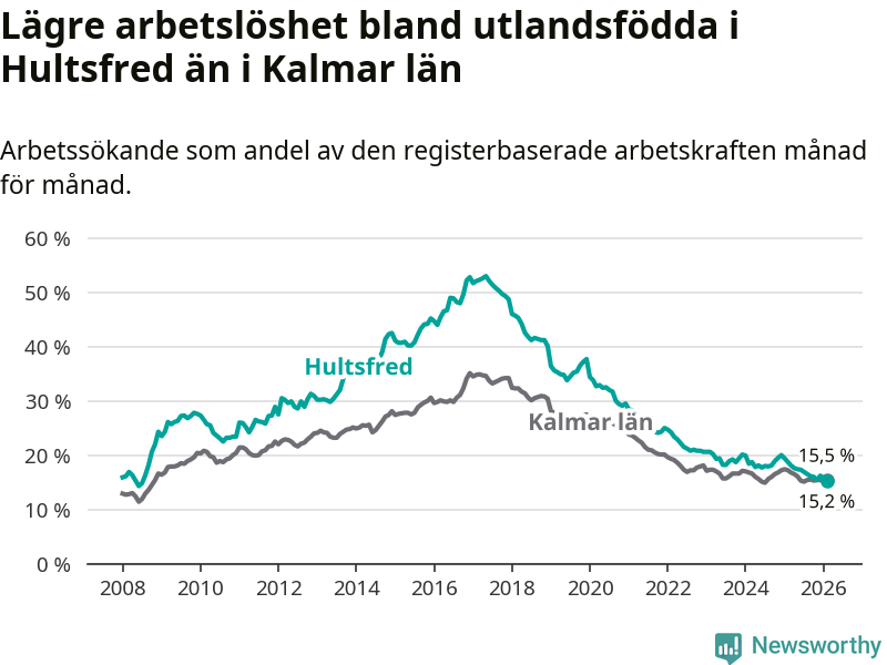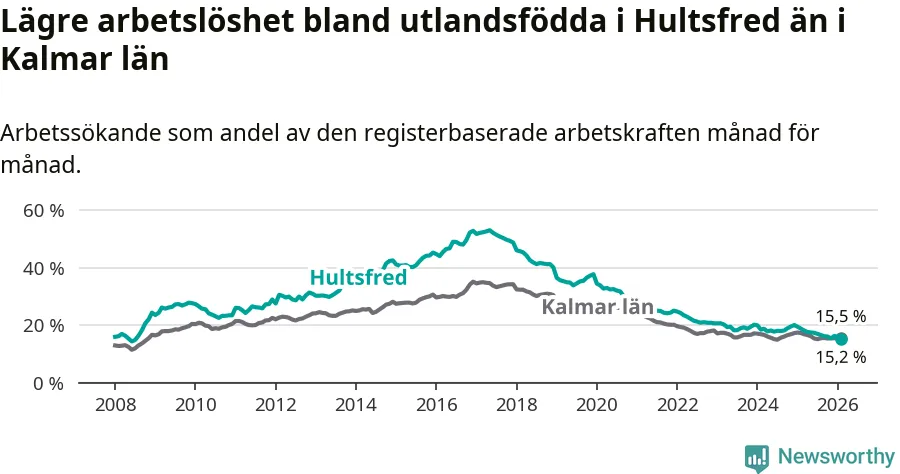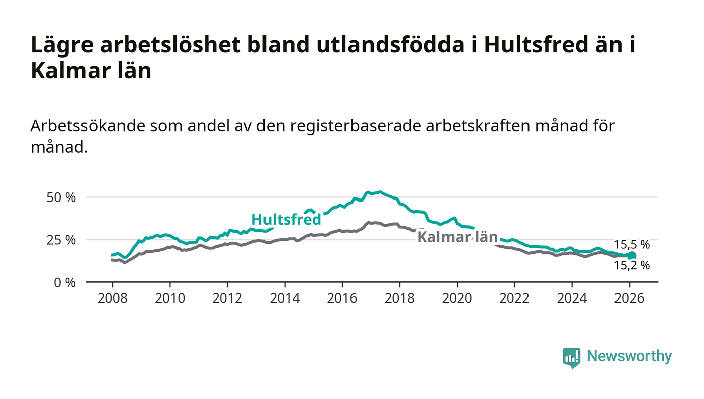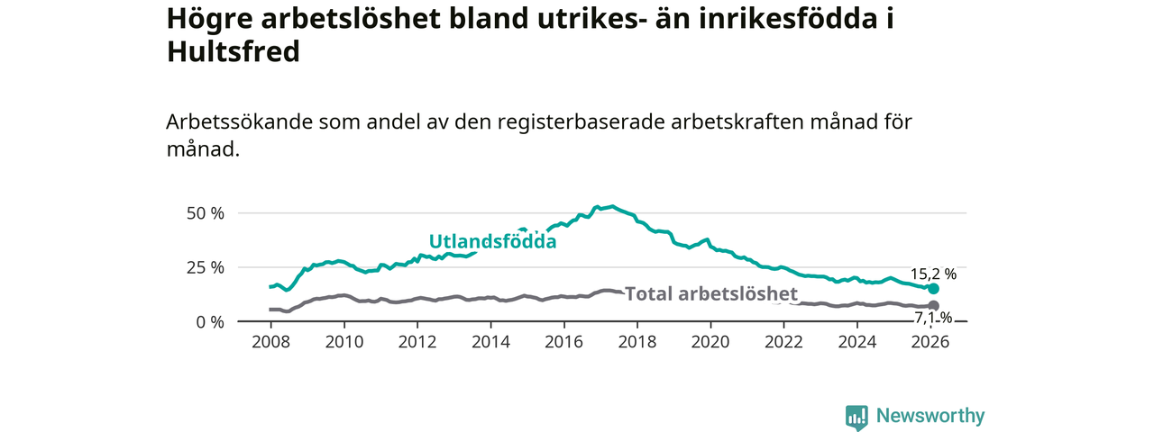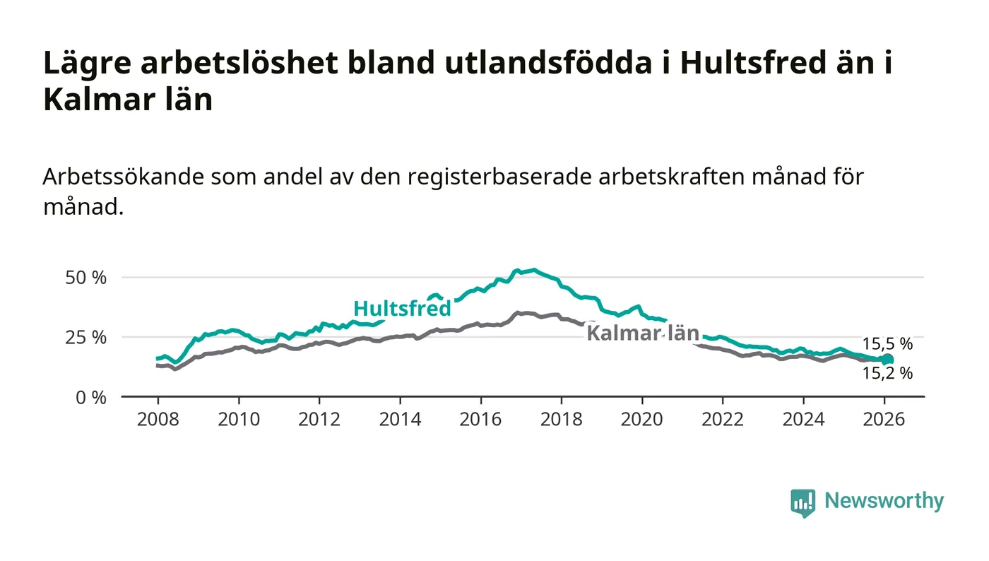 Arbetslösheten bland utlandsfödda var 15,2 procent i Hultsfred under februari månad, motsvarande 219 av 1 441 personer. Det är 3,5 procentenheter färre än vid samma tidpunkt i fjol (−53 om man räknar personer). Därmed är de utlandsföddas arbetslöshet lägre än vid samma tidpunkt i fjol för tolfte månaden i följd. Sedan februari 2025 har arbetslösheten bland utlandsfödda minskat från 18,7 till 15,2 procent. Den nuvarande arbetslöshetsnivån är den lägsta sedan juli 2008.