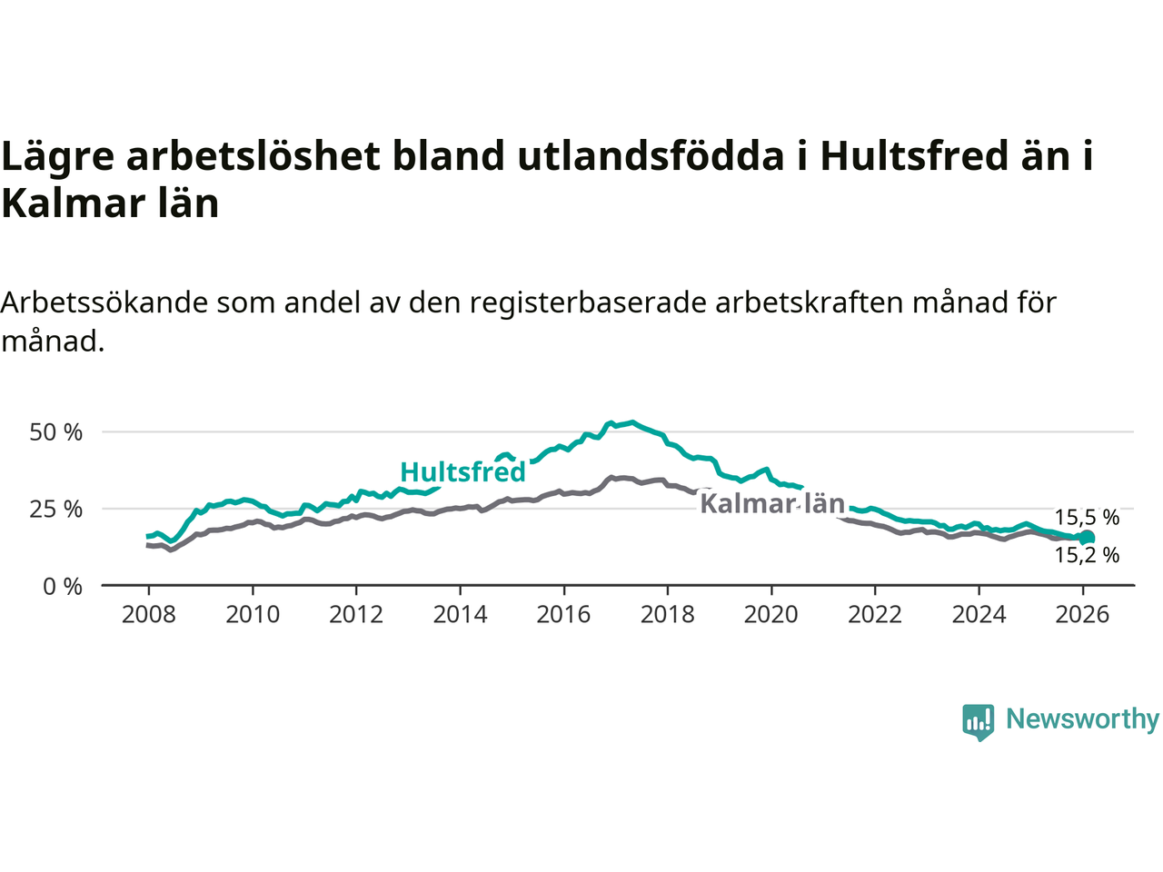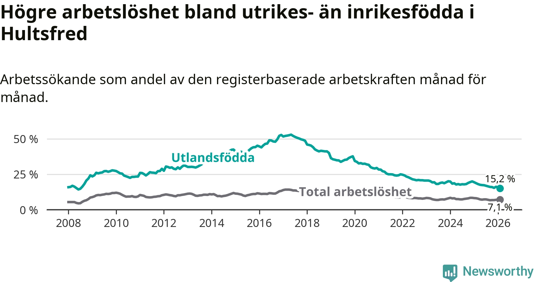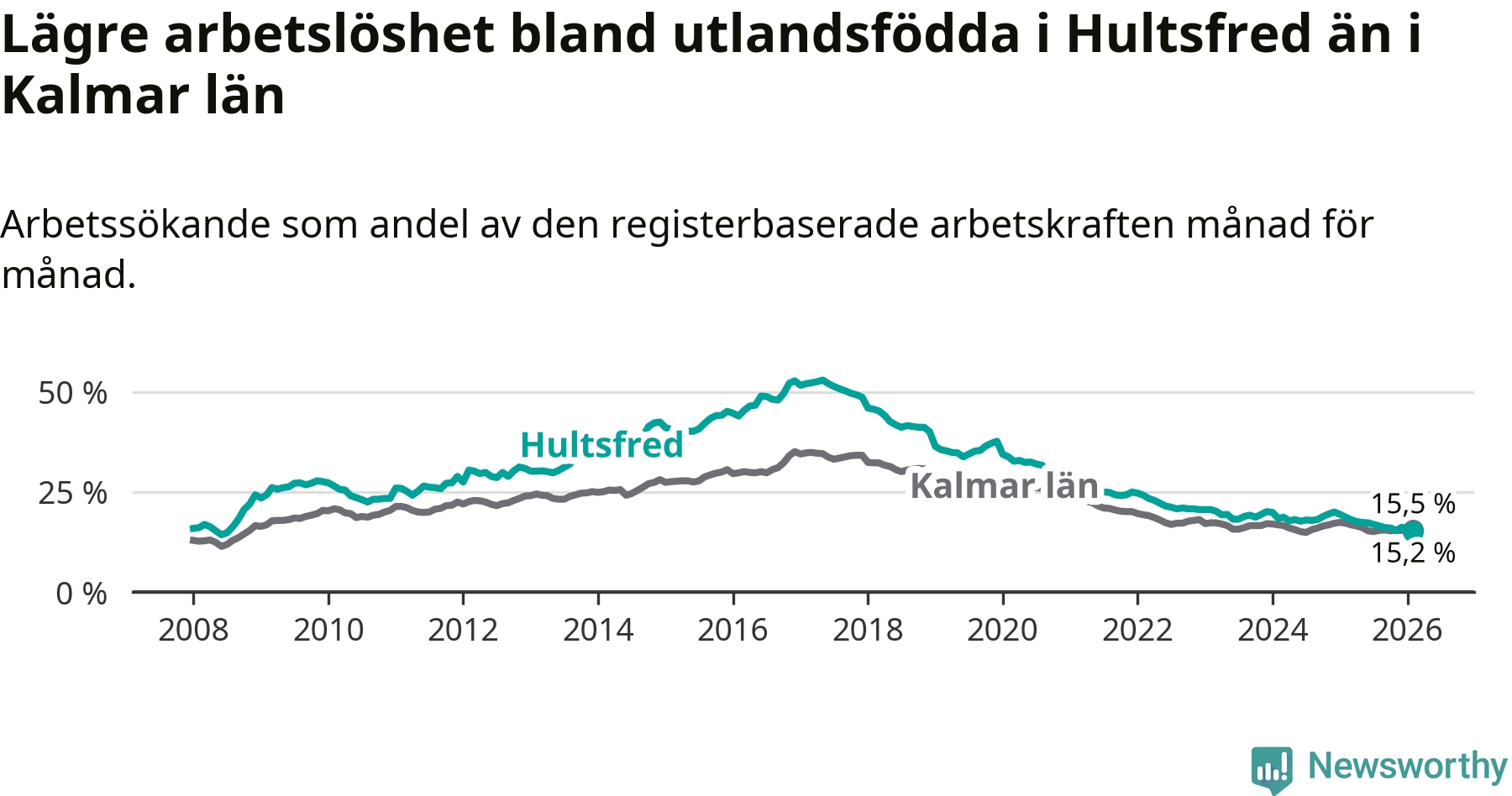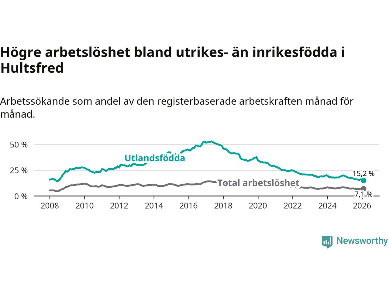 Arbetslösheten bland utlandsfödda var 15,2 procent i Hultsfred under februari månad, motsvarande 219 av 1 441 personer. Det är 3,5 procentenheter färre än vid samma tidpunkt i fjol (−53 om man räknar personer). Därmed är de utlandsföddas arbetslöshet lägre än vid samma tidpunkt i fjol för tolfte månaden i följd. Sedan februari 2025 har arbetslösheten bland utlandsfödda minskat från 18,7 till 15,2 procent. Den nuvarande arbetslöshetsnivån är den lägsta sedan juli 2008.