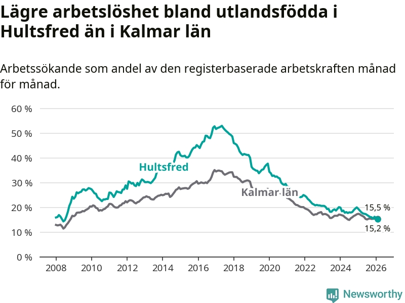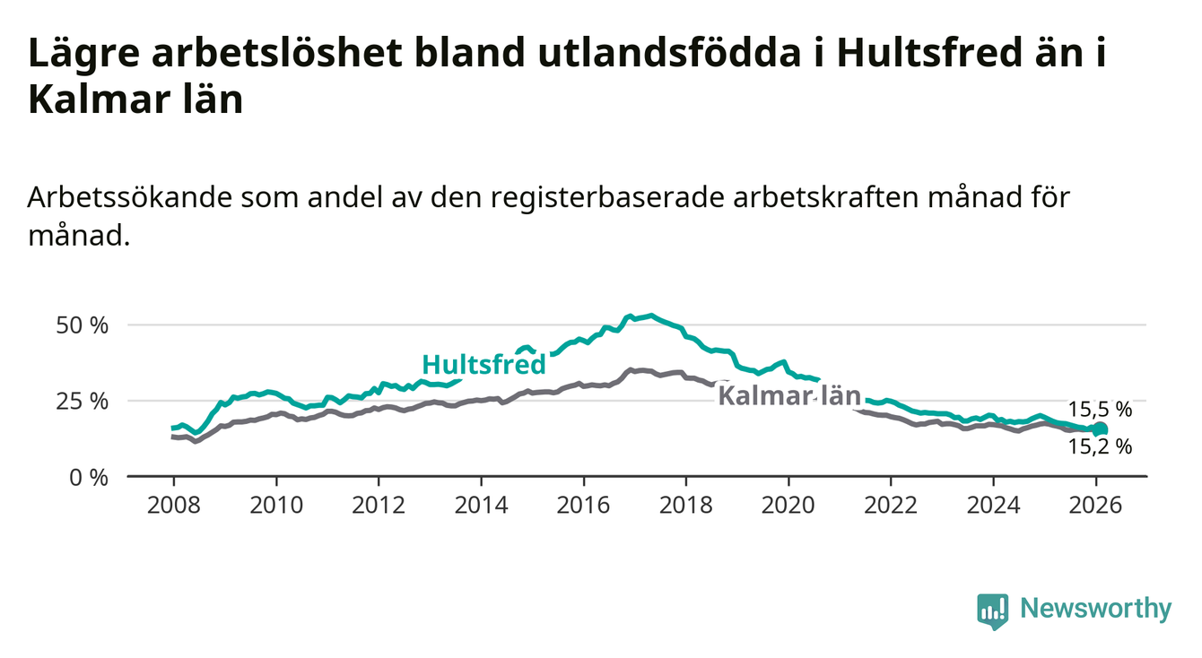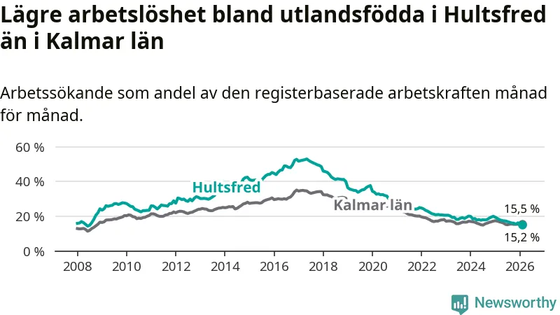 Arbetslösheten bland utlandsfödda lägre i Hultsfred än i Kalmar län för första gången på över 18 år