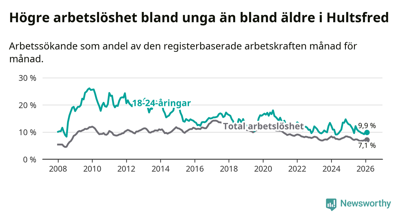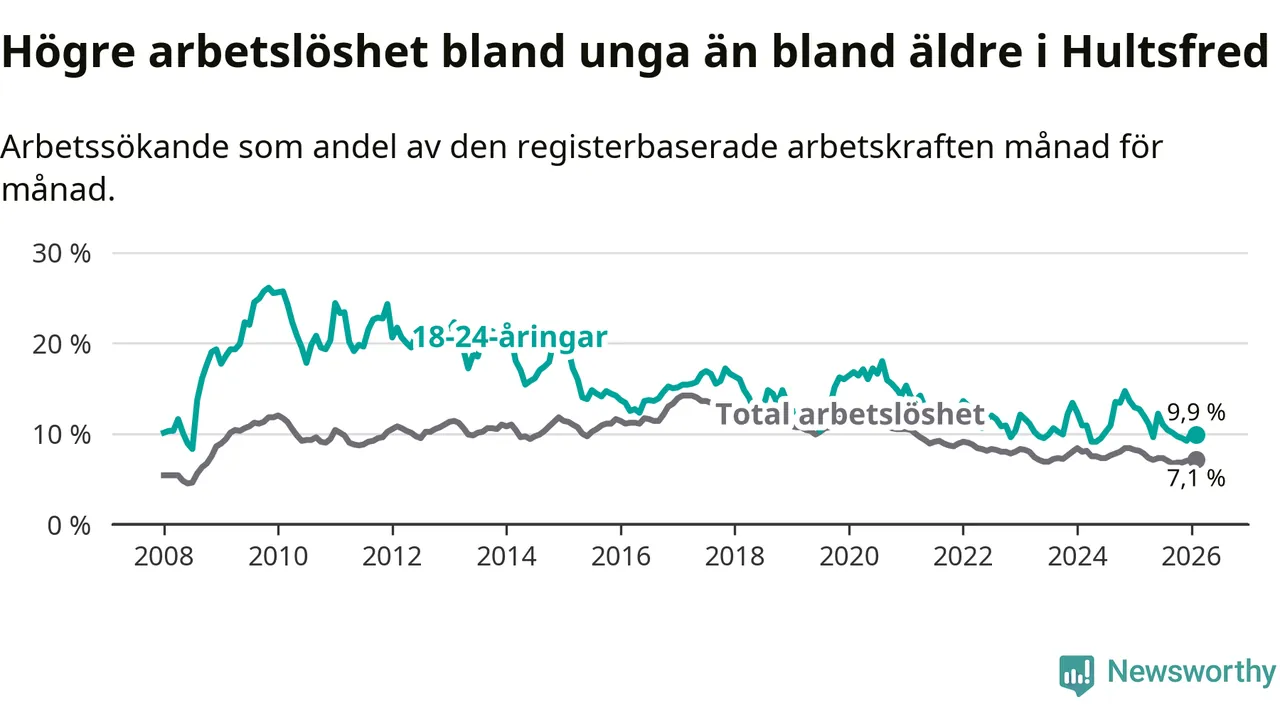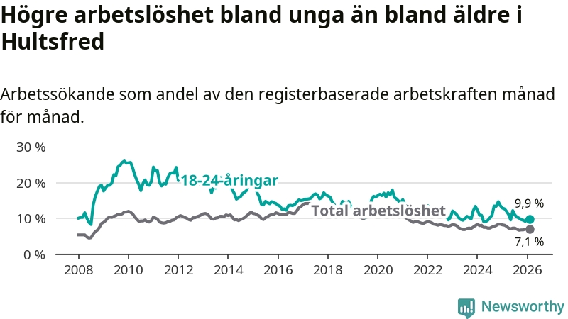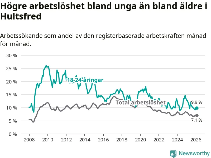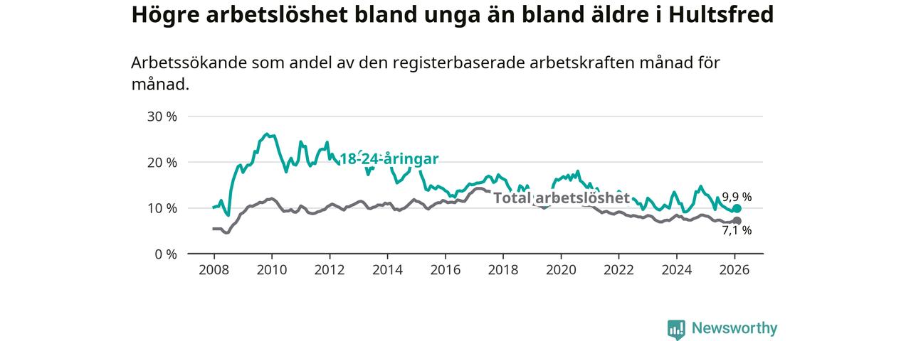 I och med den senaste månadens nedgång har de ungas arbetslöshet i Hultsfred sjunkit sju månader i följd (ner från 11,0 procent i juli 2025 till 9,9 procent nu).