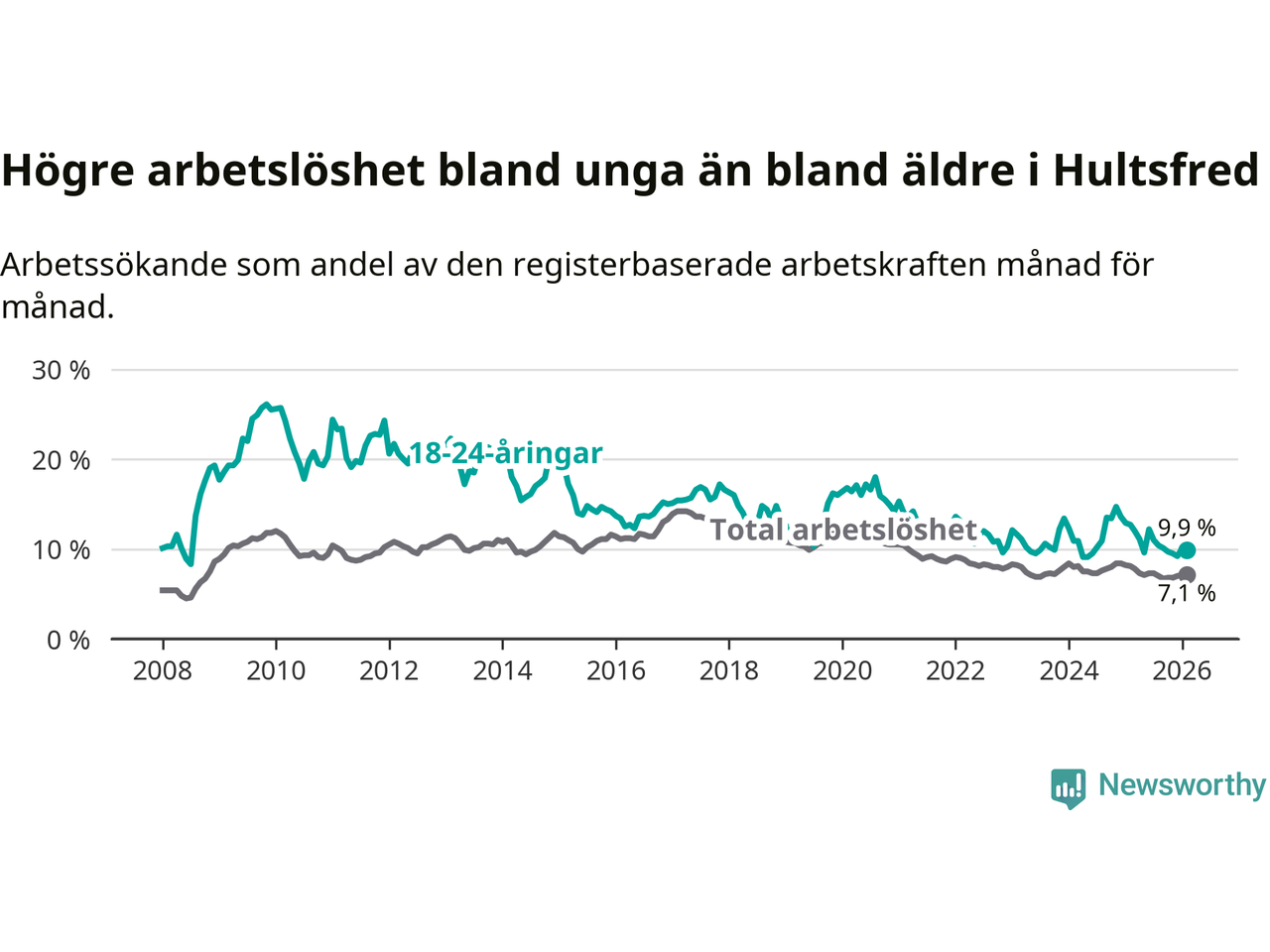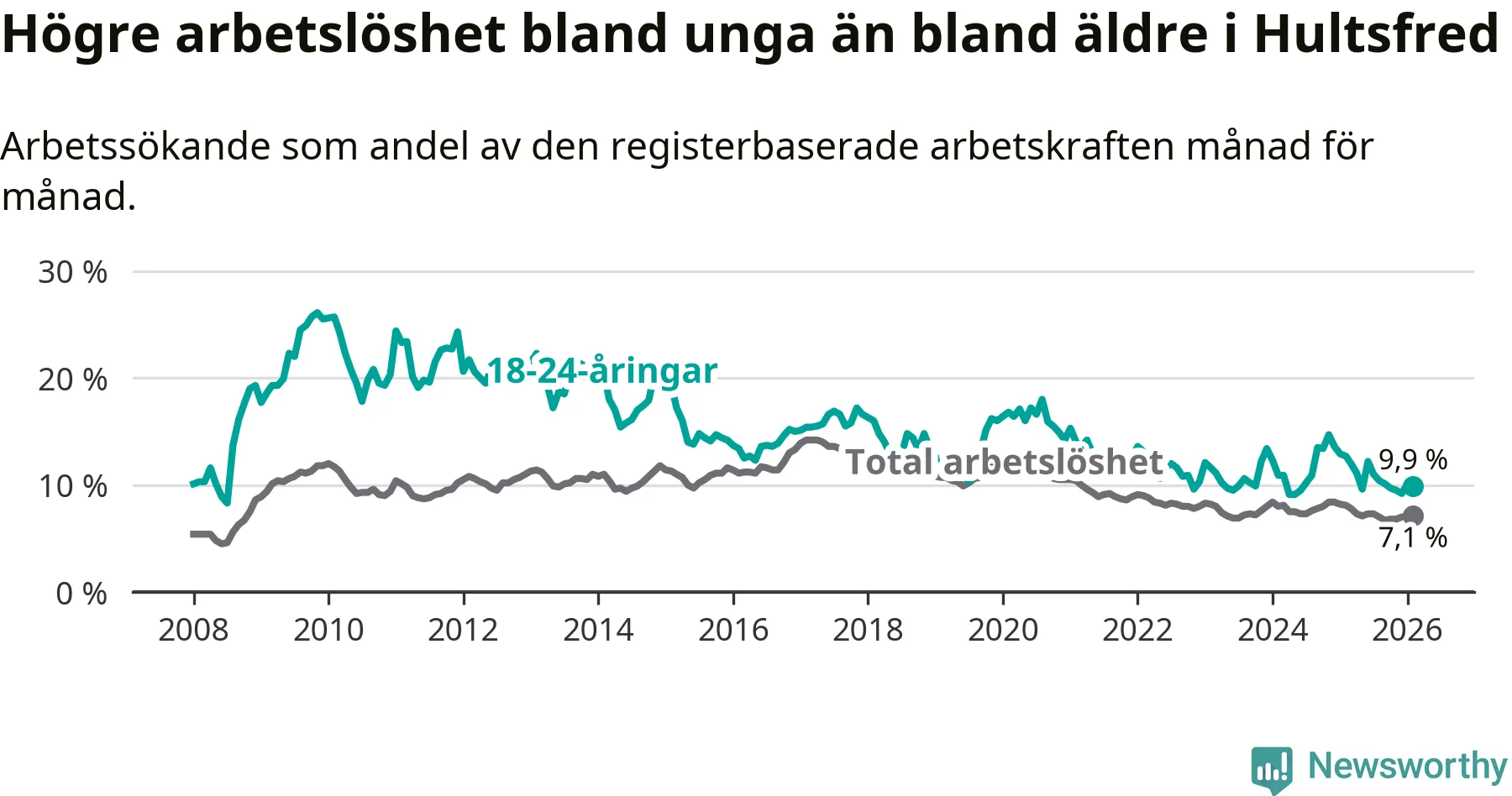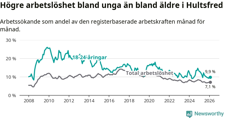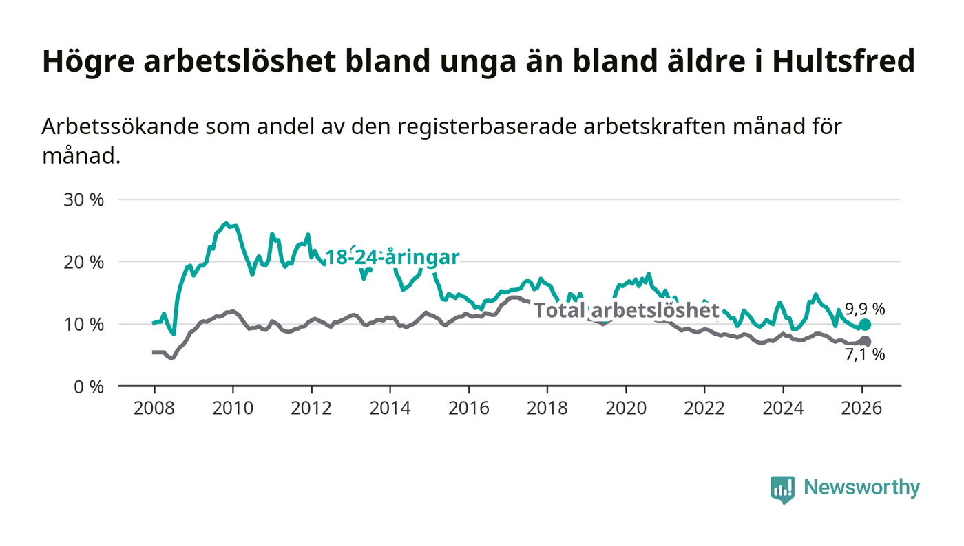 I och med den senaste månadens nedgång har de ungas arbetslöshet i Hultsfred sjunkit sju månader i följd (ner från 11,0 procent i juli 2025 till 9,9 procent nu).