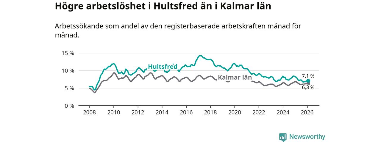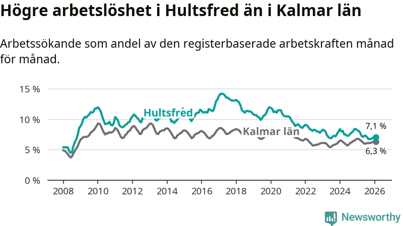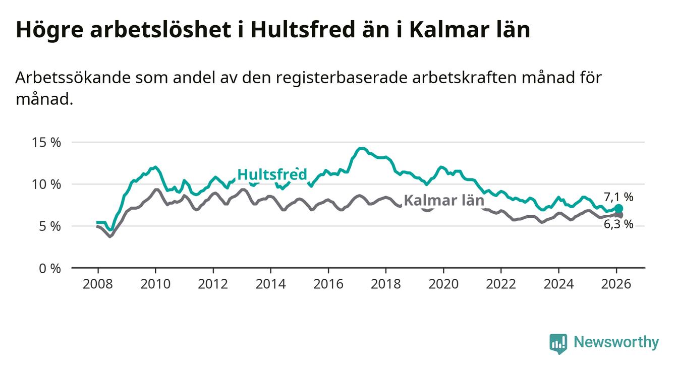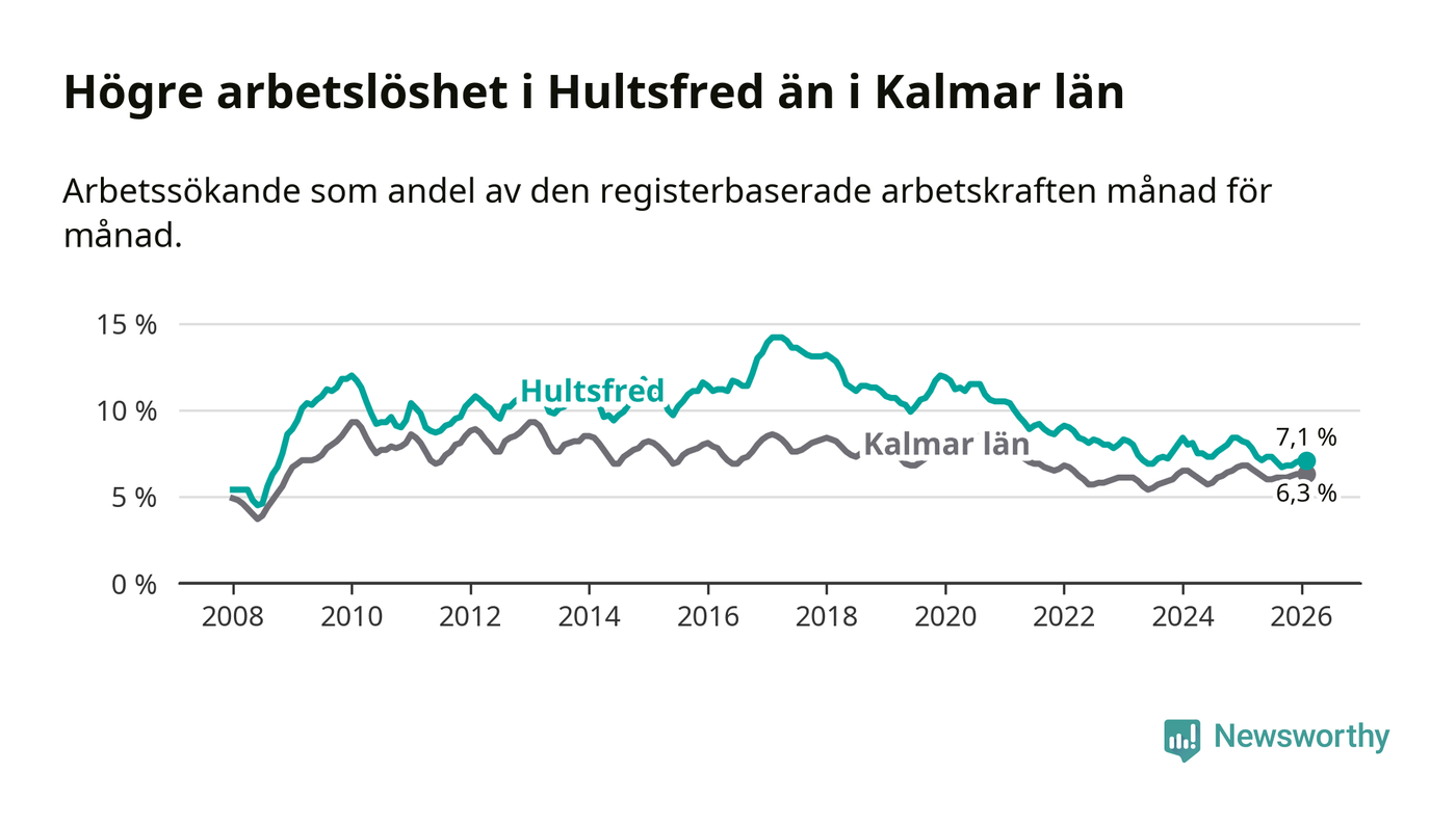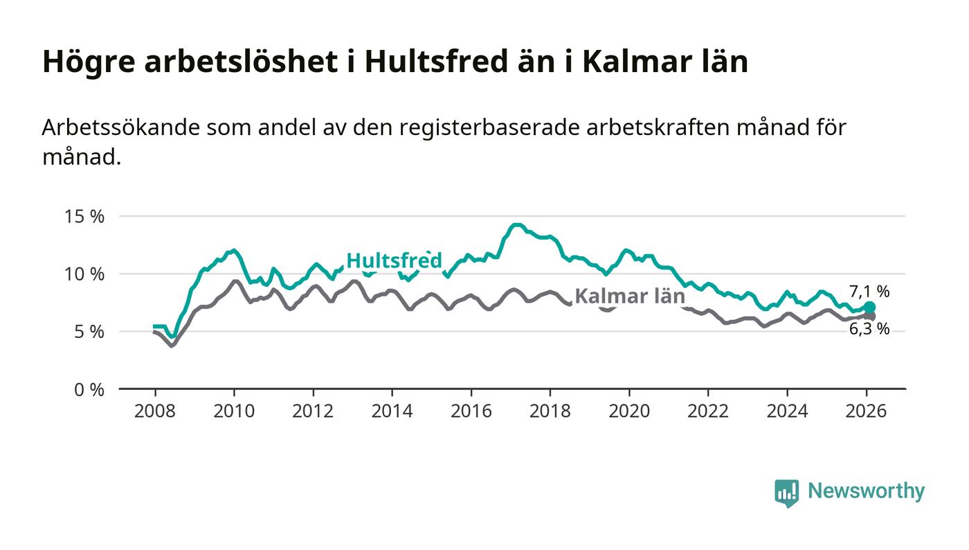 Under februari månad rapporterade Hultsfreds kommun en total arbetslöshet på 7,1 procent. Det är en minskning jämfört med samma tidpunkt i fjol (−1,0 procentenheter). Även i Kalmar län sjunker arbetslösheten .