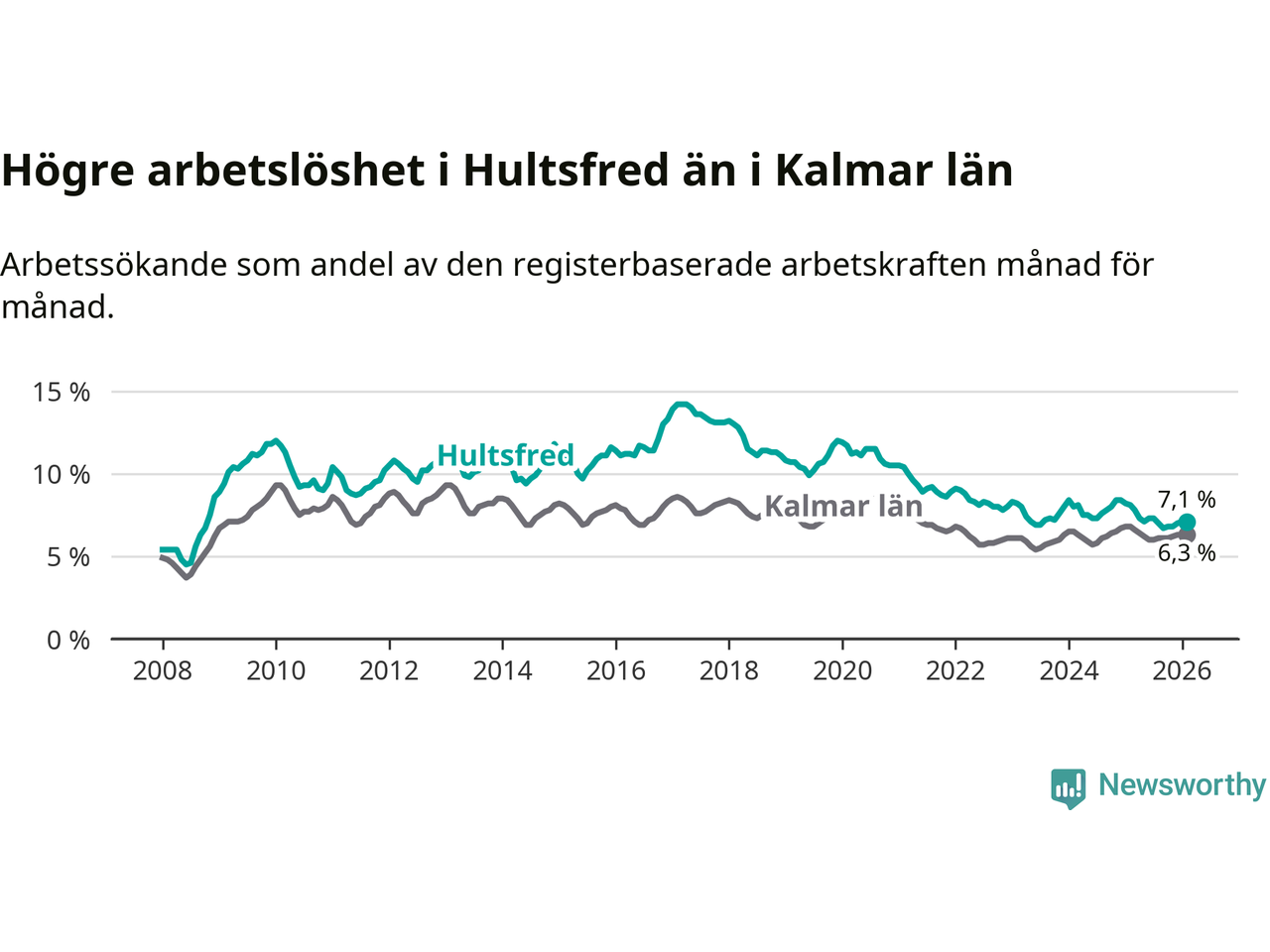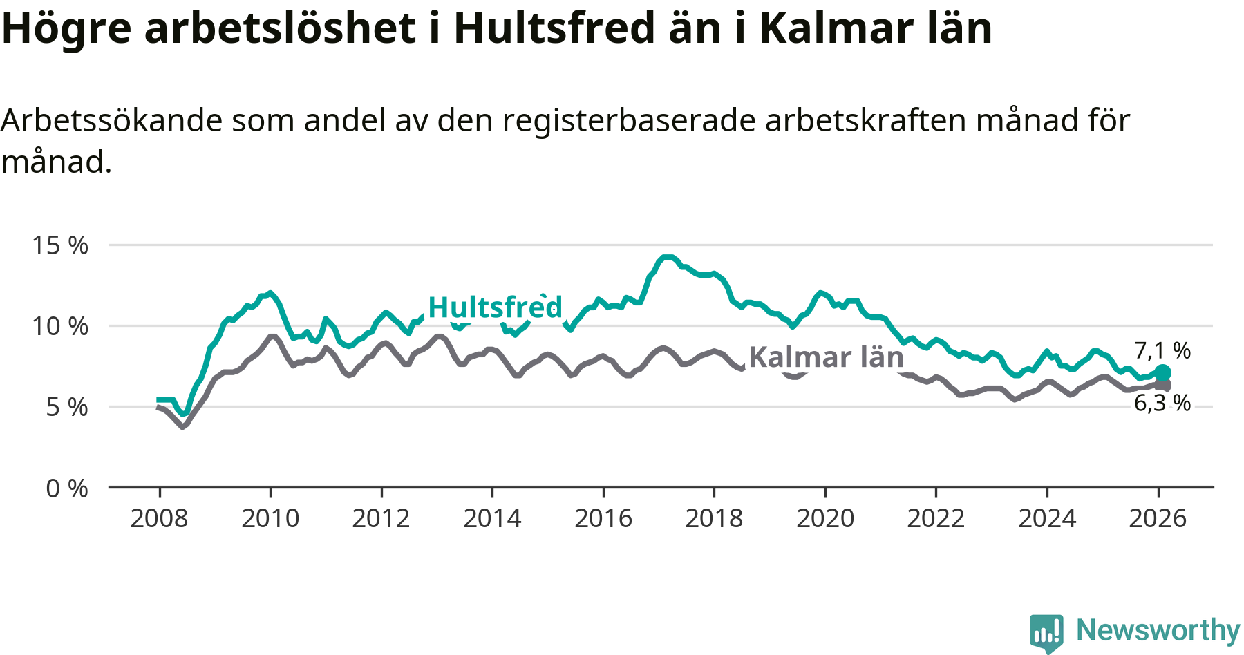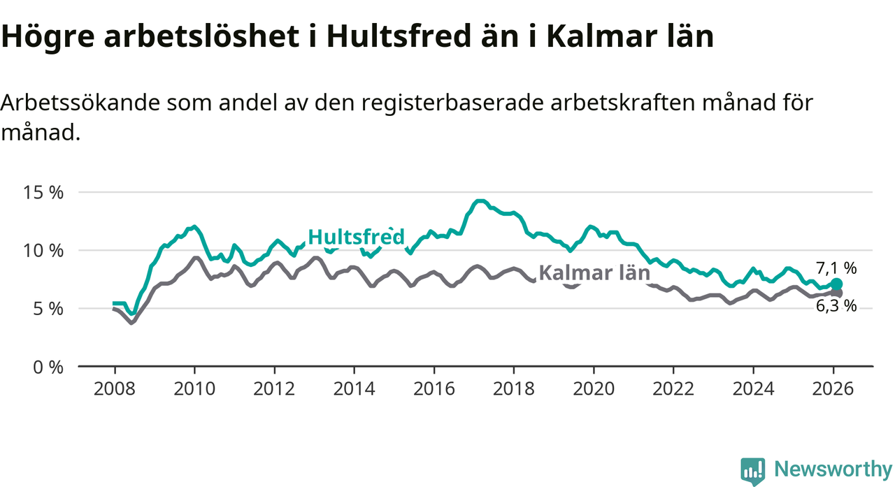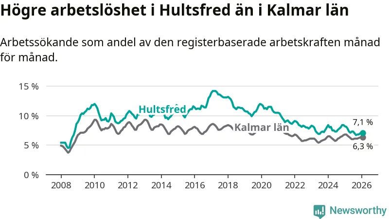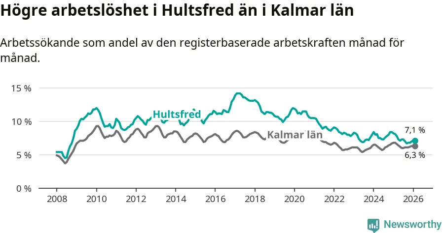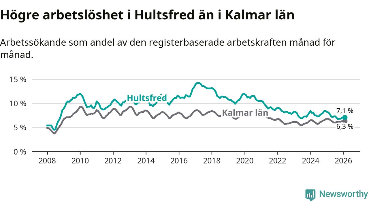 Under februari månad rapporterade Hultsfreds kommun en total arbetslöshet på 7,1 procent. Det är en minskning jämfört med samma tidpunkt i fjol (−1,0 procentenheter). Även i Kalmar län sjunker arbetslösheten .