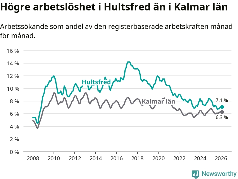 Graf: Arbetslöshet i Hultsfreds kommun och Kalmar län