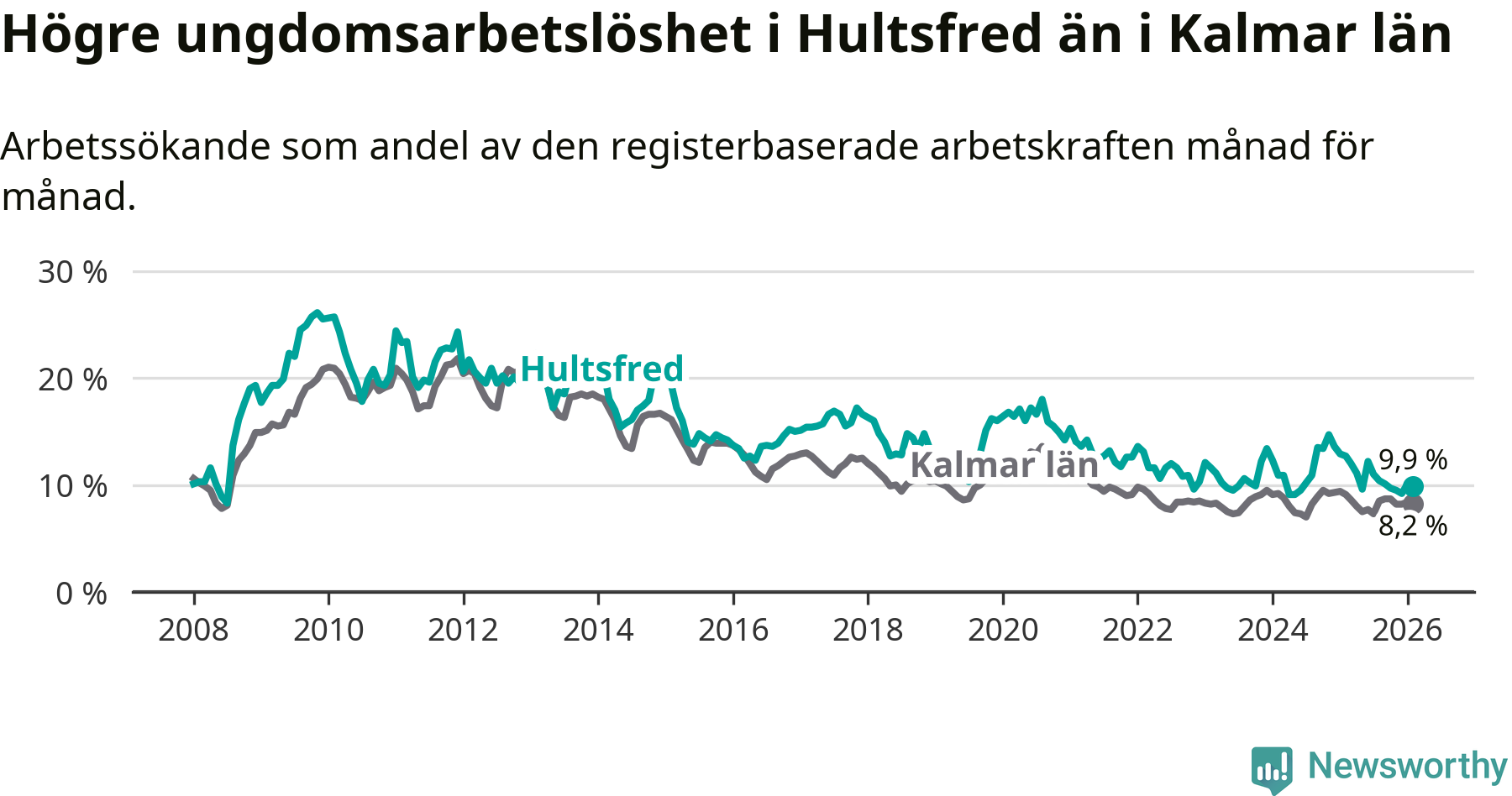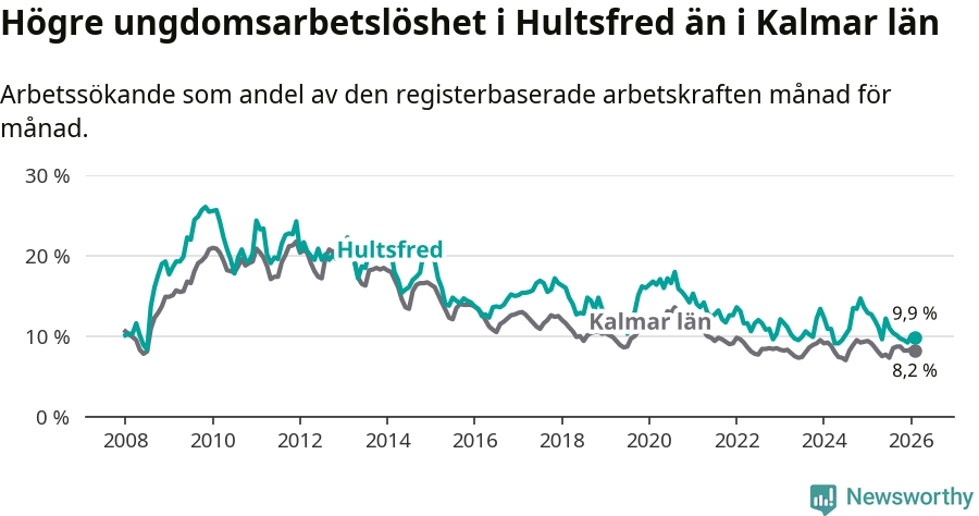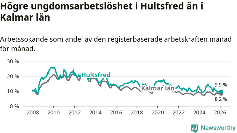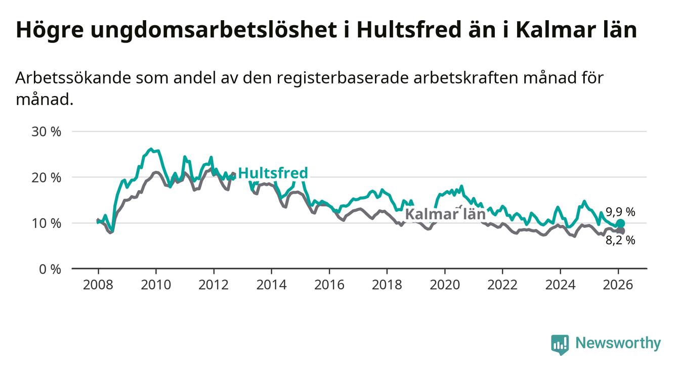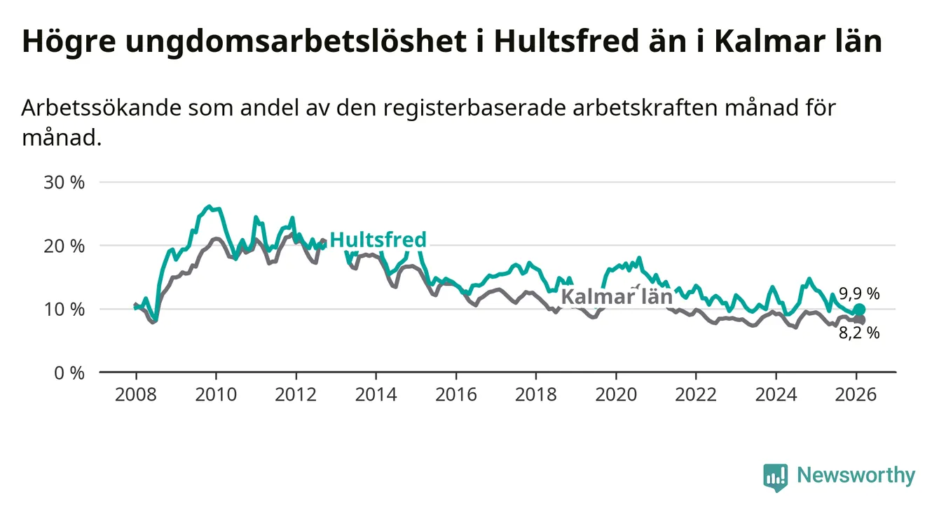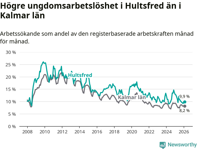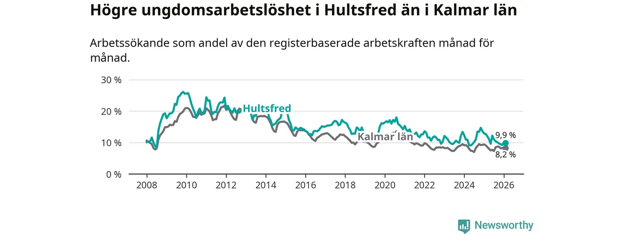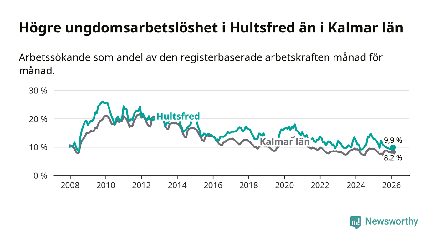 Precis som den totala arbetslösheten ligger ungdomsarbetslösheten i Hultsfred högre än i Kalmar län som helhet. Skillnaden mellan kommunen och länet är 1,7 procentenheter.