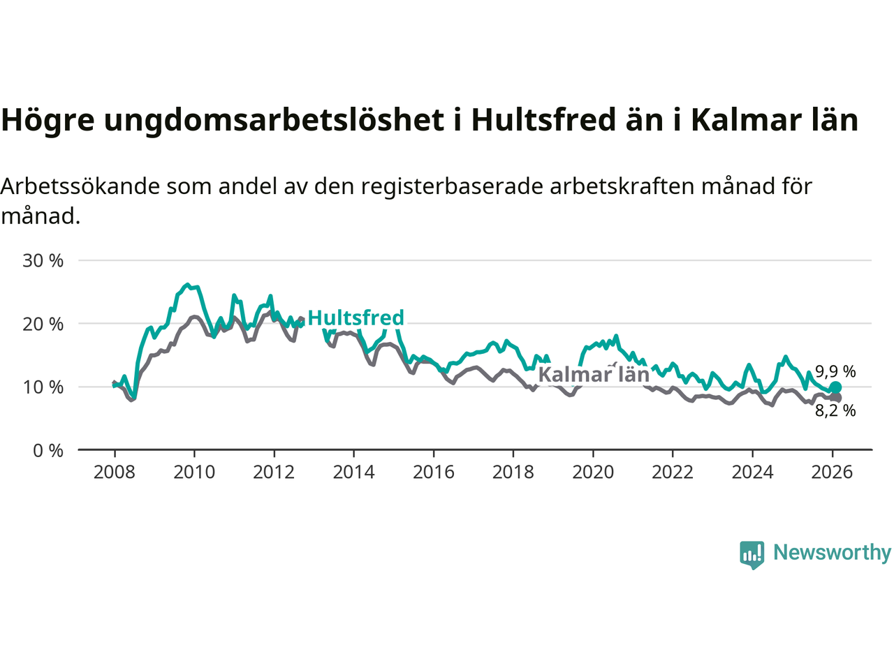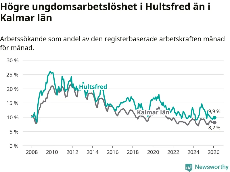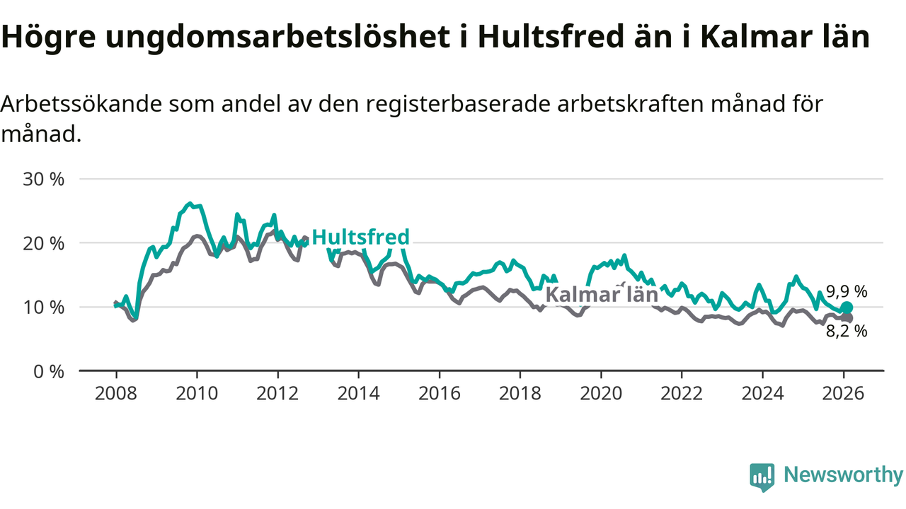 Graf: Arbetslöshet bland unga i Hultsfreds kommun och Kalmar län