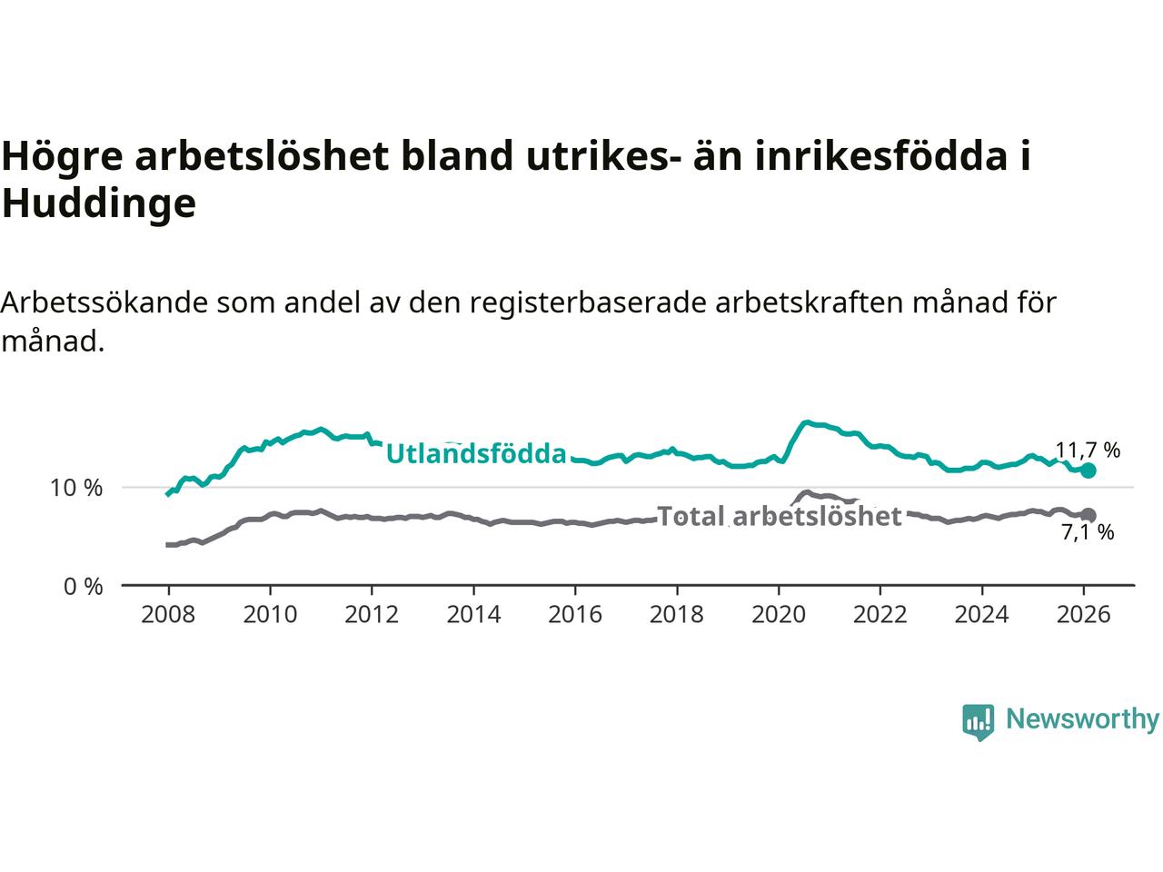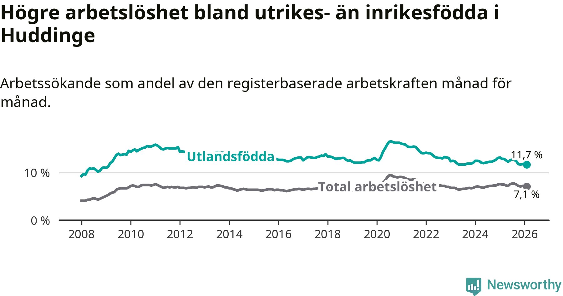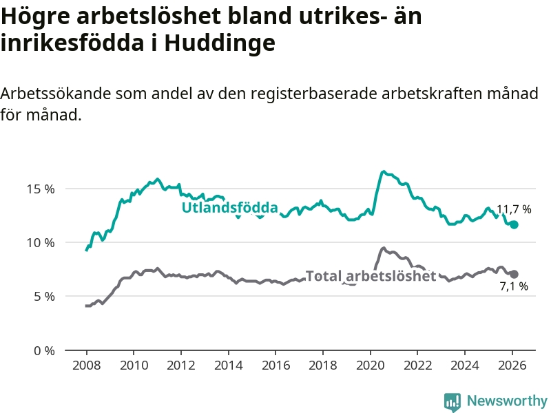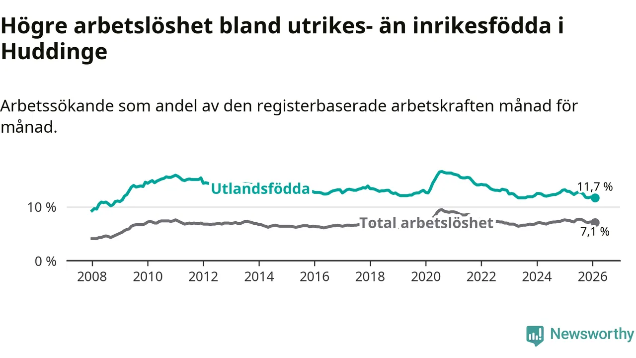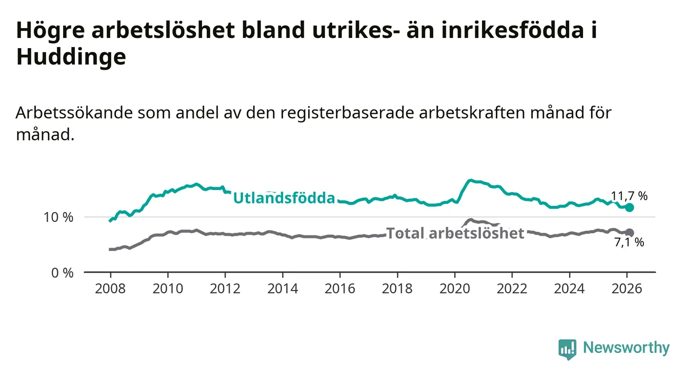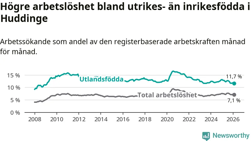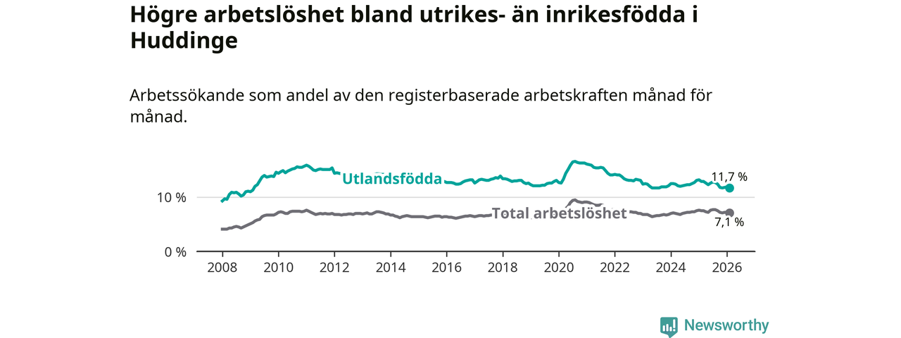 Arbetslösheten bland utlandsfödda var 11,7 procent i Huddinge under februari månad, motsvarande 2 610 av 22 308 personer. Det är 1,2 procentenheter färre än vid samma tidpunkt i fjol (−221 om man räknar personer).