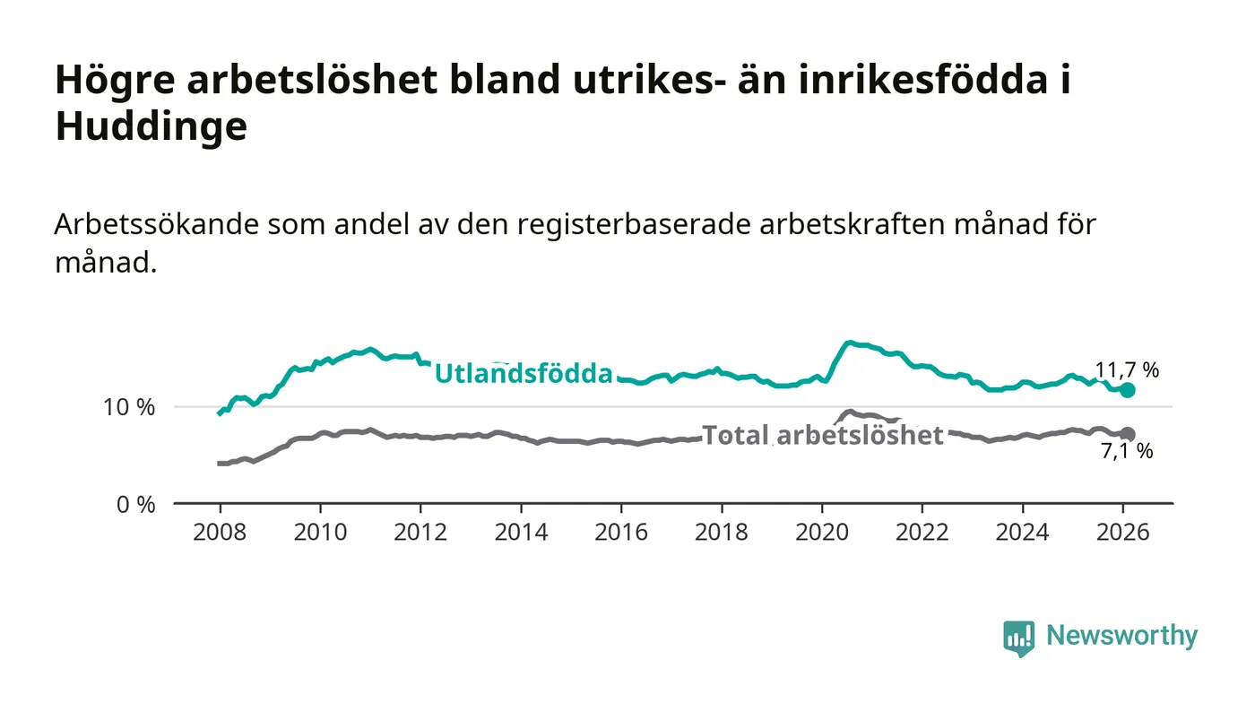 Skillnaden i arbetslöshet mellan utrikesfödda och hela befolkningen är 4,6 procentenheter i Huddinge. Det är en mindre skillnad än för ett år sedan (−0,8 procentenheter).