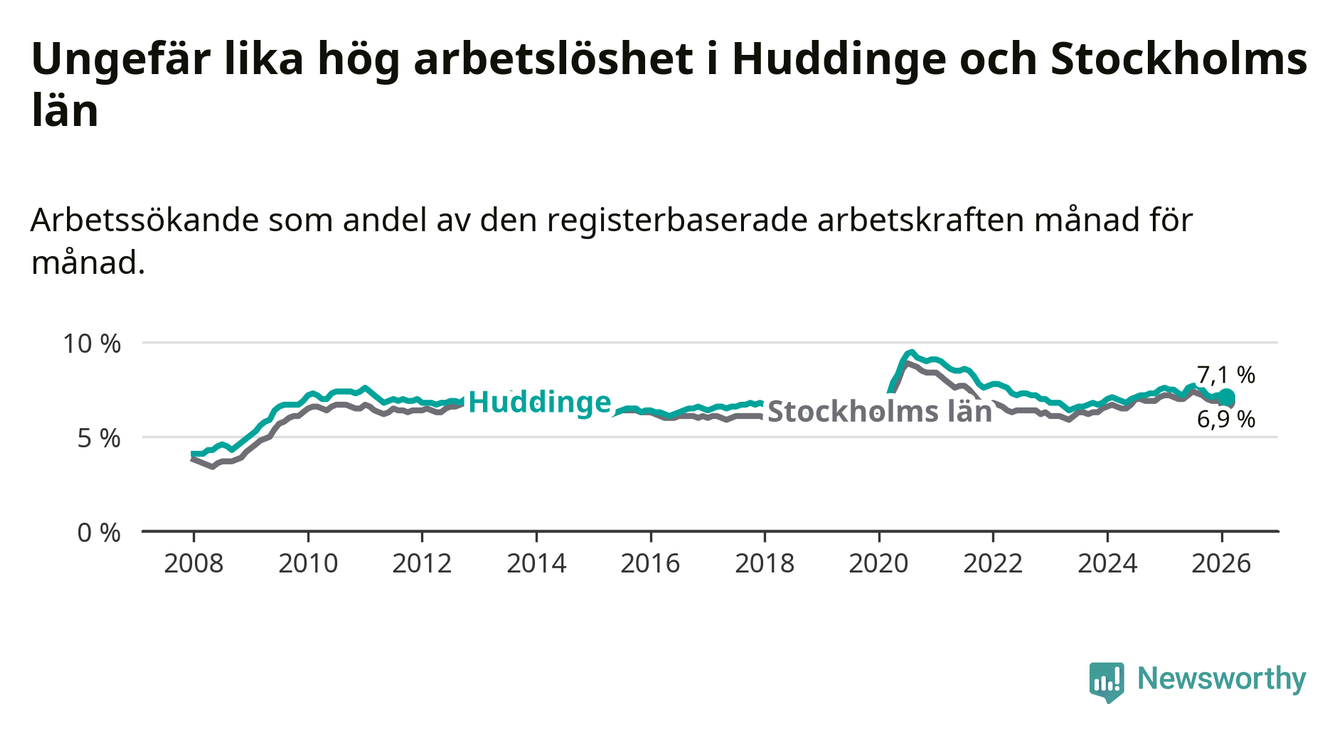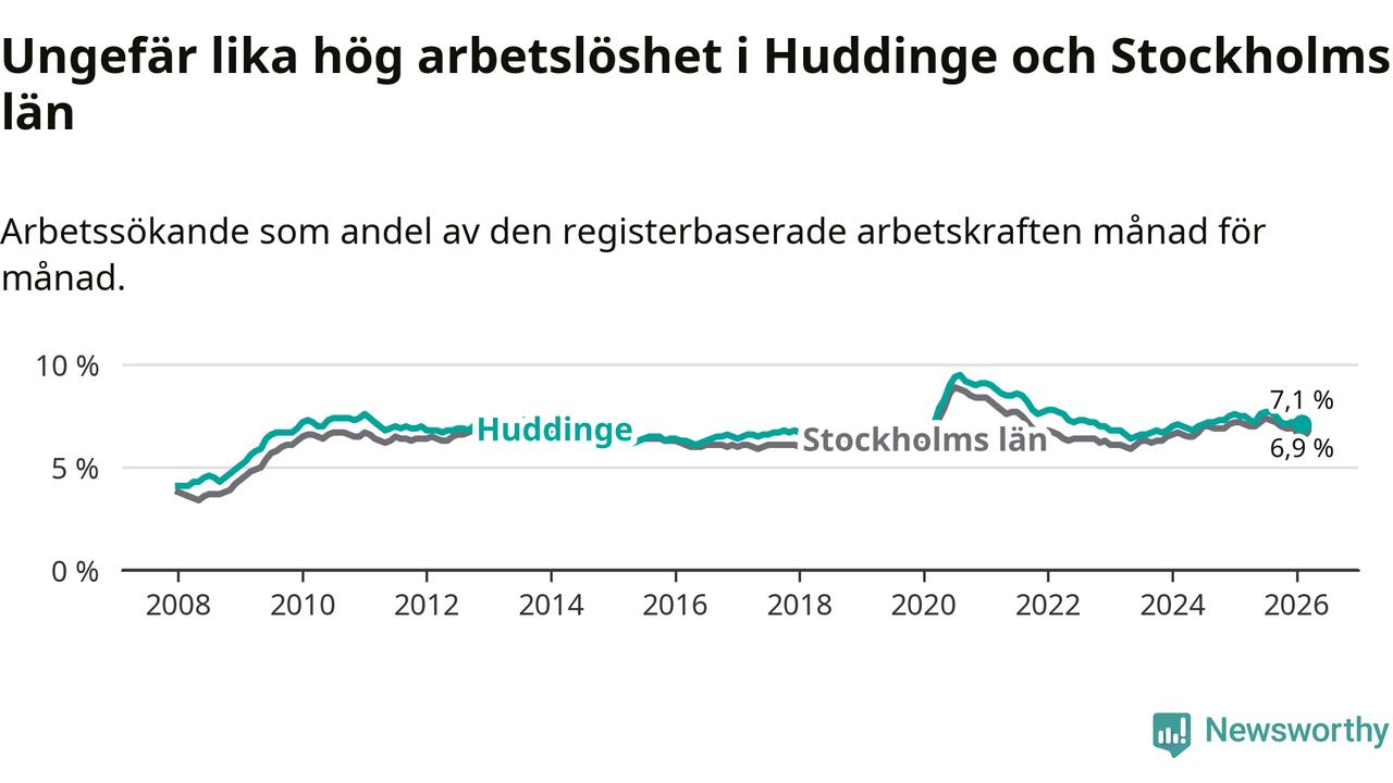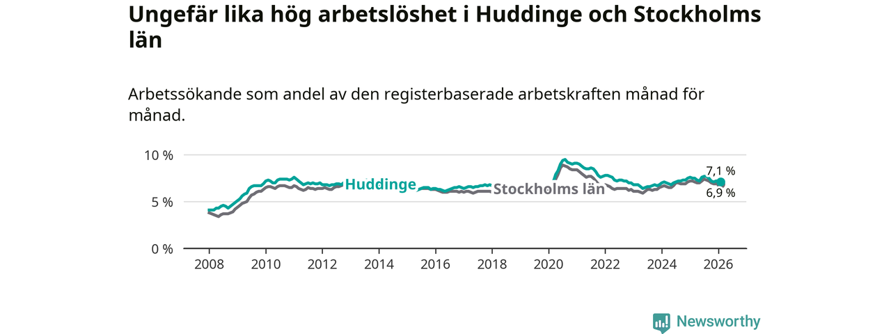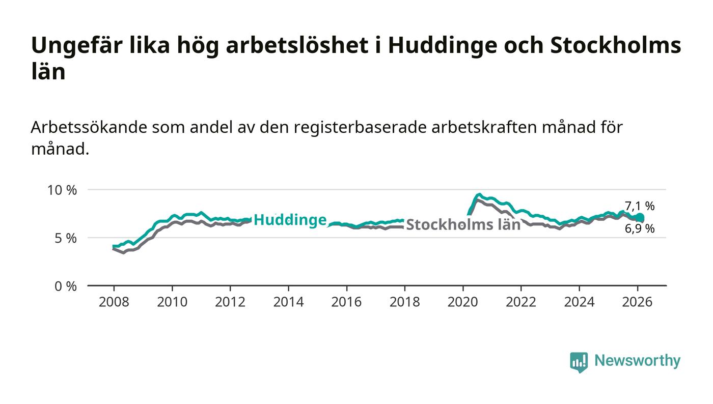 Under februari månad rapporterade Huddinge kommun en total arbetslöshet på 7,1 procent. Det är en minskning jämfört med samma tidpunkt i fjol (−0,4 procentenheter). Även i Stockholms län sjunker arbetslösheten .