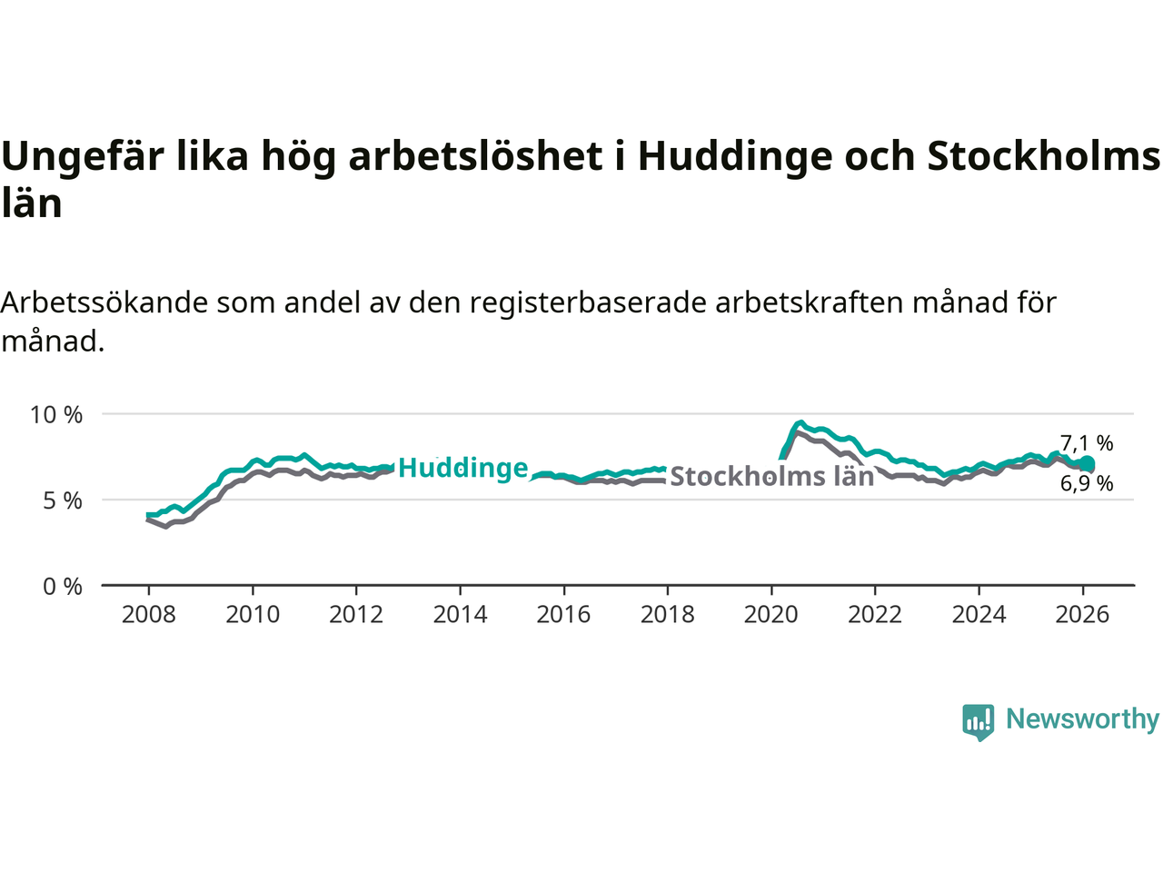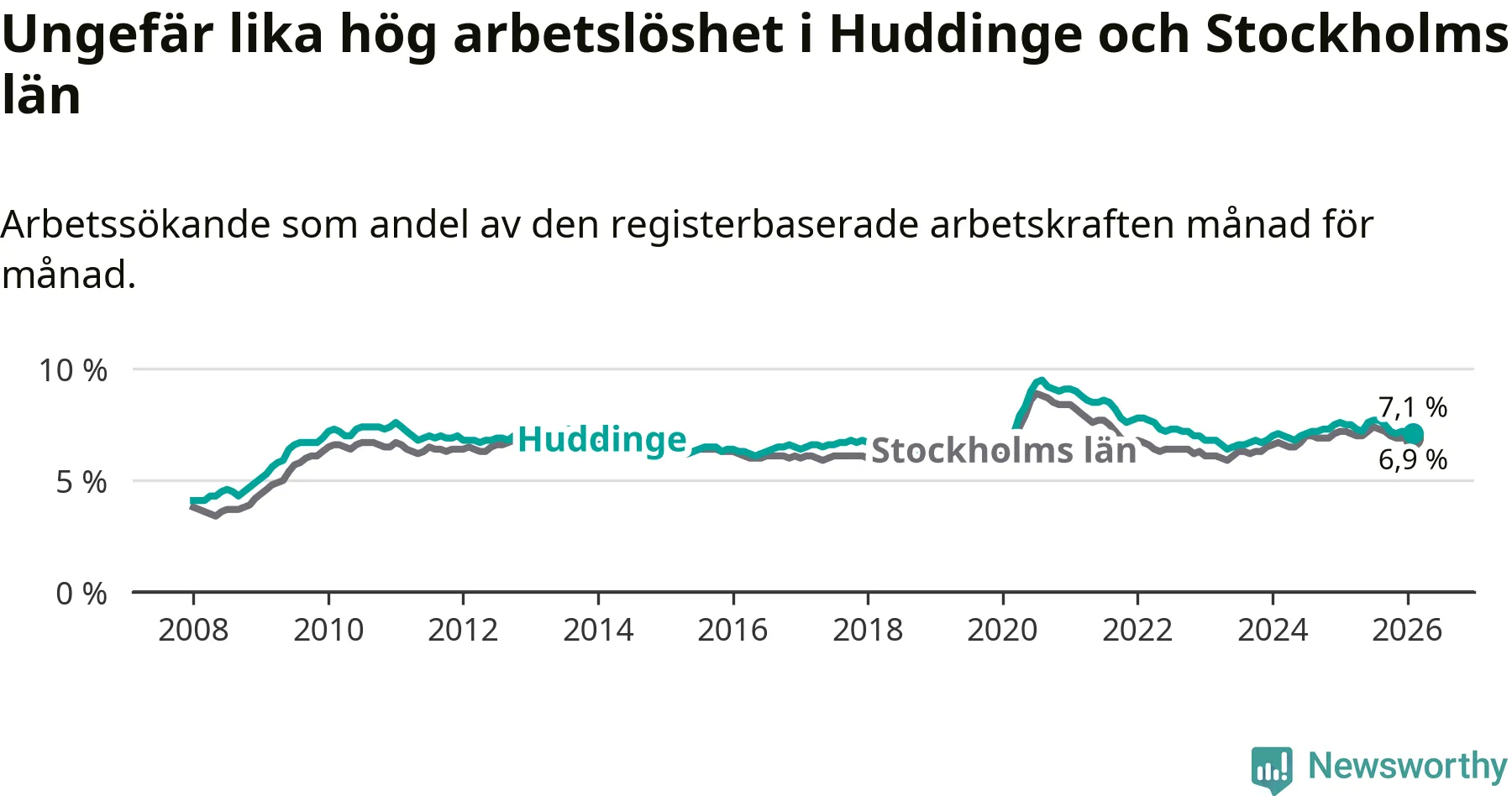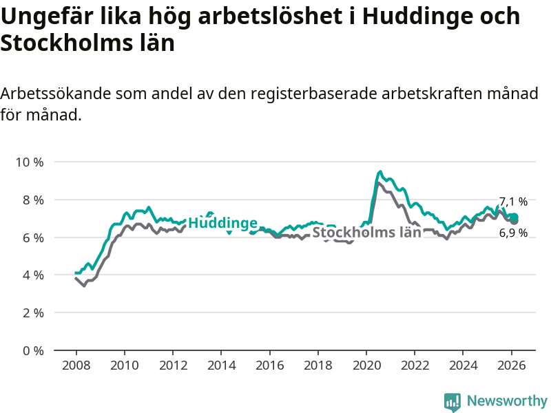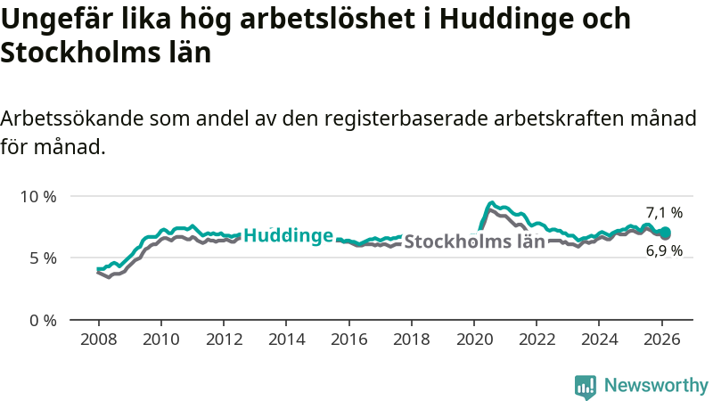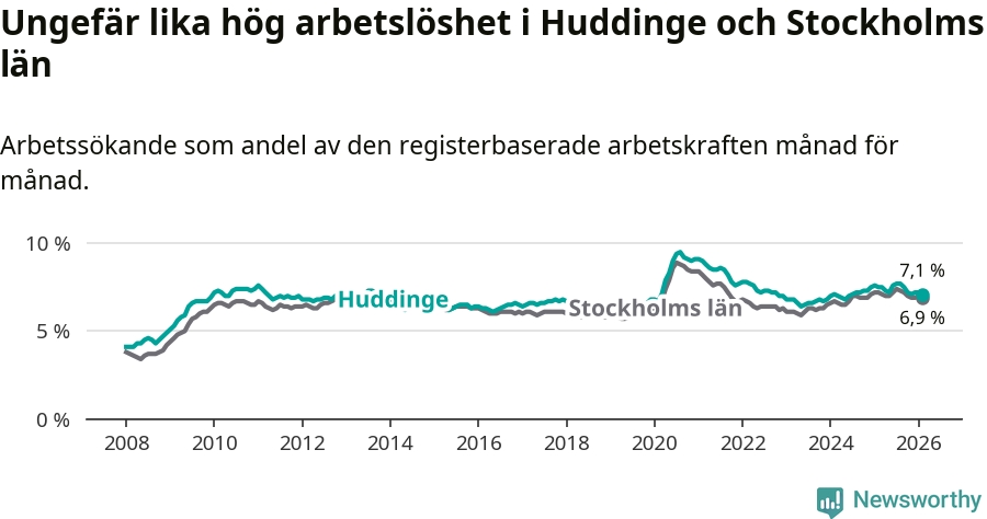 Under februari månad rapporterade Huddinge kommun en total arbetslöshet på 7,1 procent. Det är en minskning jämfört med samma tidpunkt i fjol (−0,4 procentenheter). Även i Stockholms län sjunker arbetslösheten .
