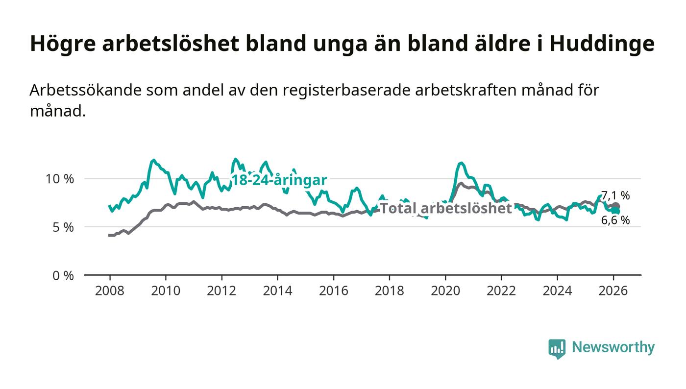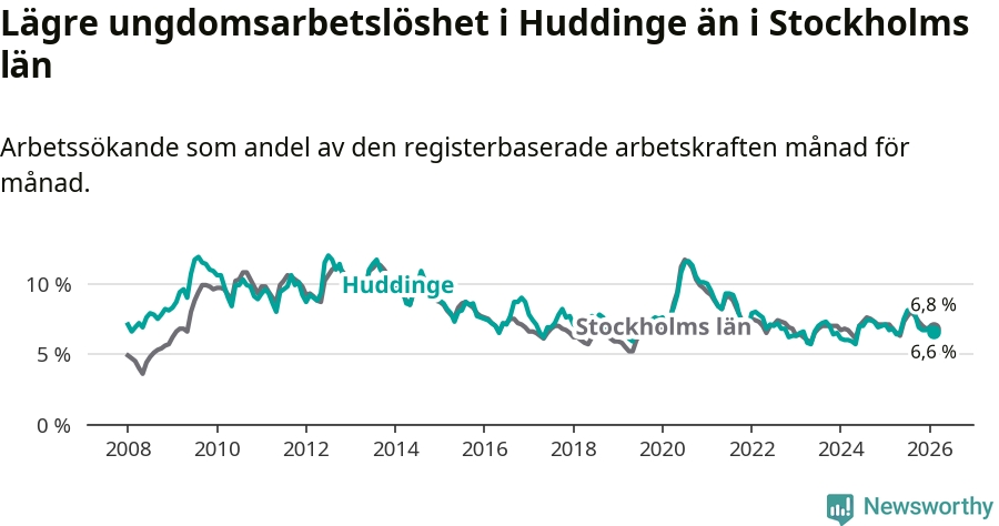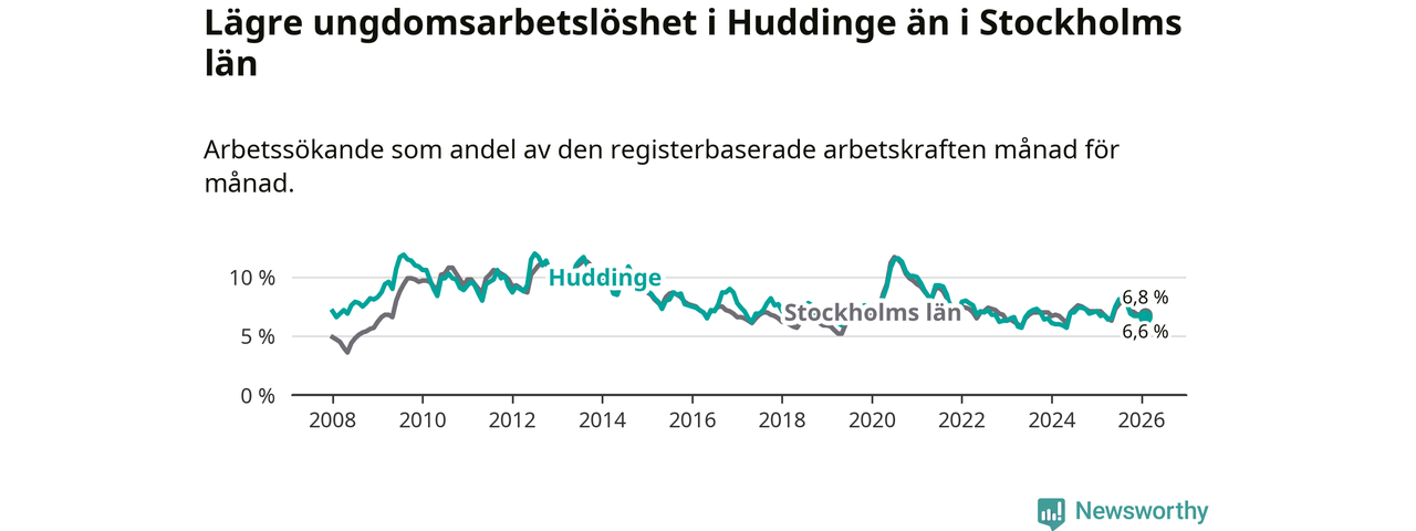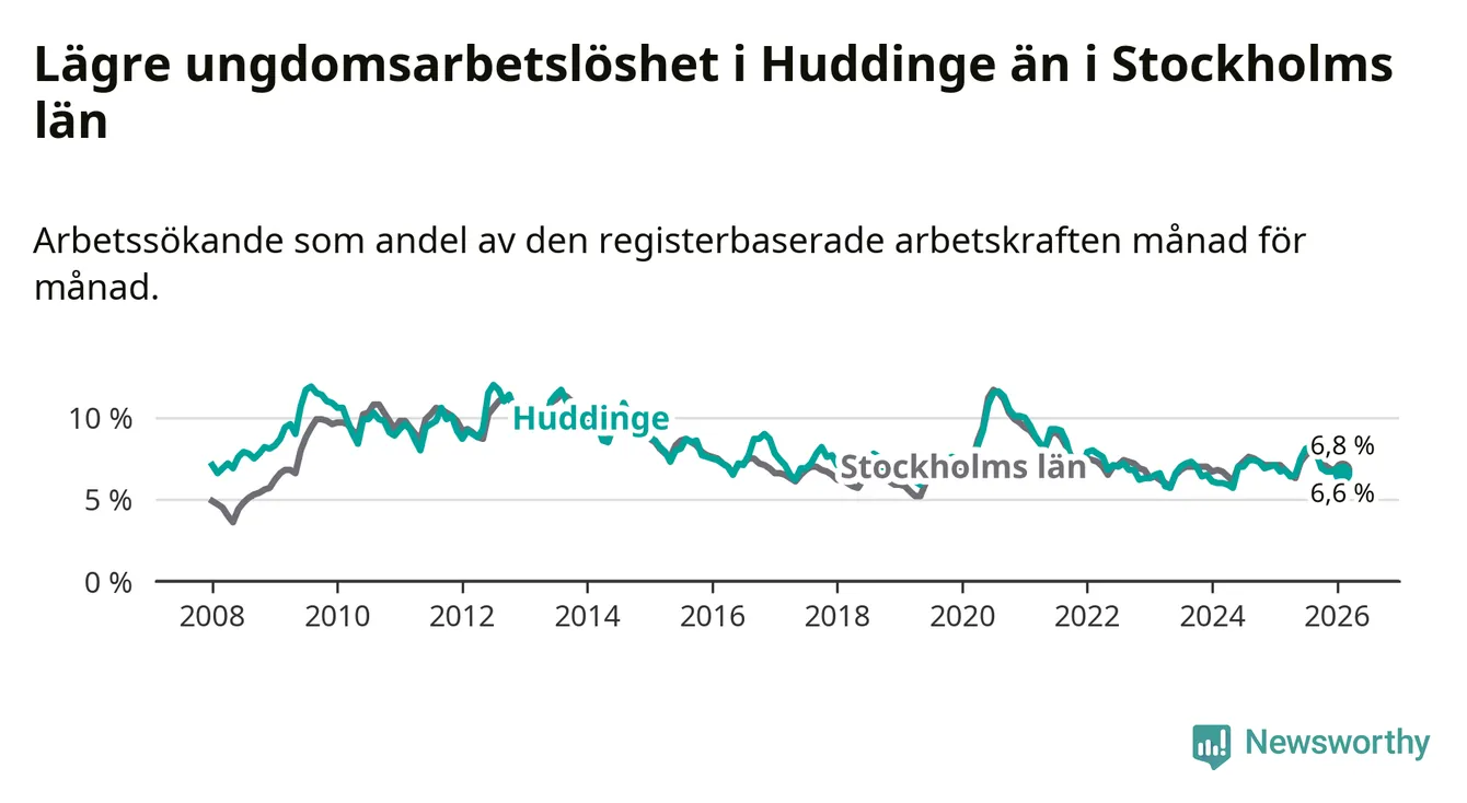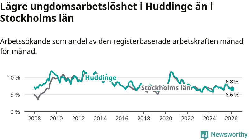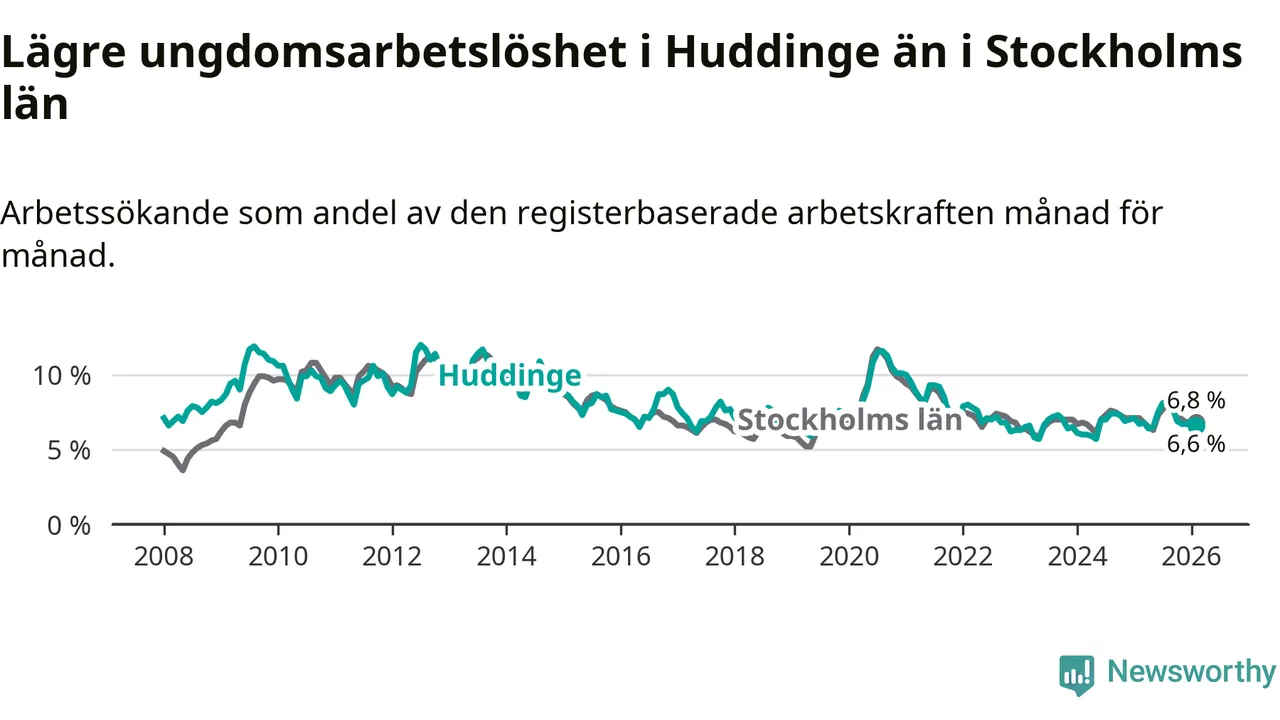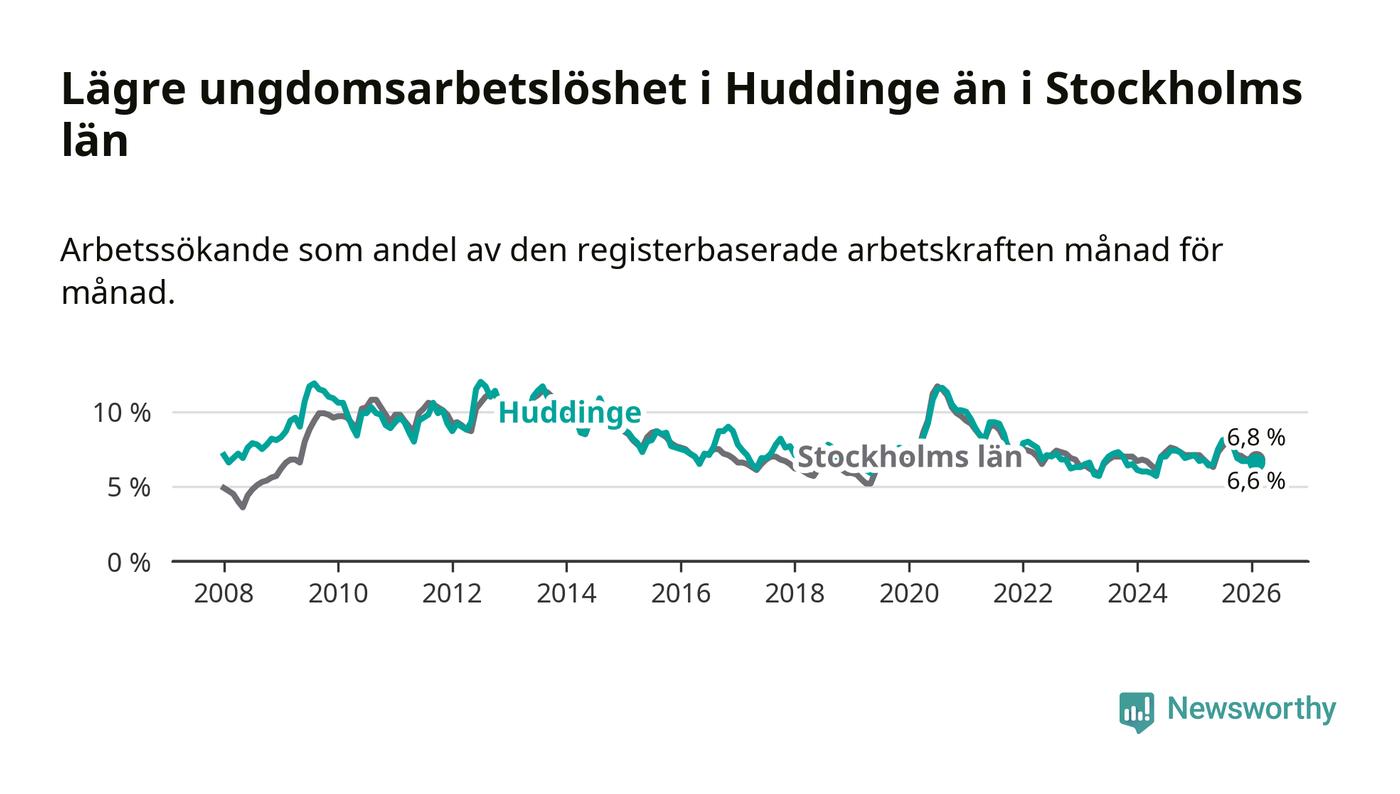 Medan Huddinge har ungefär samma total arbetslöshet som Stockholms län, ligger ungdomsarbetslösheten 0,2 procentenheter lägre i Huddinge.