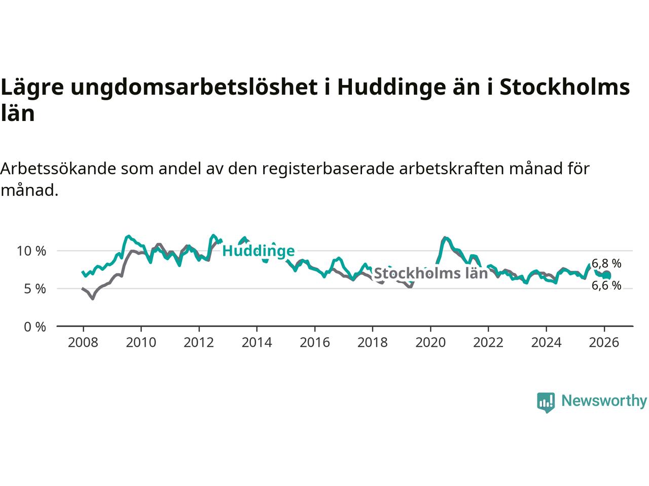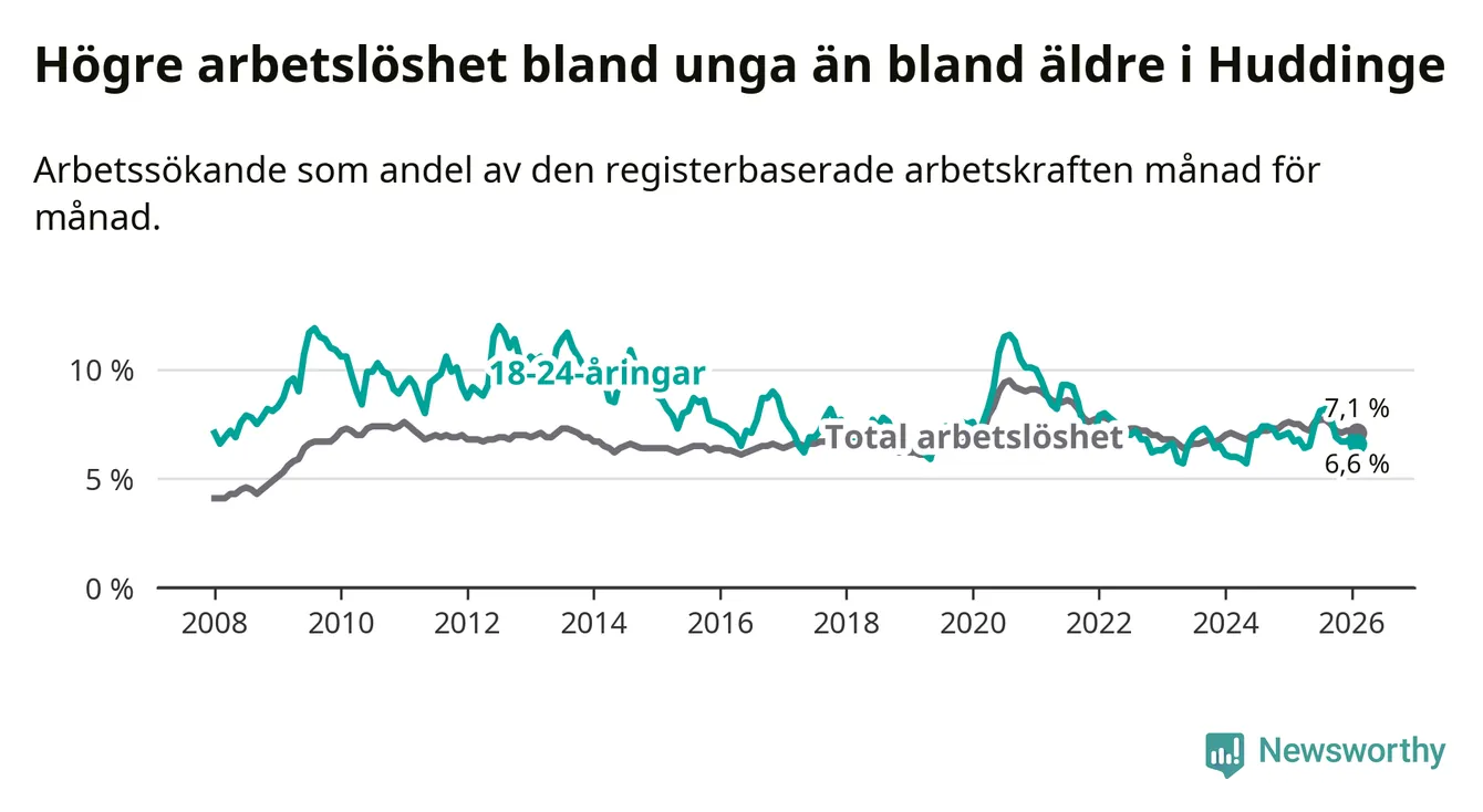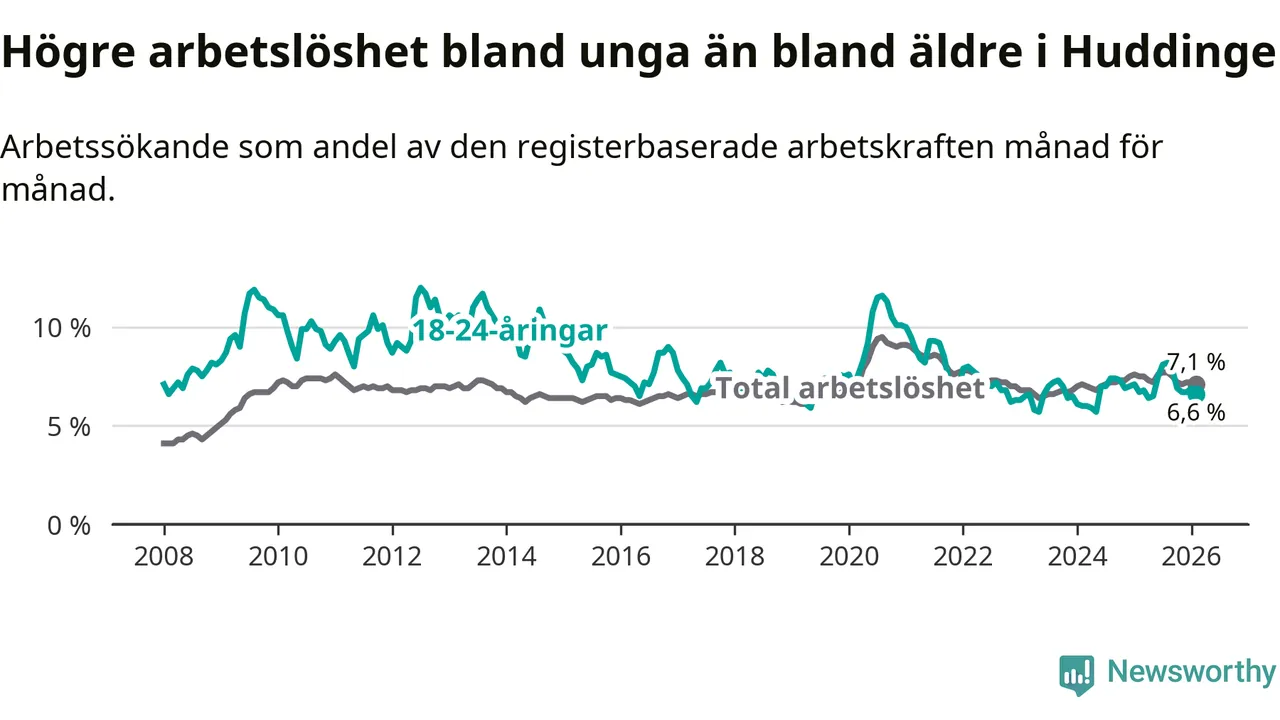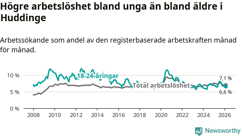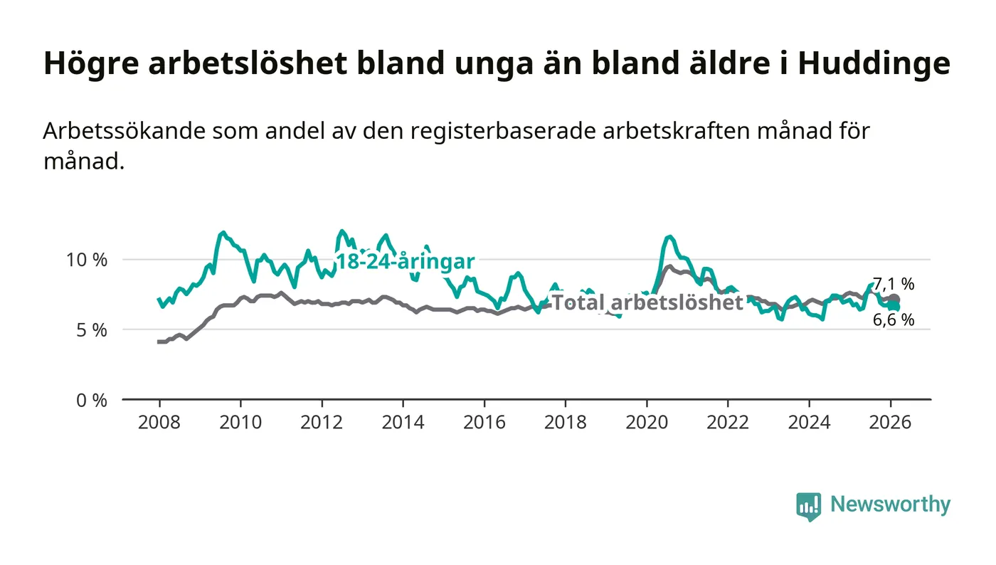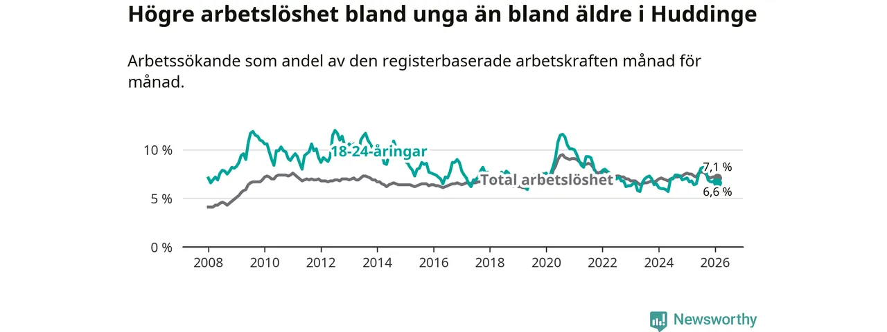 Medan Huddinge har ungefär samma total arbetslöshet som Stockholms län, ligger ungdomsarbetslösheten 0,2 procentenheter lägre i Huddinge.
