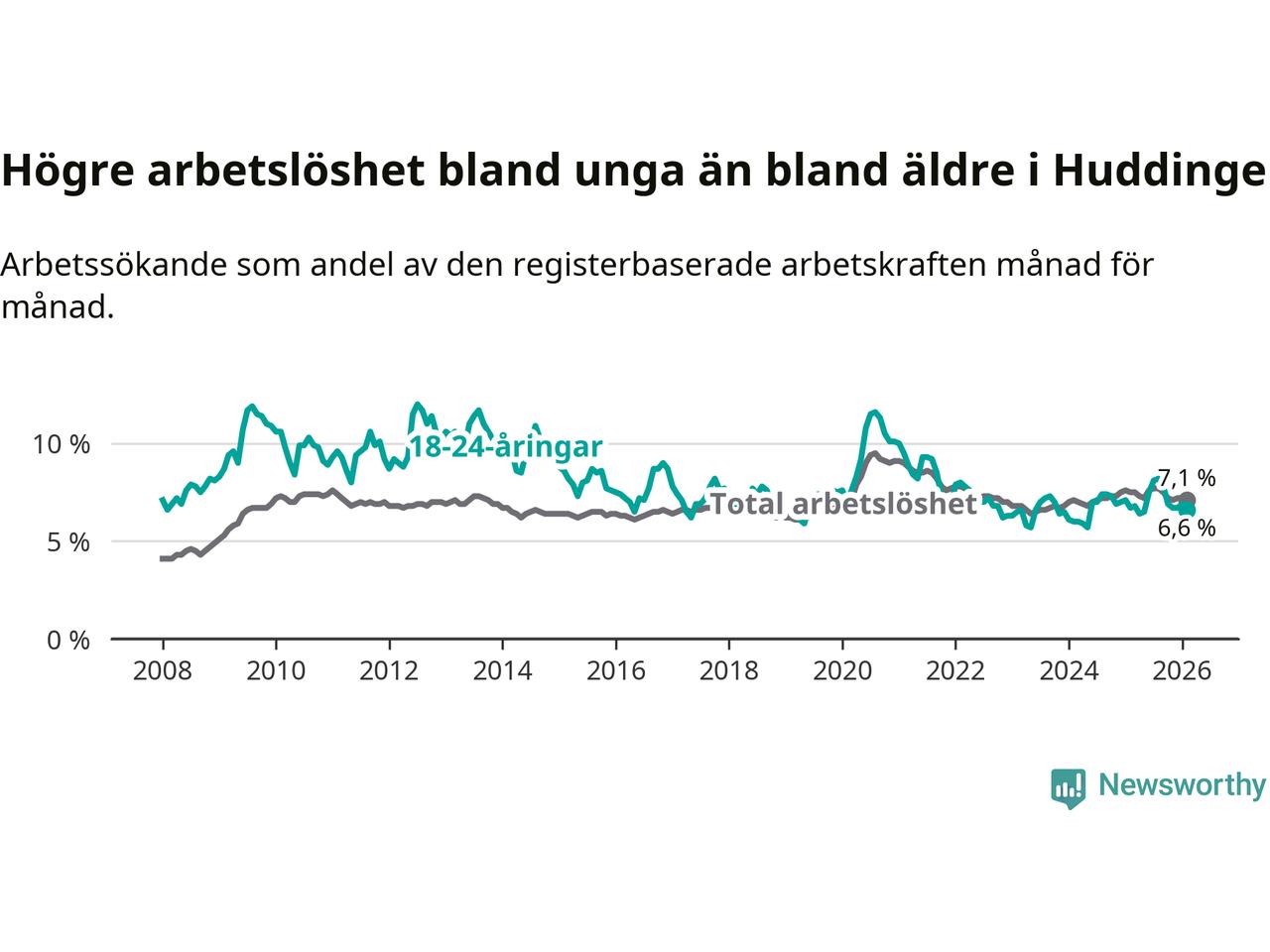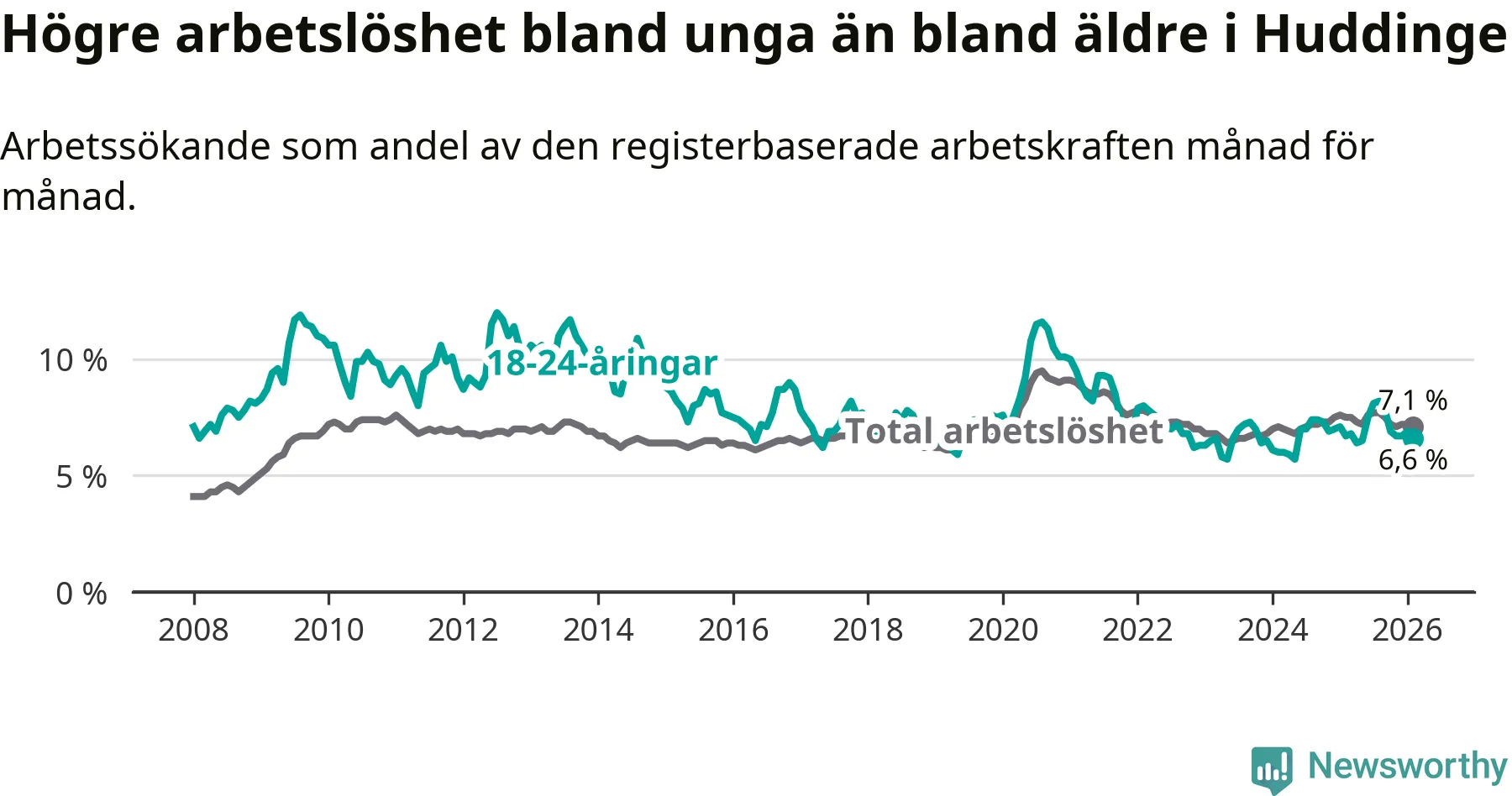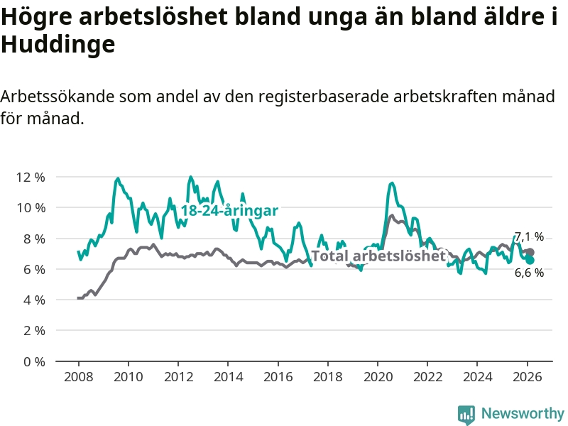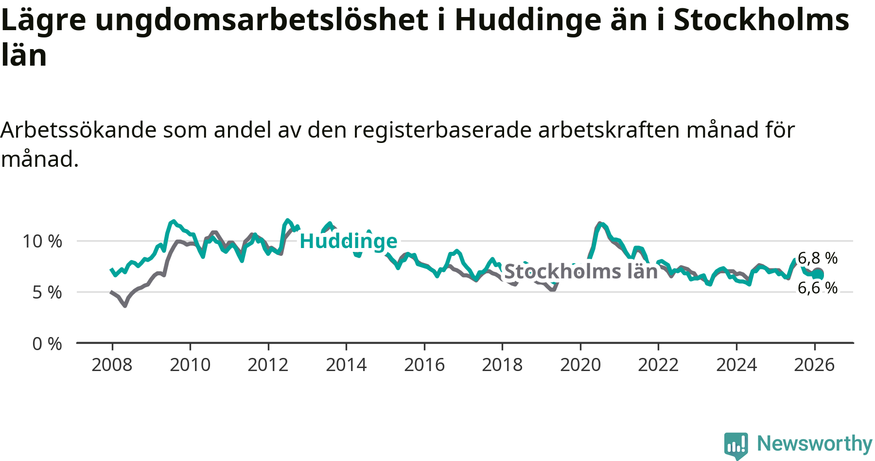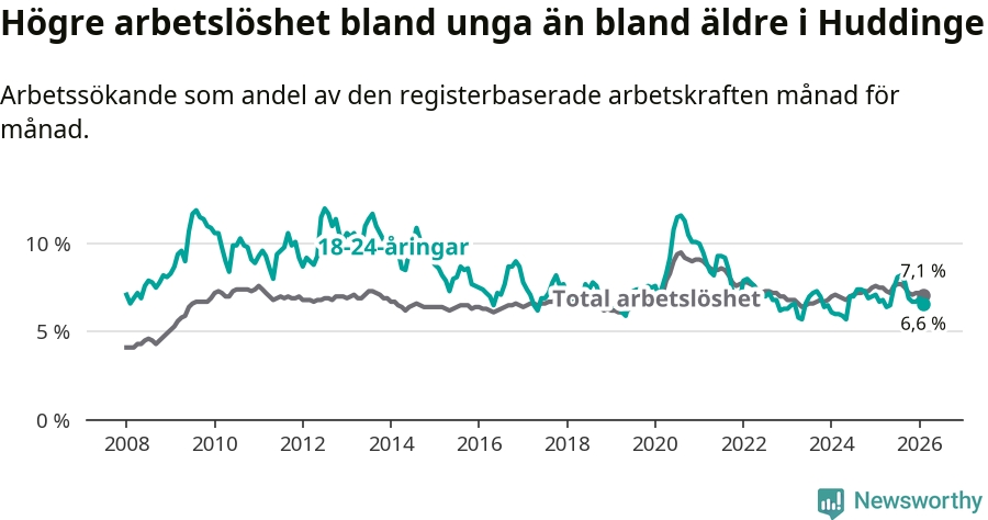 Medan Huddinge har ungefär samma total arbetslöshet som Stockholms län, ligger ungdomsarbetslösheten 0,2 procentenheter lägre i Huddinge.