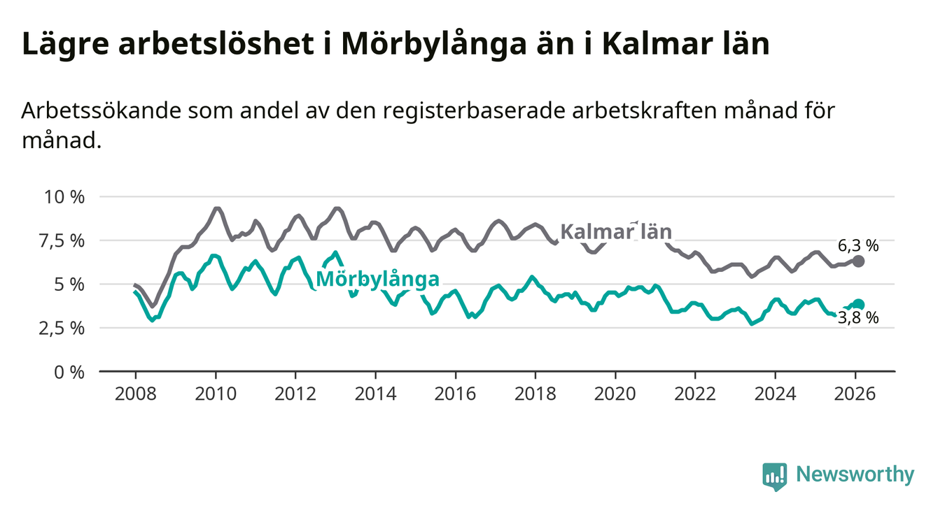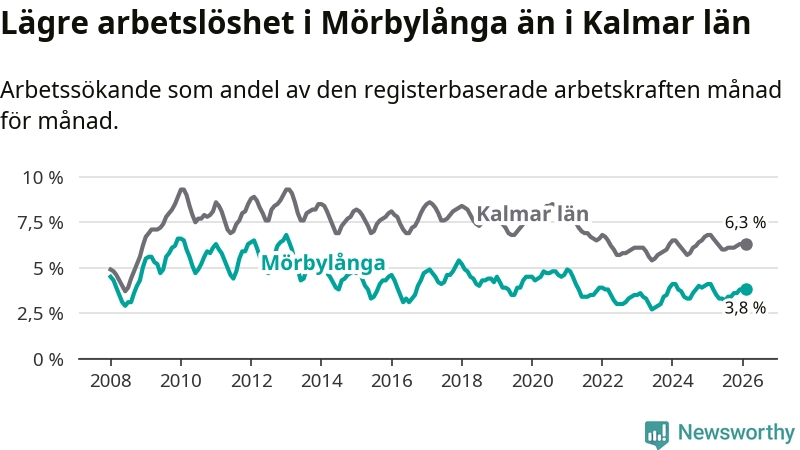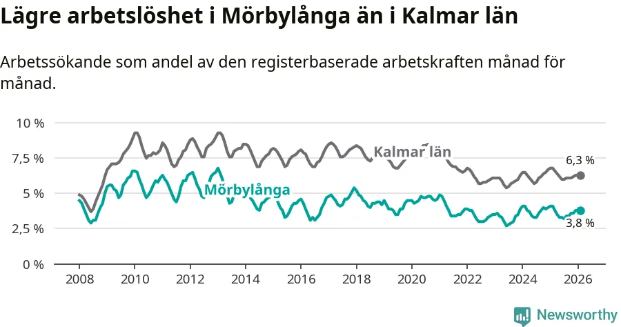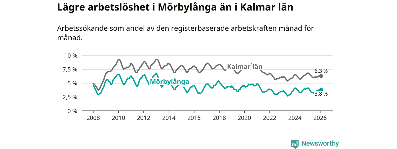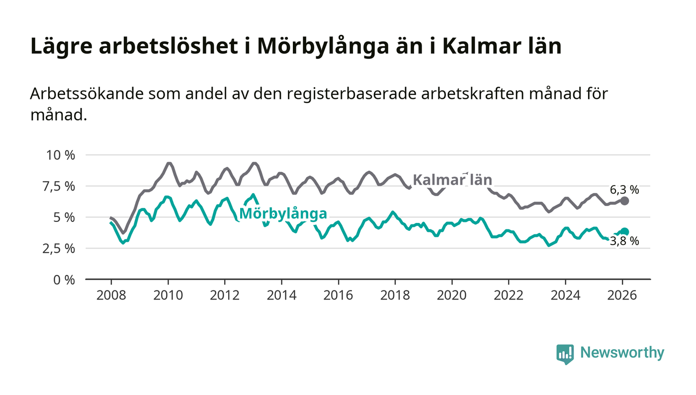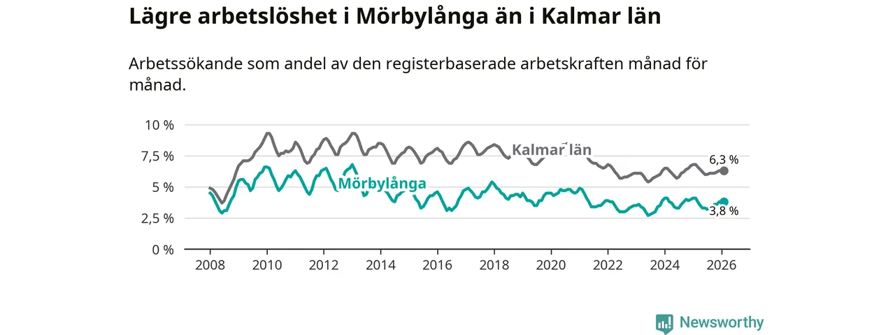Under februari månad rapporterade Mörbylånga kommun en total arbetslöshet på 3,8 procent. Det är en minskning jämfört med samma tidpunkt i fjol (−0,3 procentenheter). Även i Kalmar län sjunker arbetslösheten .
