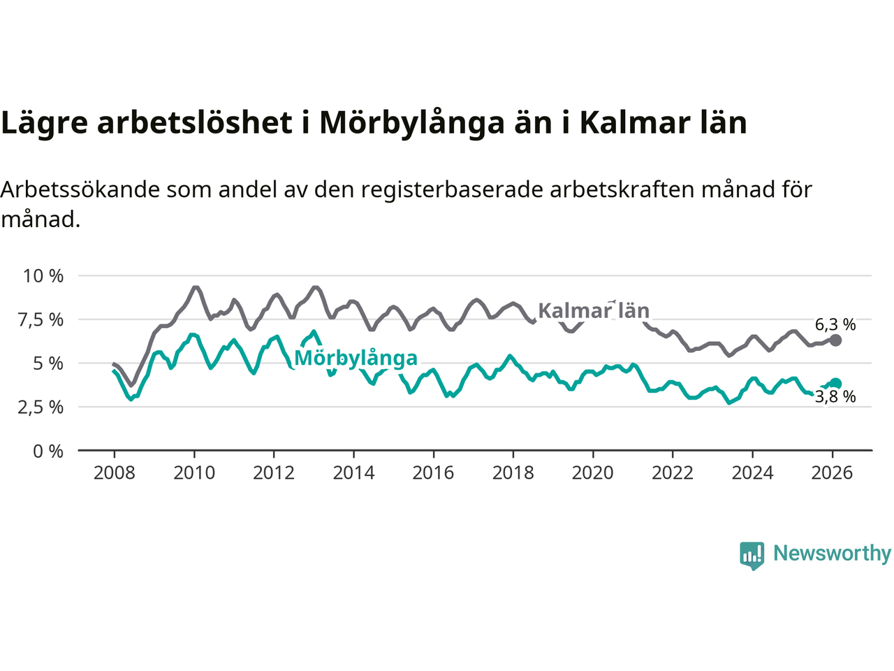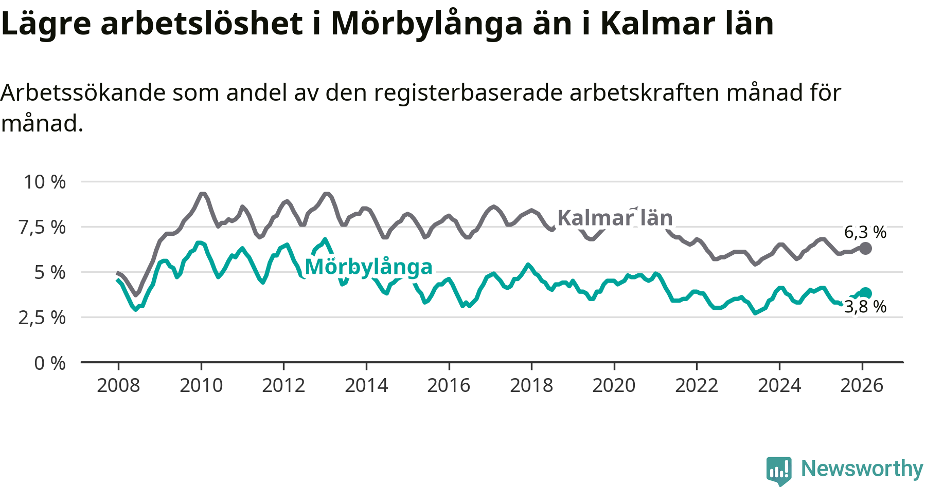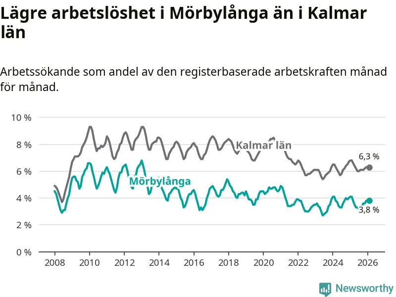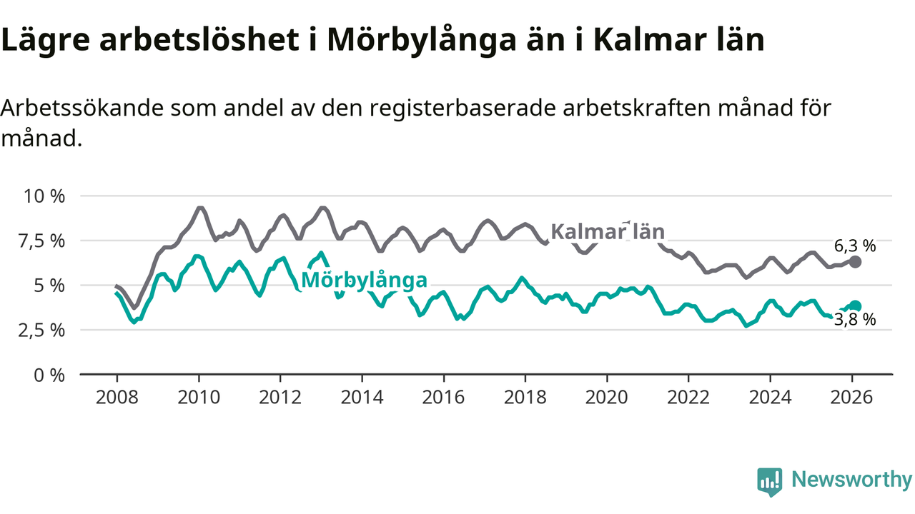 Under februari månad rapporterade Mörbylånga kommun en total arbetslöshet på 3,8 procent. Det är en minskning jämfört med samma tidpunkt i fjol (−0,3 procentenheter). Även i Kalmar län sjunker arbetslösheten .