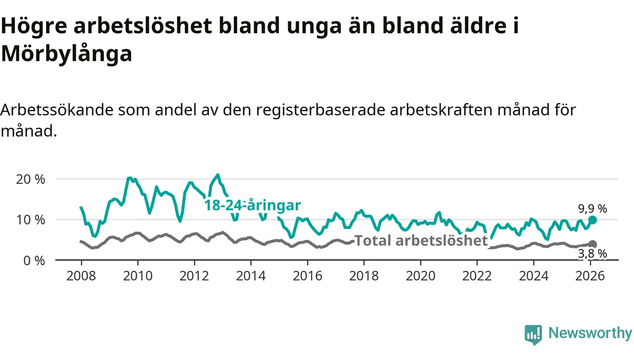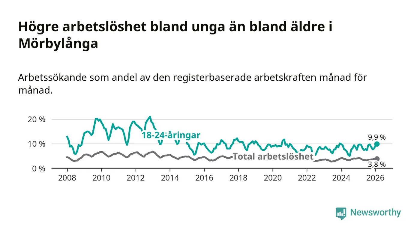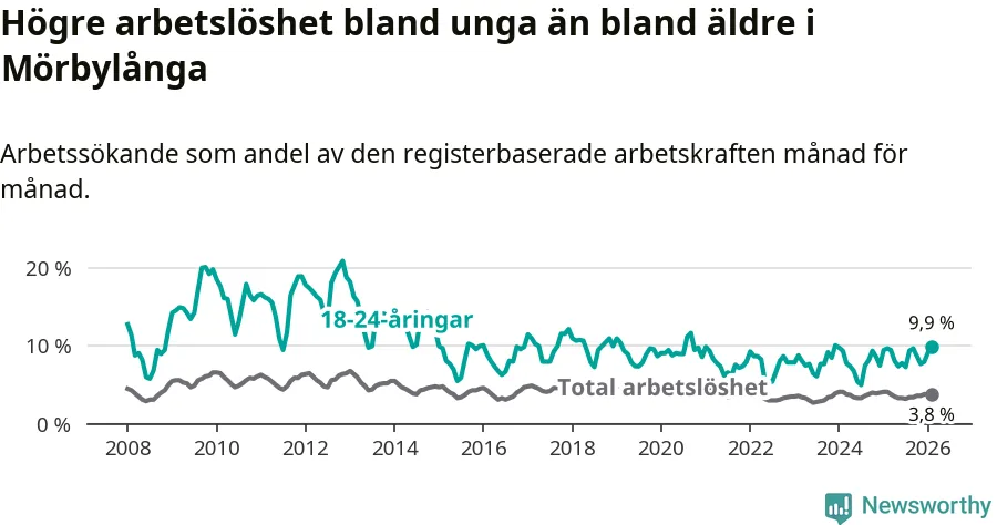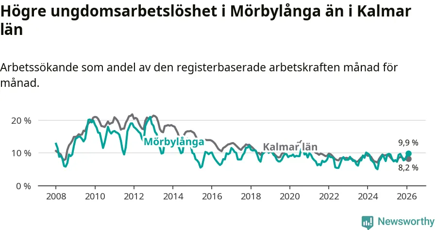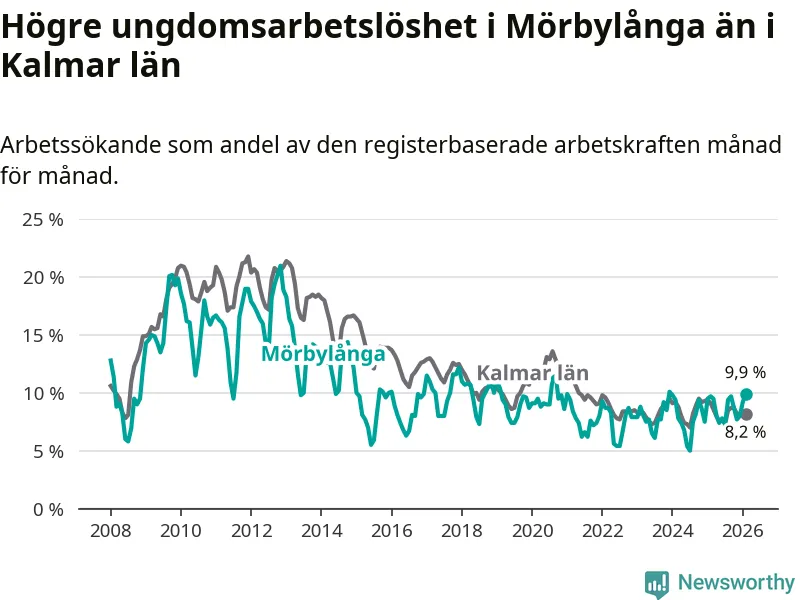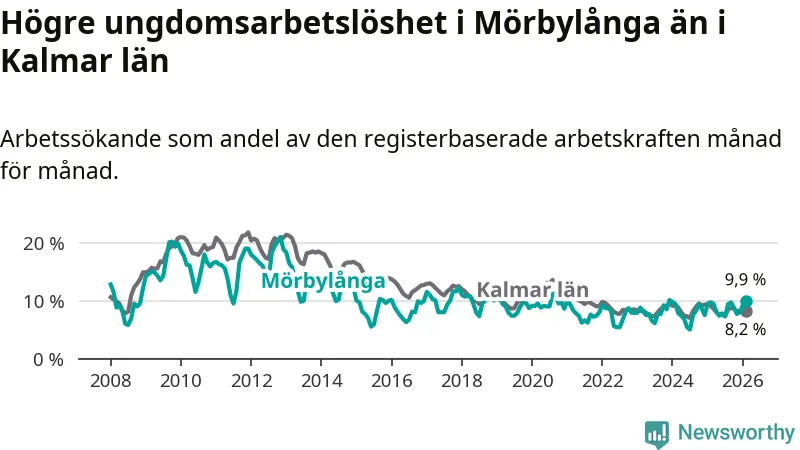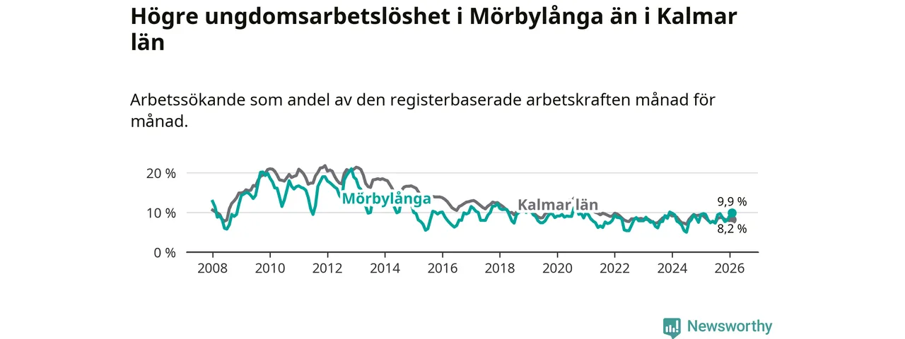 Medan Mörbylånga har lägre total arbetslöshet än Kalmar län, ligger ungdomsarbetslösheten 1,7 procentenheter högre i Mörbylånga.