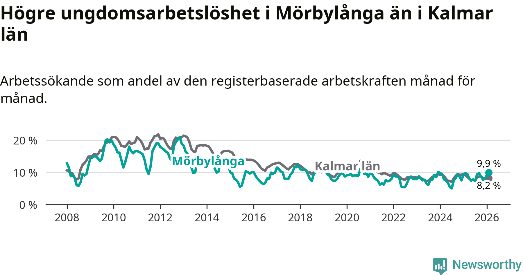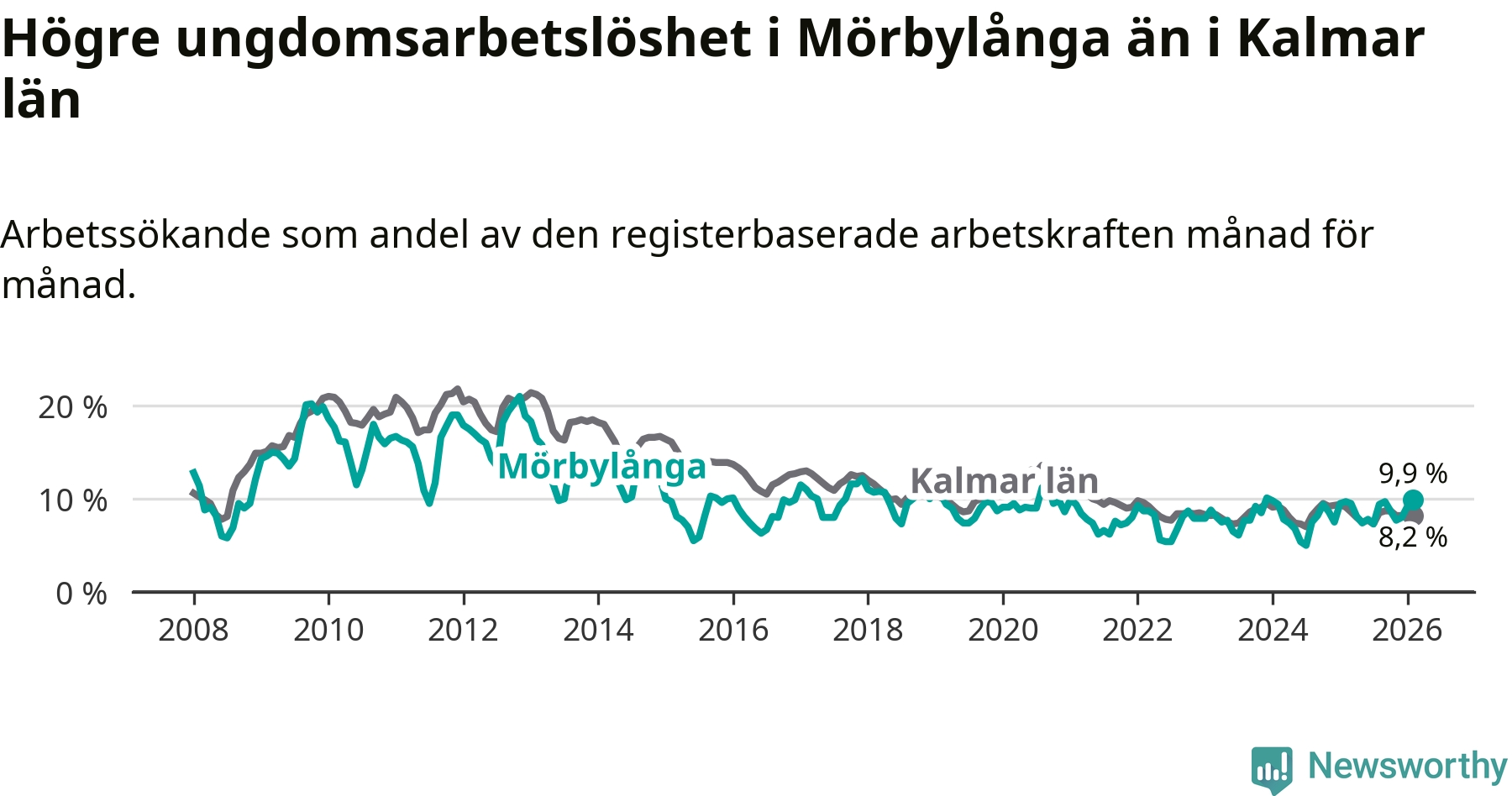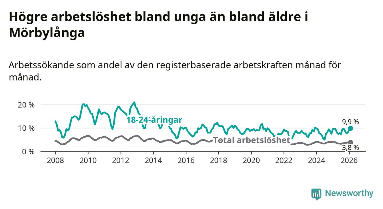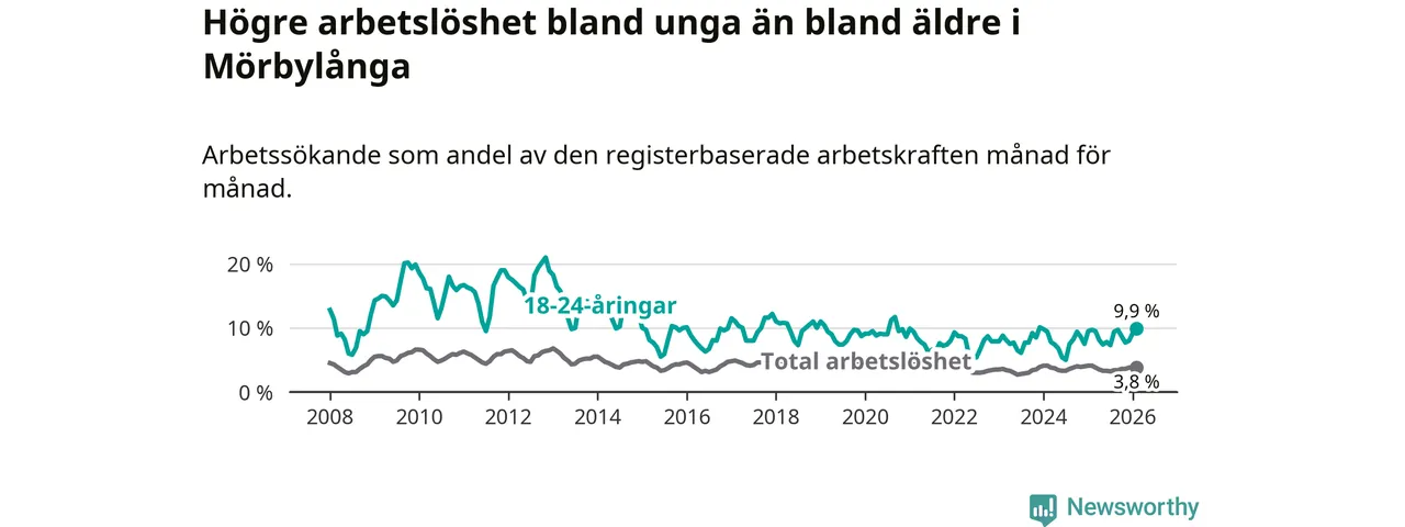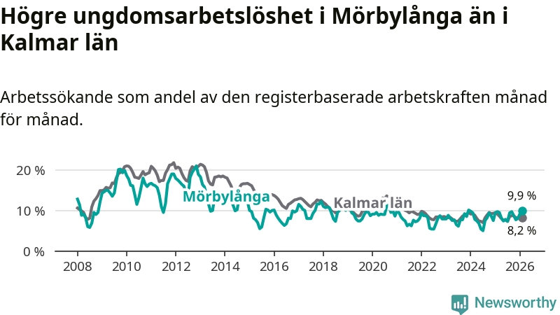 Medan Mörbylånga har lägre total arbetslöshet än Kalmar län, ligger ungdomsarbetslösheten 1,7 procentenheter högre i Mörbylånga.