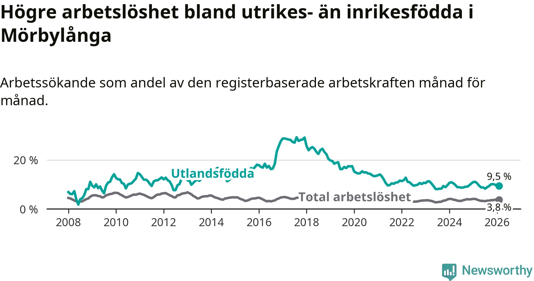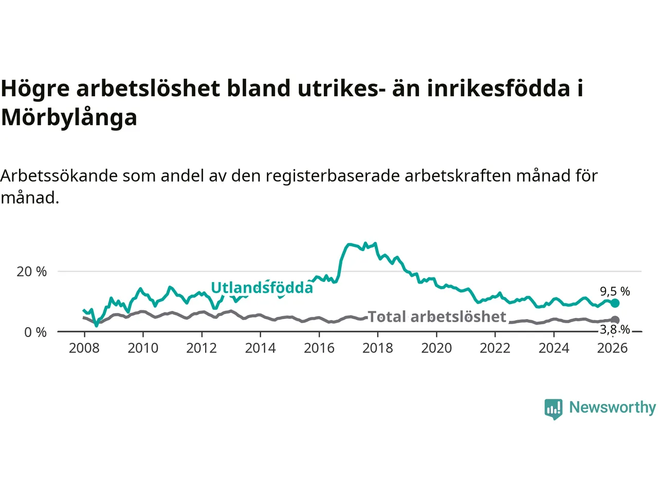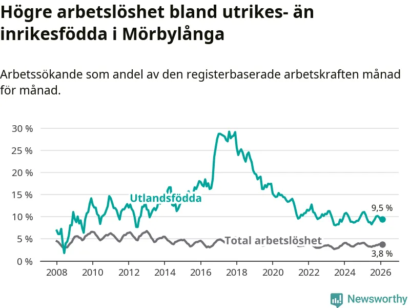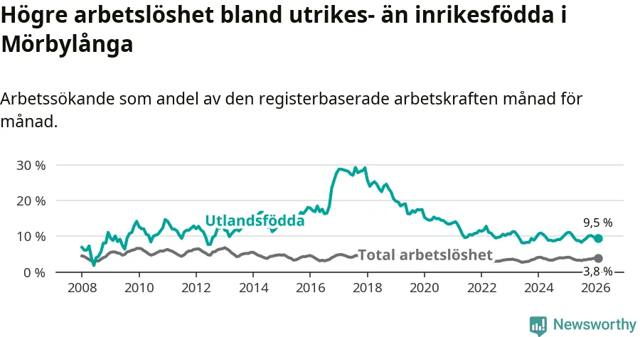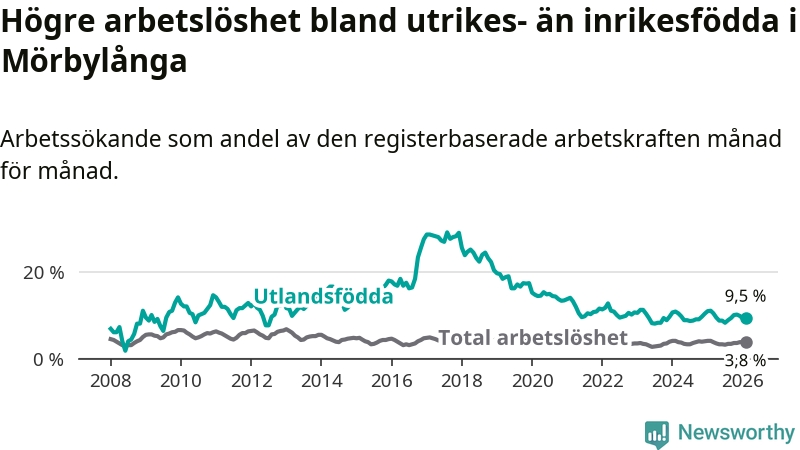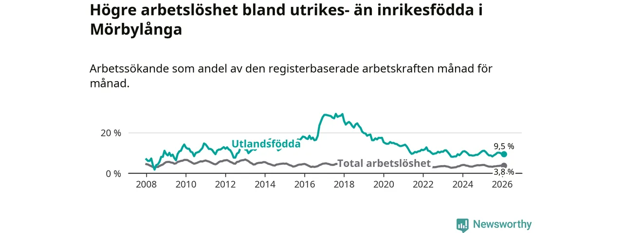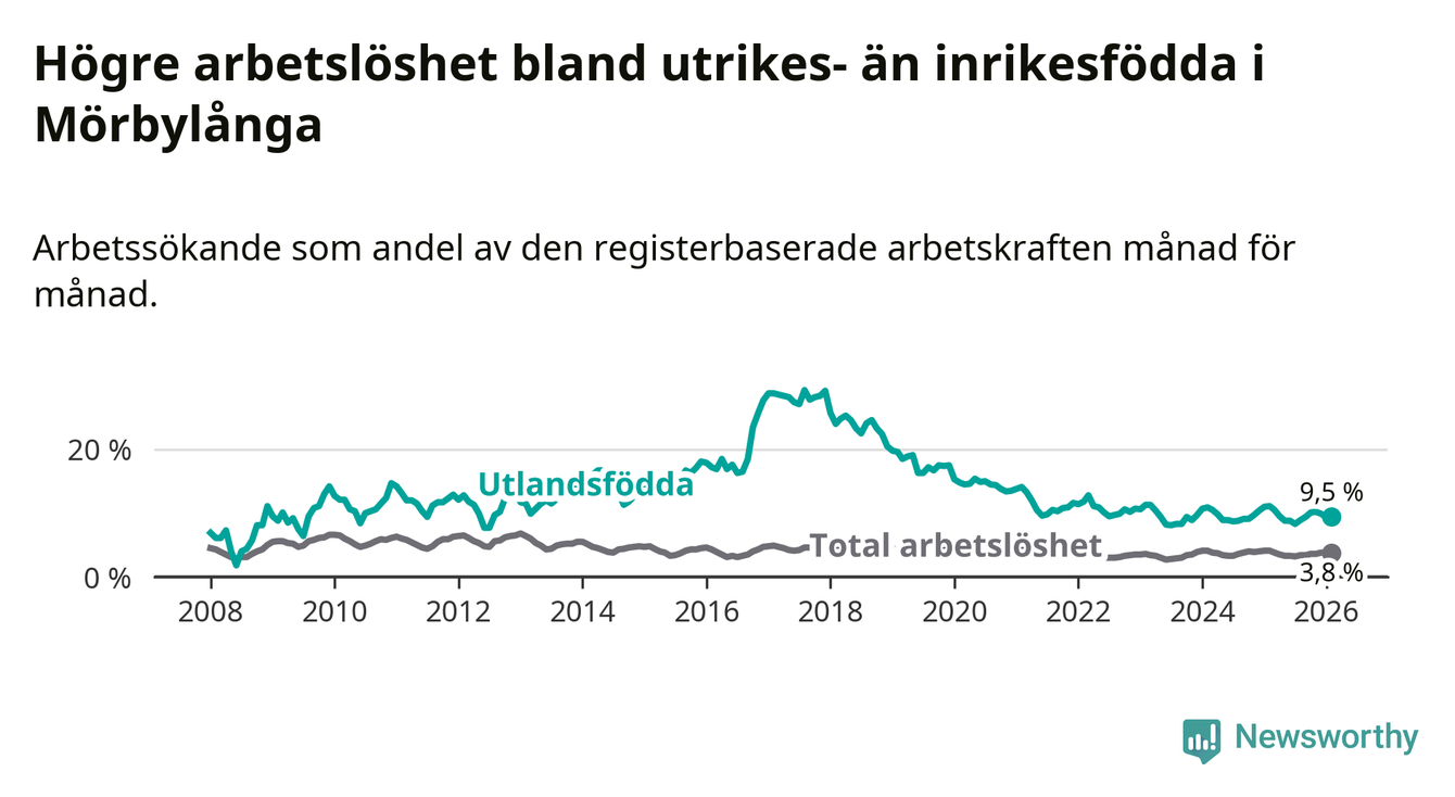 Arbetslösheten bland utlandsfödda var 9,5 procent i Mörbylånga under februari månad, motsvarande 74 av 779 personer. Det är 1,6 procentenheter färre än vid samma tidpunkt i fjol (−10 om man räknar personer).