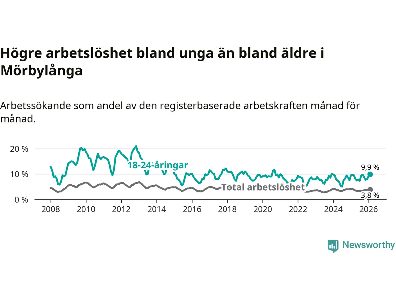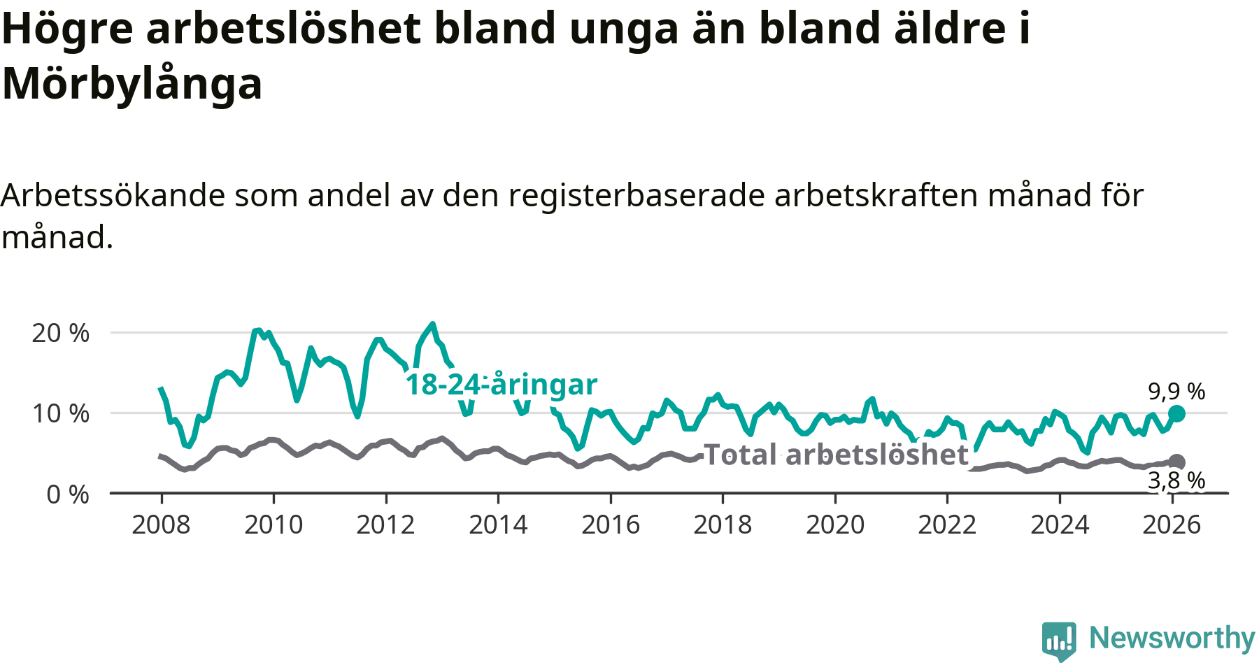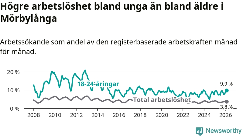 Till skillnad från den totala arbetslösheten stiger arbetslösheten bland unga (+0,2 procentenheter). I februari var 9,9 procent av 18–24-åringarna inskrivna som arbetssökande (motsvarande 54 personer). Mäter vi antalet inskrivna ser vi en ökning med fem personer på ett års sikt.