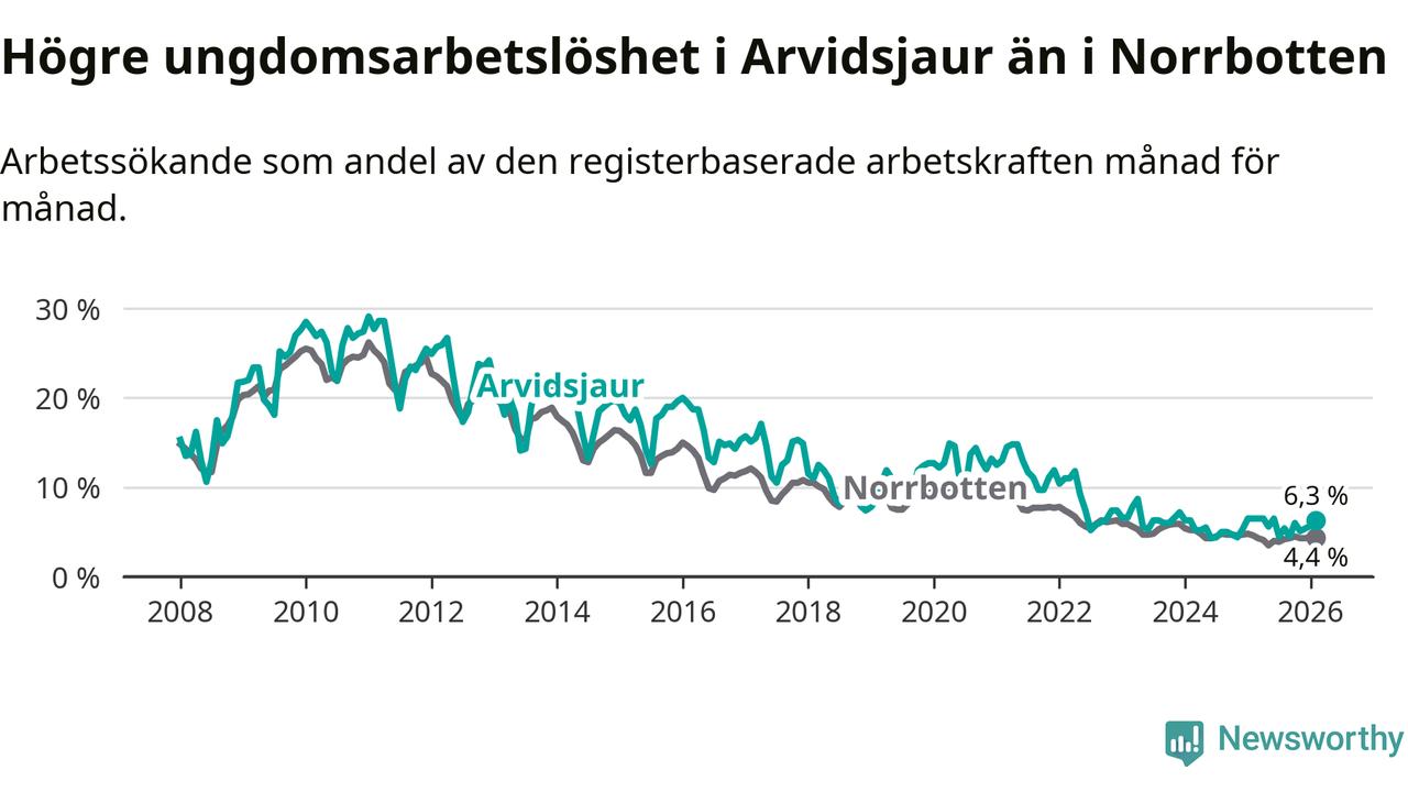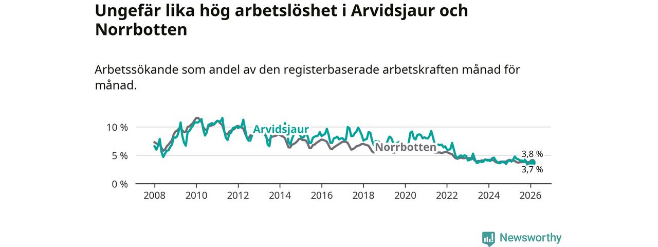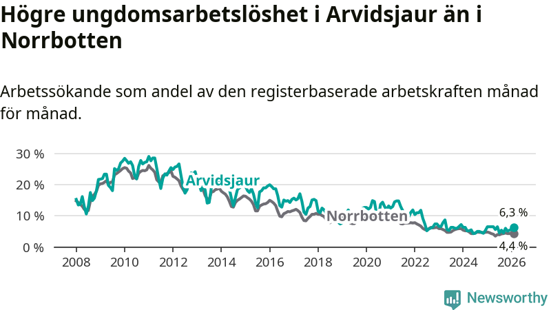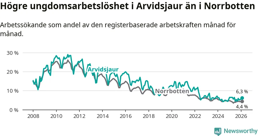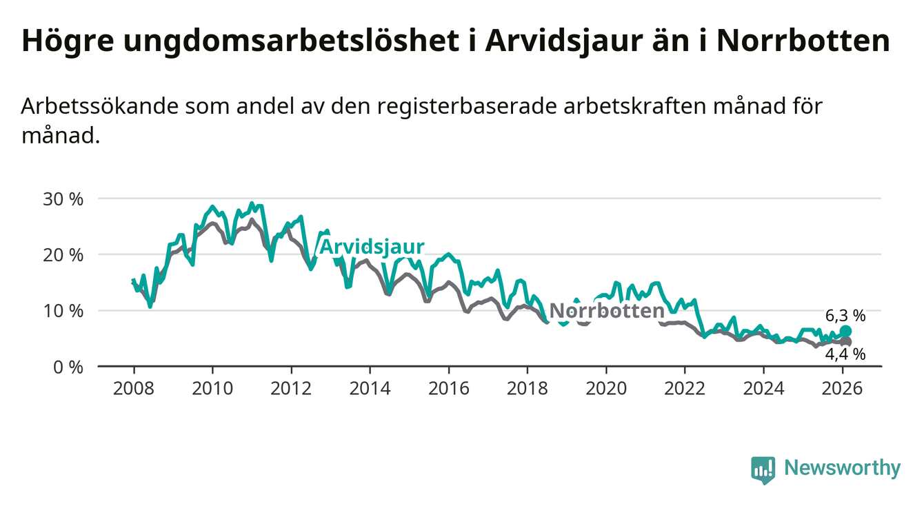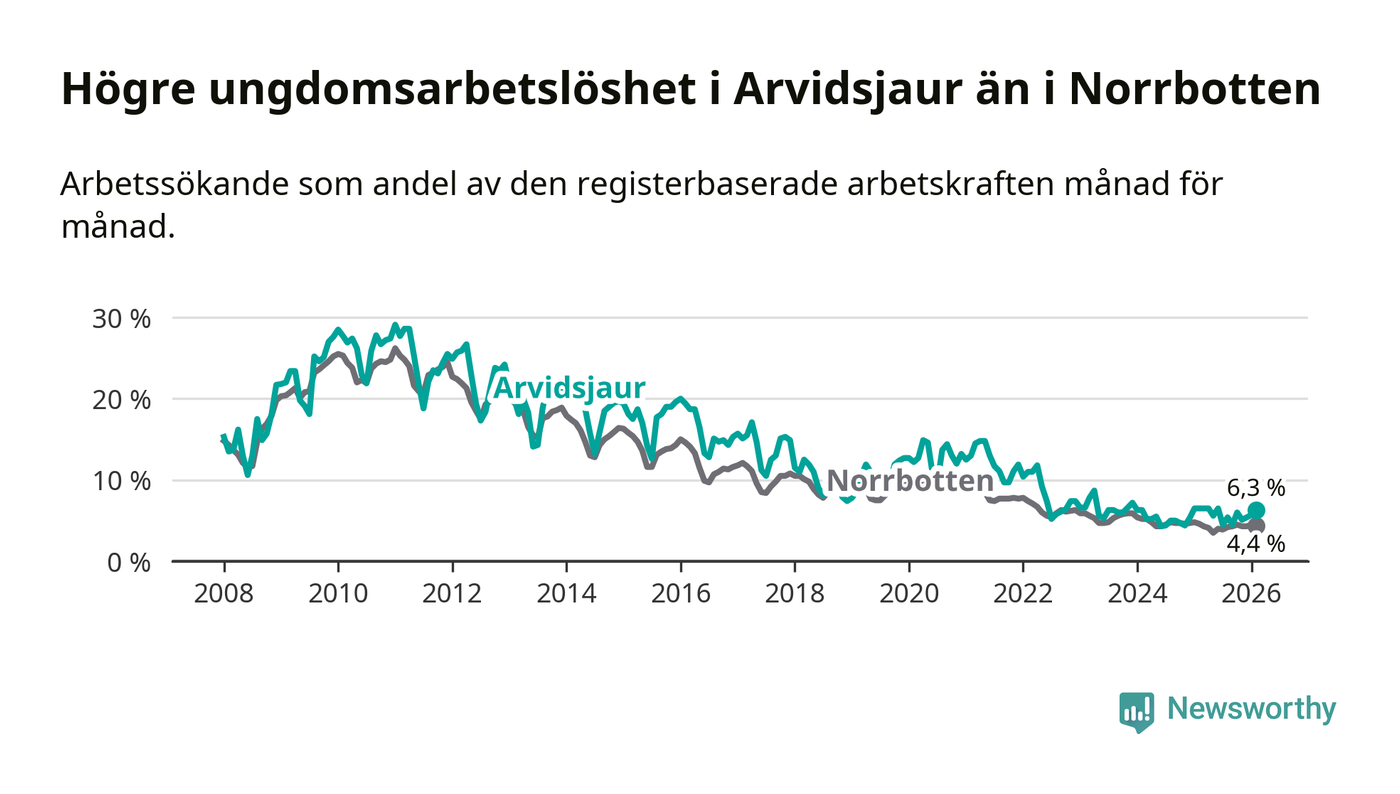 Medan Arvidsjaur har ungefär samma total arbetslöshet som Norrbotten, ligger ungdomsarbetslösheten 1,9 procentenheter högre i Arvidsjaur.