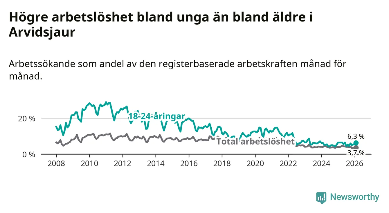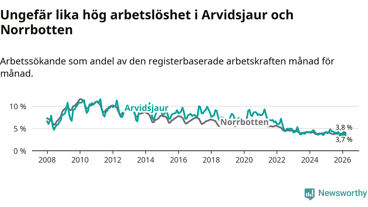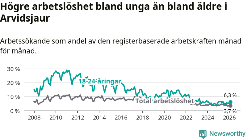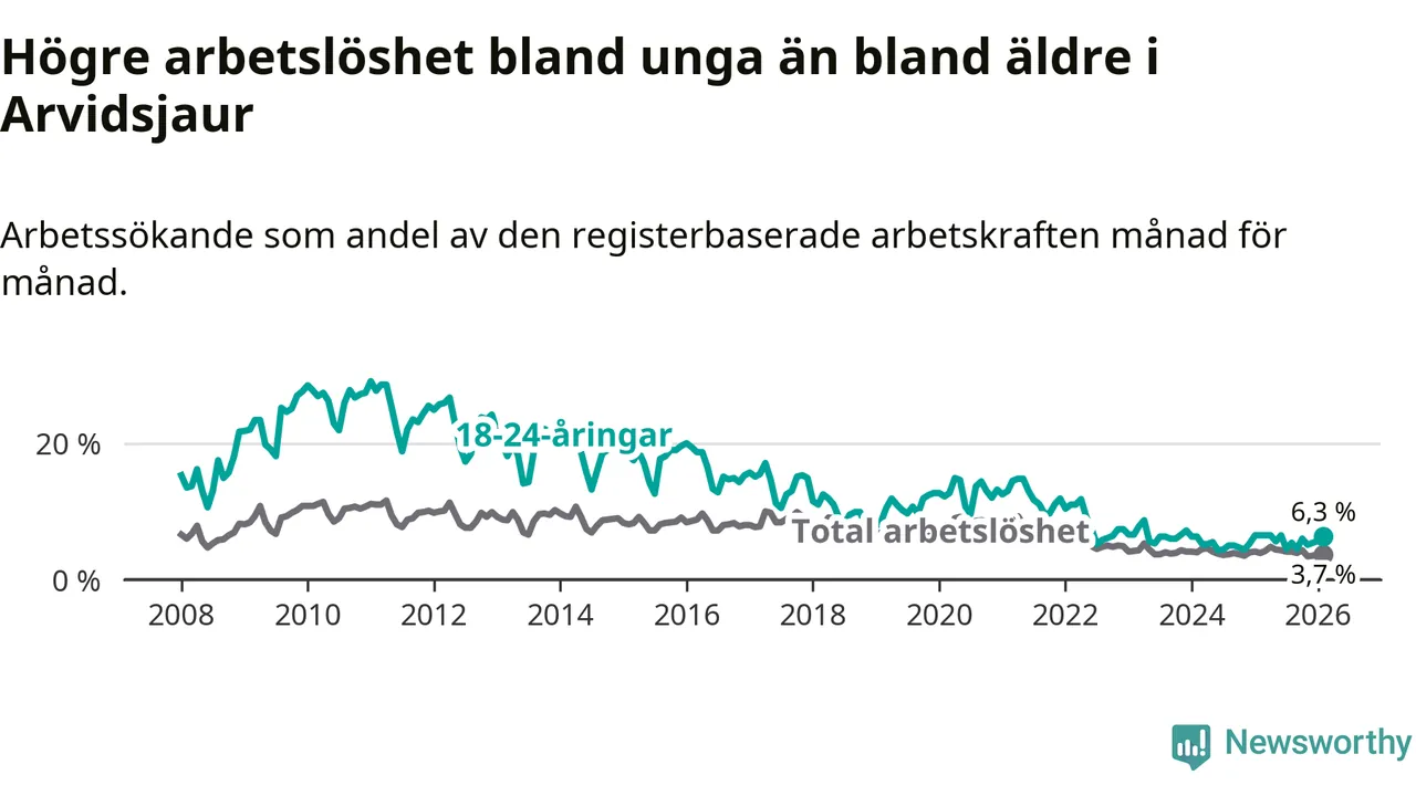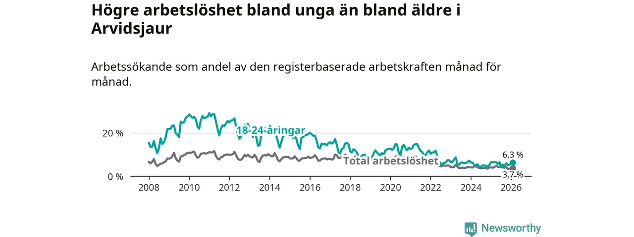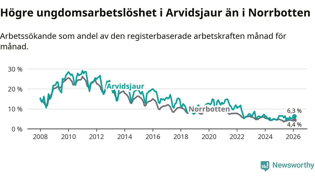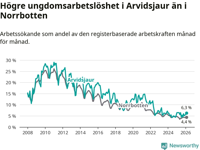 Medan Arvidsjaur har ungefär samma total arbetslöshet som Norrbotten, ligger ungdomsarbetslösheten 1,9 procentenheter högre i Arvidsjaur.
