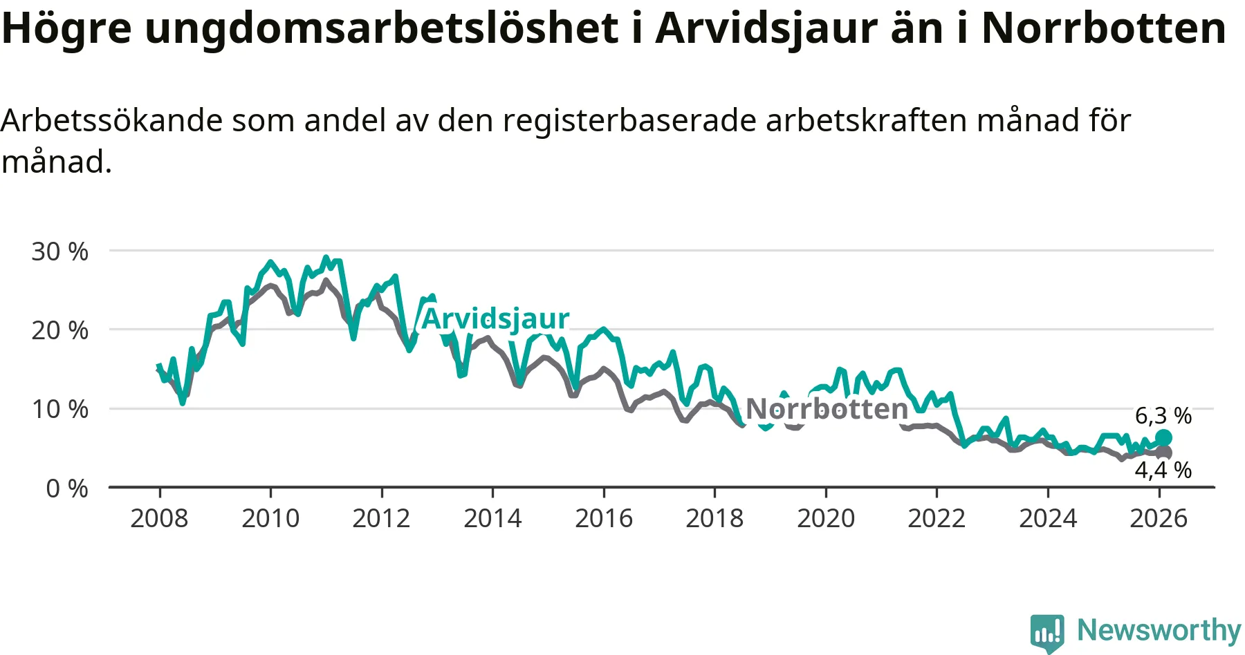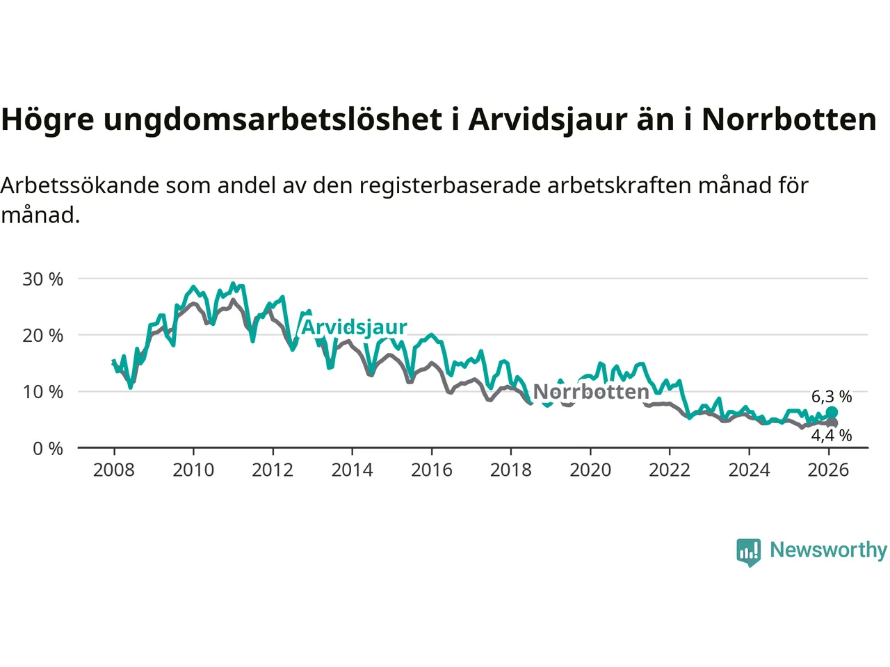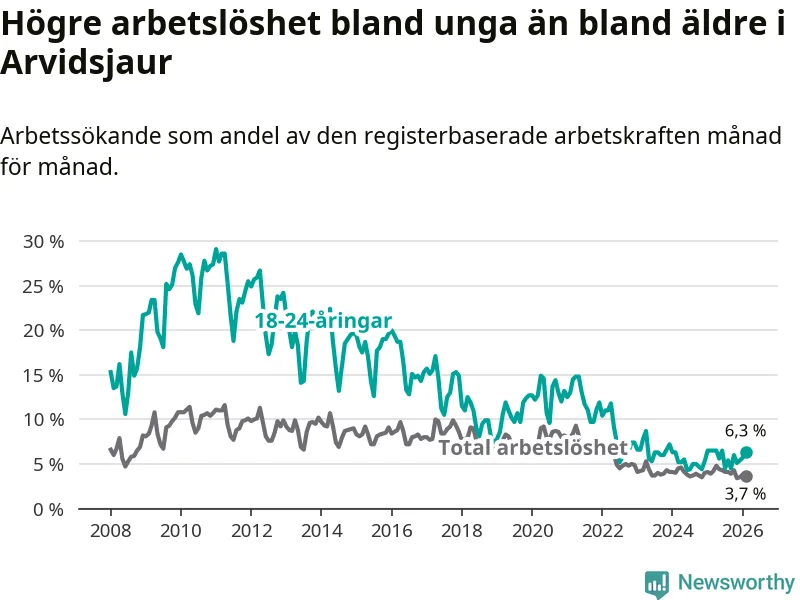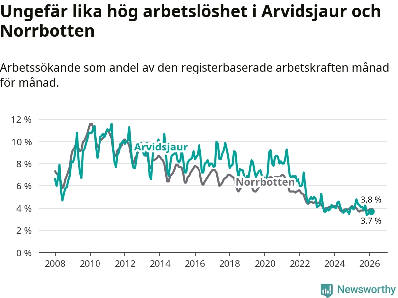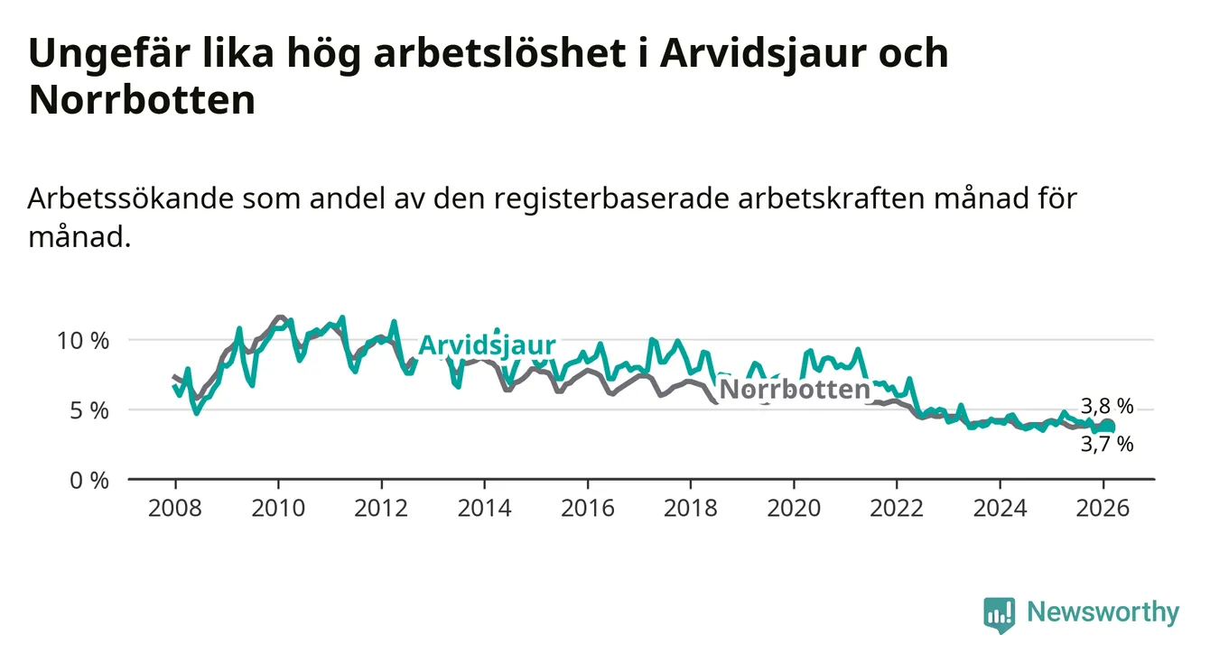 Medan Arvidsjaur har ungefär samma total arbetslöshet som Norrbotten, ligger ungdomsarbetslösheten 1,9 procentenheter högre i Arvidsjaur.