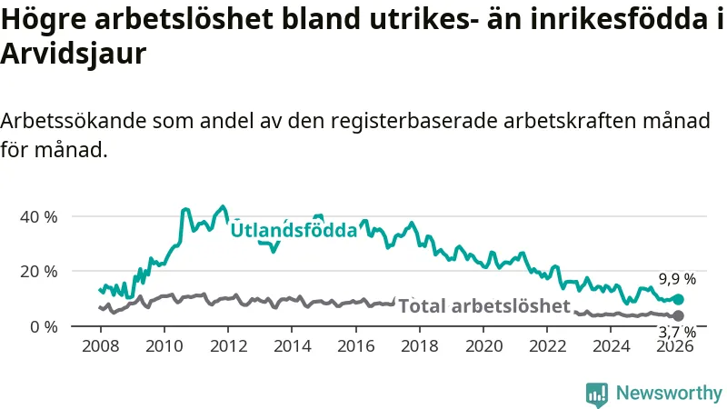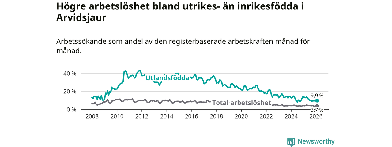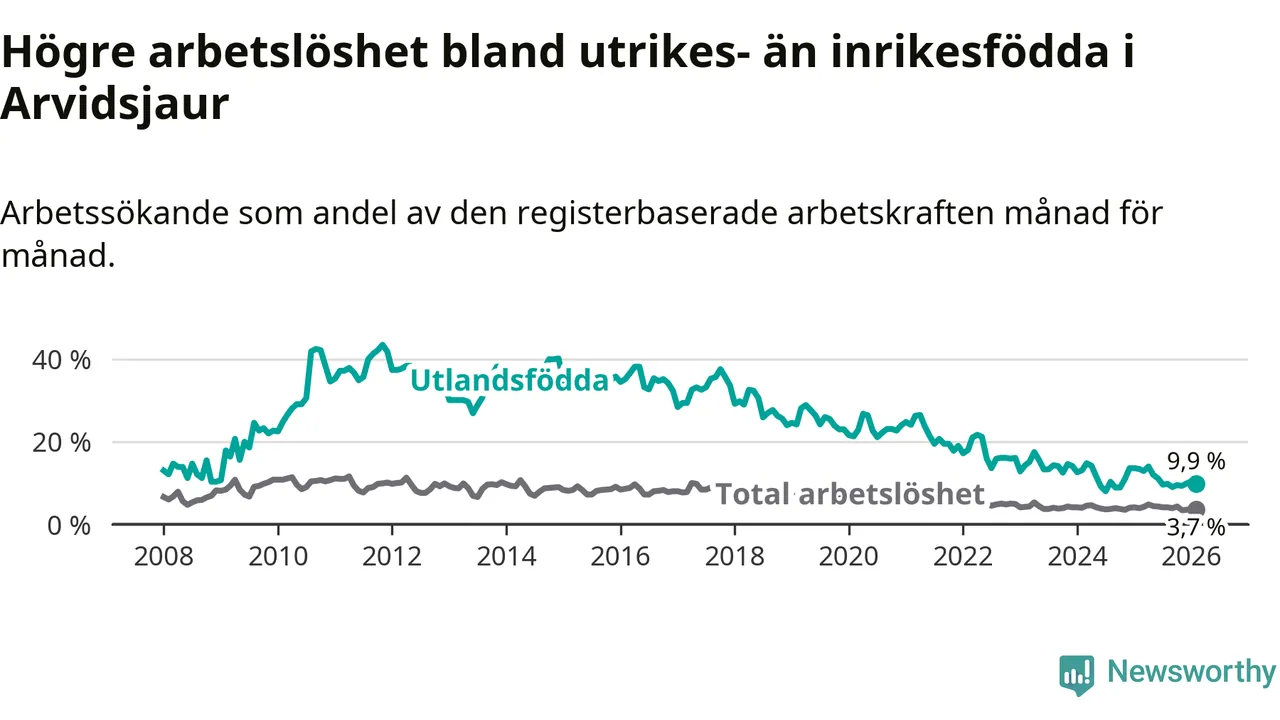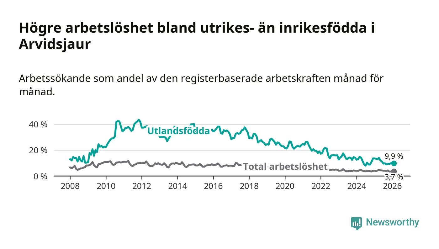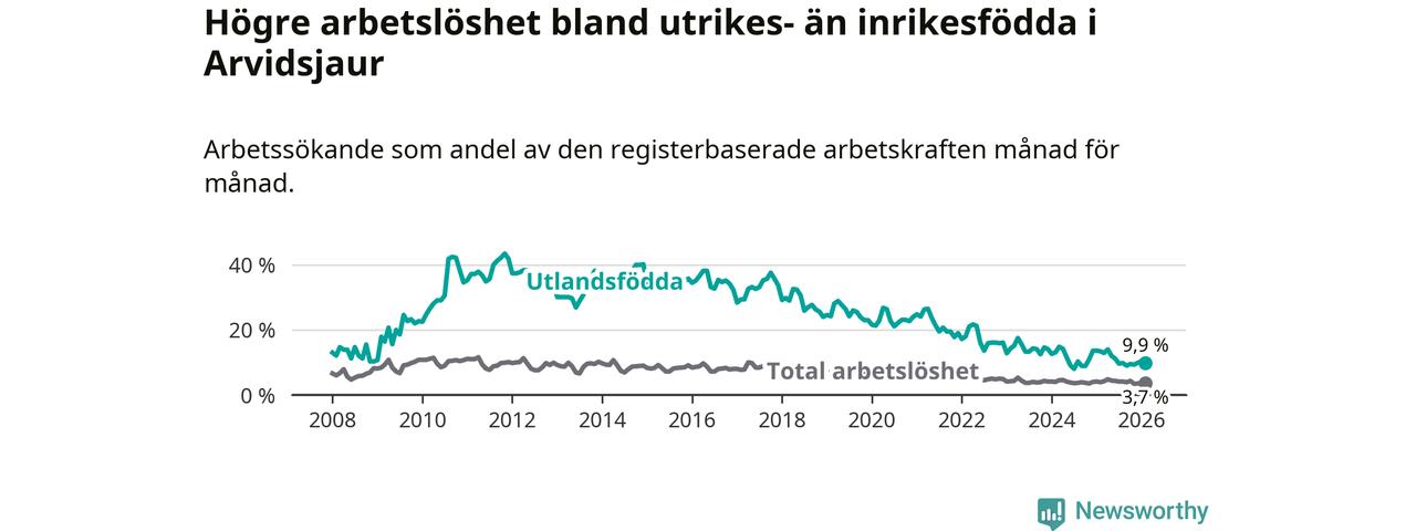 Arbetslösheten bland utlandsfödda var 9,9 procent i Arvidsjaur under februari månad, motsvarande 34 av 343 personer. Det är 3,5 procentenheter färre än vid samma tidpunkt i fjol (−12 om man räknar personer).
