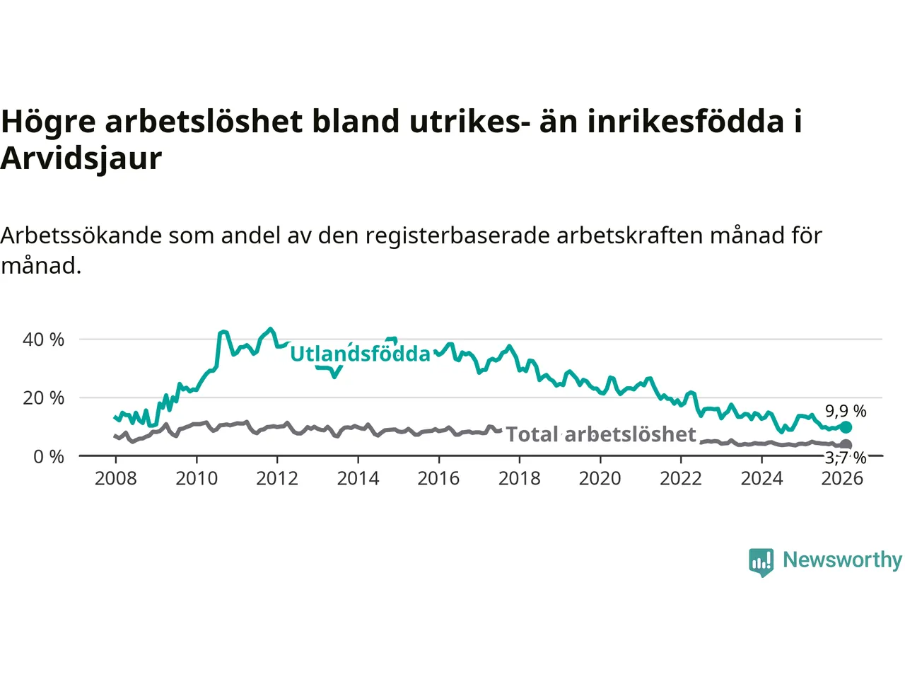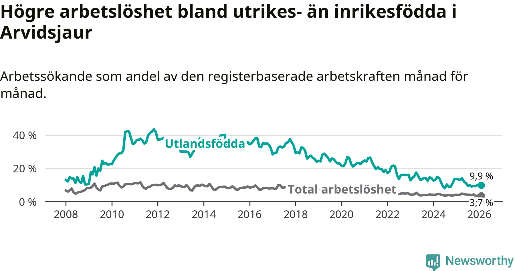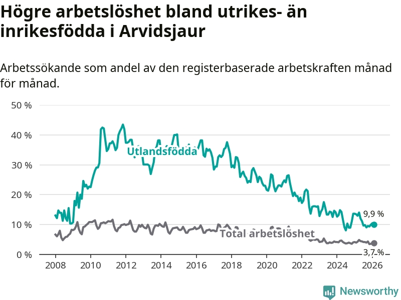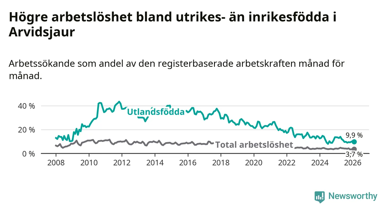 Arbetslösheten bland utlandsfödda var 9,9 procent i Arvidsjaur under februari månad, motsvarande 34 av 343 personer. Det är 3,5 procentenheter färre än vid samma tidpunkt i fjol (−12 om man räknar personer).