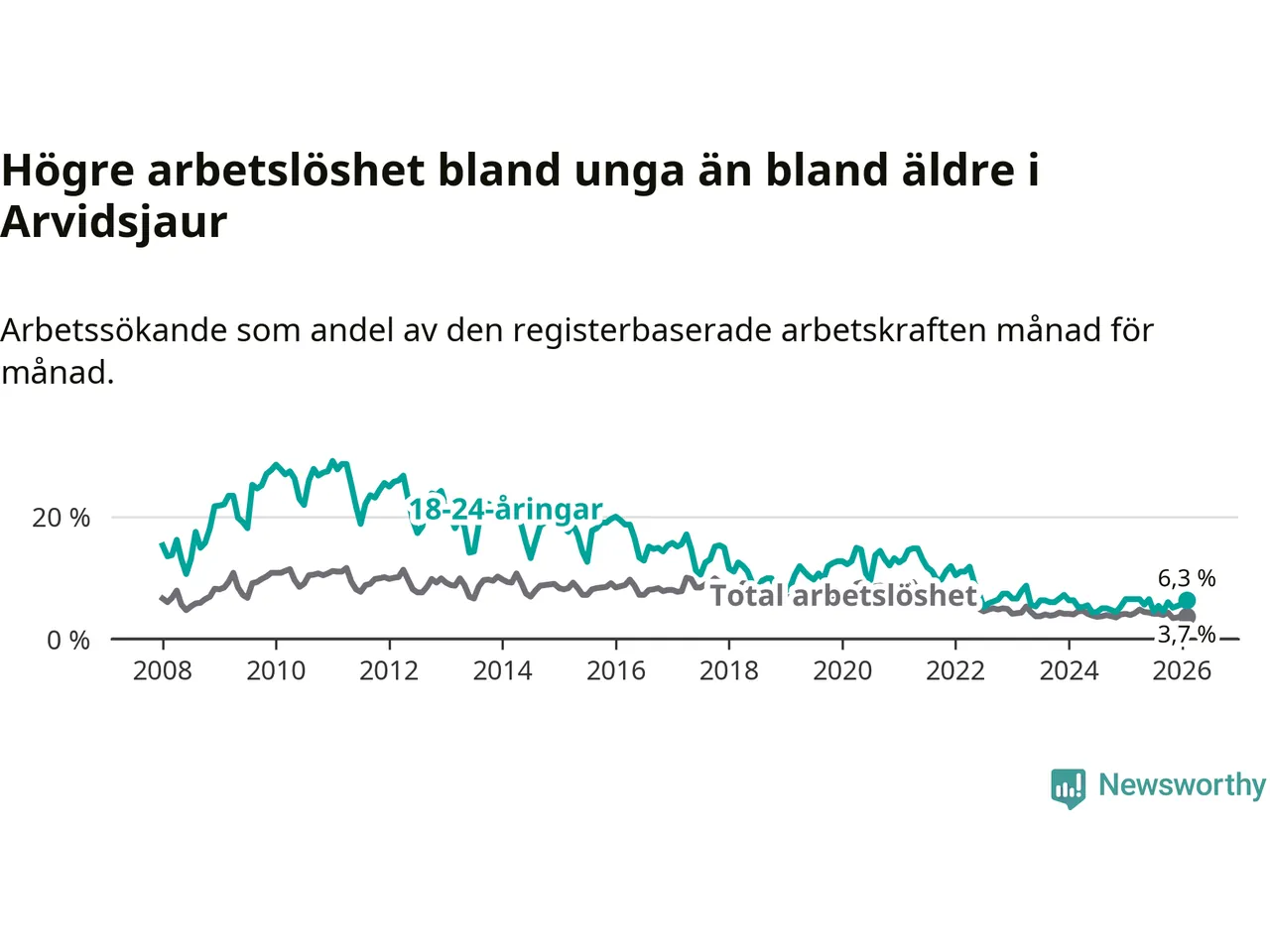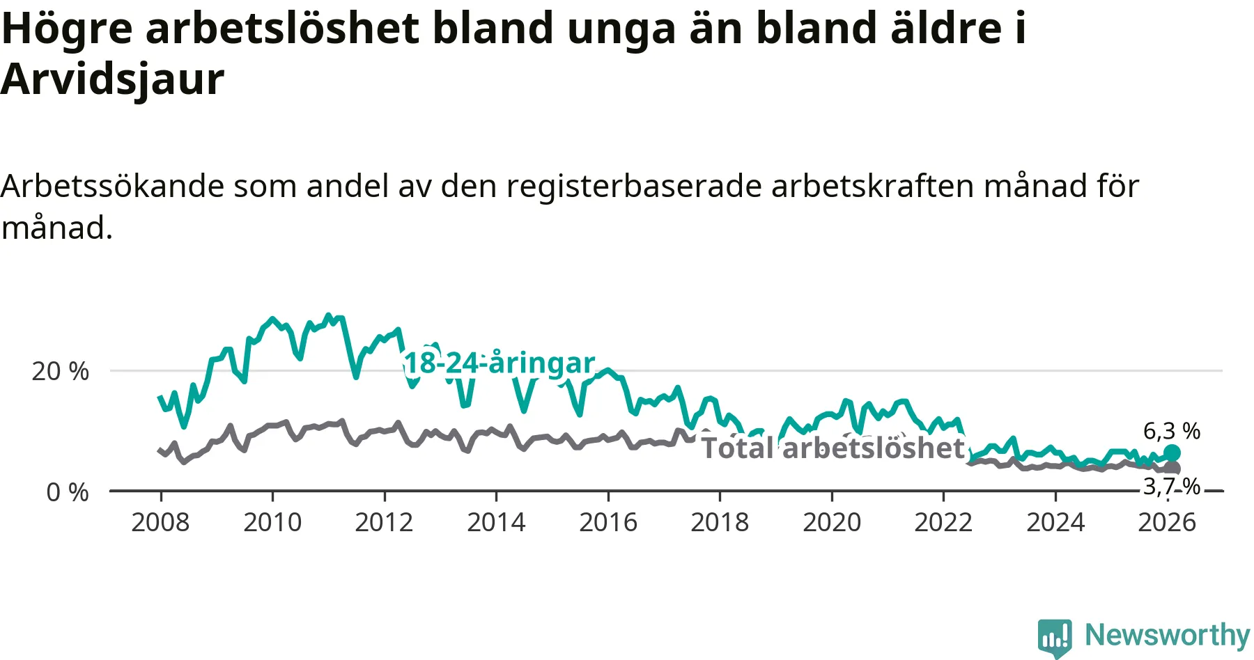 Precis som den totala arbetslösheten sjunker arbetslösheten bland unga (−0,2 procentenheter). I februari var 6,3 procent av 18–24-åringarna inskrivna som arbetssökande (motsvarande 21 personer). Mäter vi antalet inskrivna ser vi en minskning med ett personer på ett års sikt.