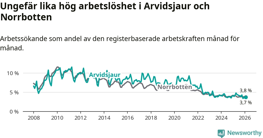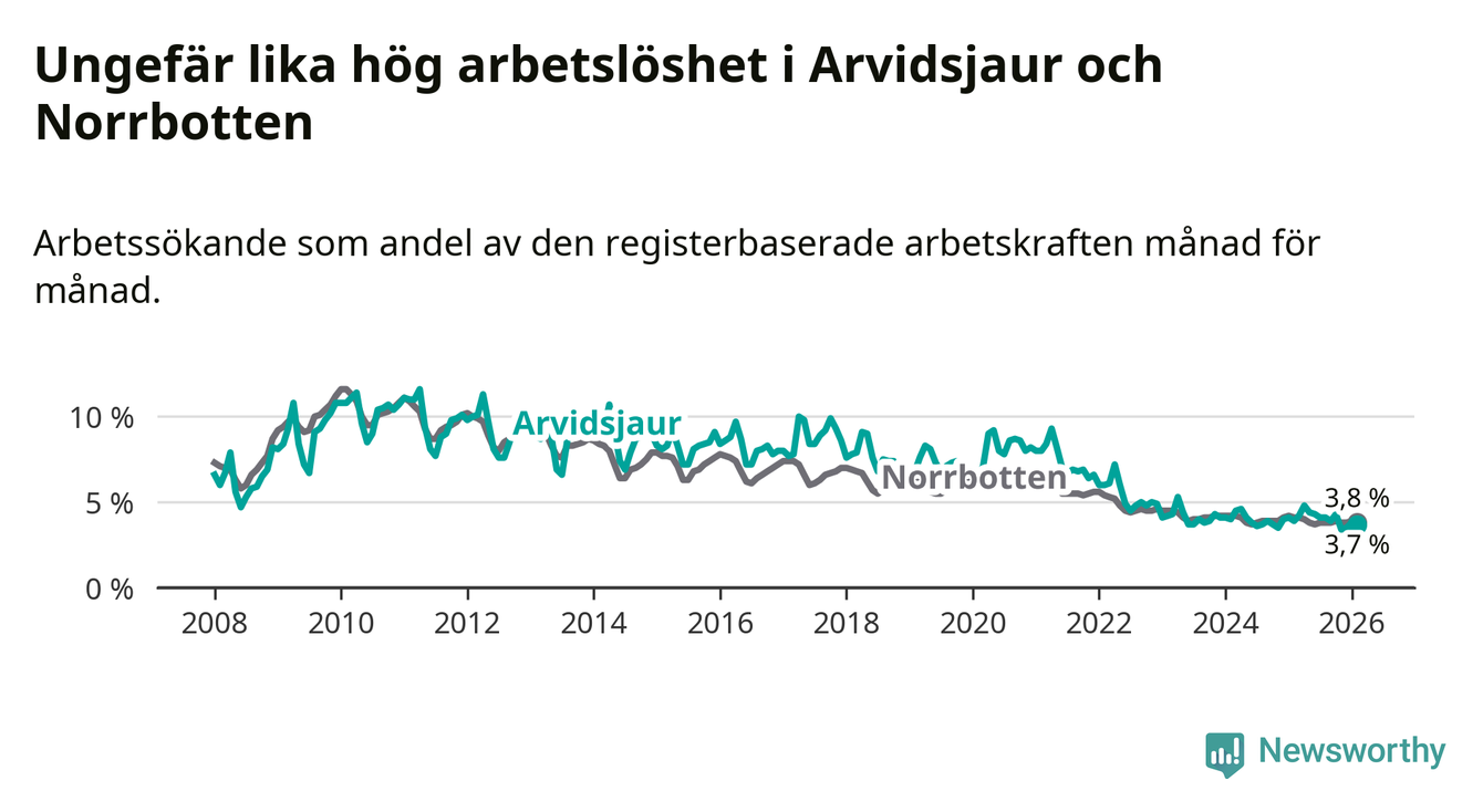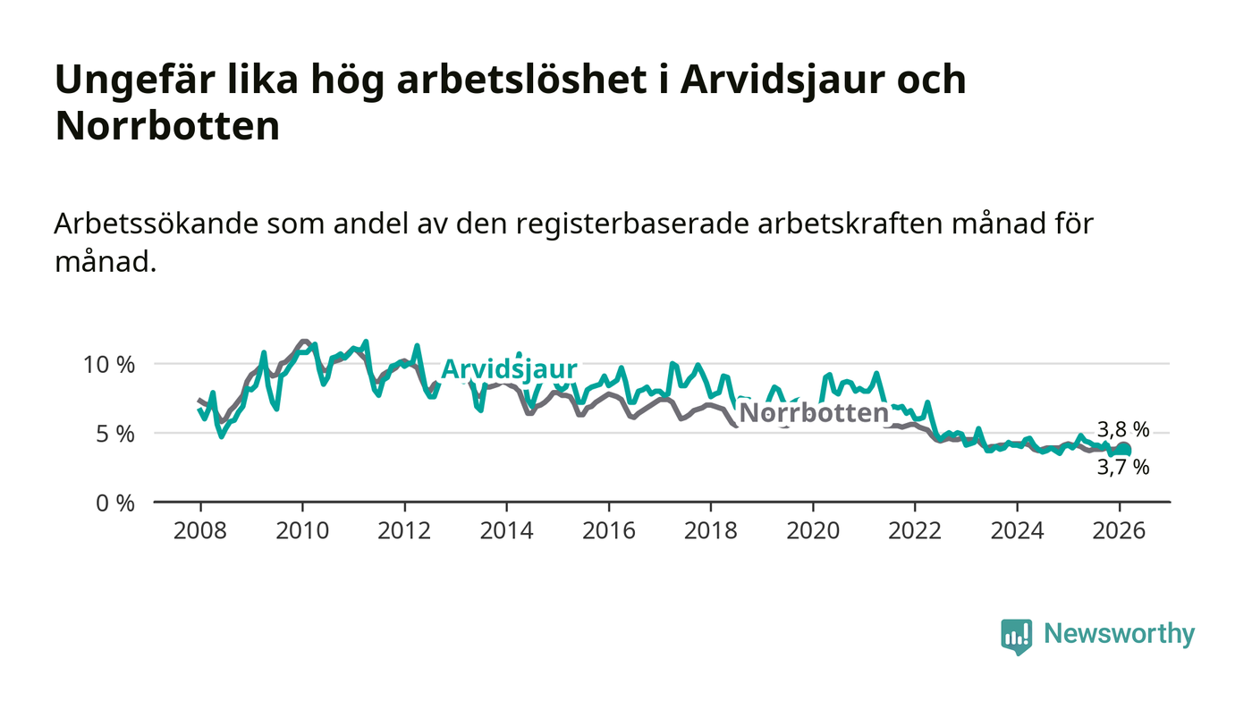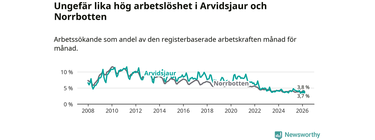 Under februari månad rapporterade Arvidsjaurs kommun en total arbetslöshet på 3,7 procent. Det är en minskning jämfört med samma tidpunkt i fjol (−0,2 procentenheter). Även i Norrbottens län sjunker arbetslösheten .