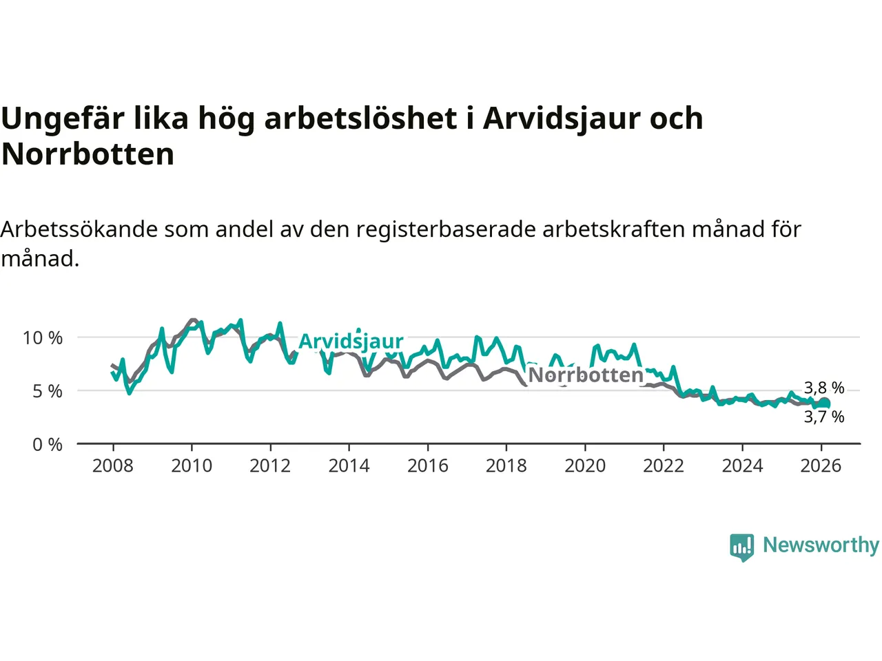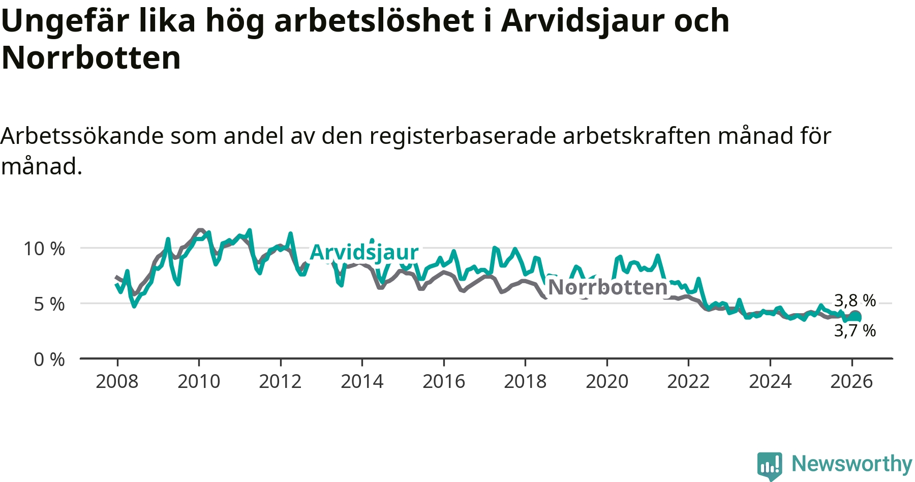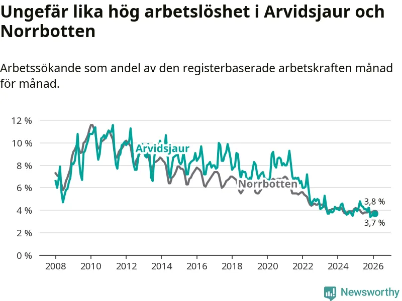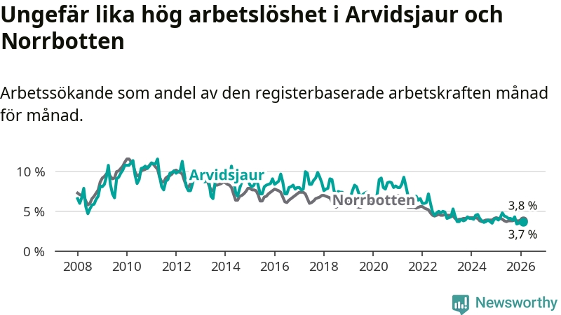 Under februari månad rapporterade Arvidsjaurs kommun en total arbetslöshet på 3,7 procent. Det är en minskning jämfört med samma tidpunkt i fjol (−0,2 procentenheter). Även i Norrbottens län sjunker arbetslösheten .