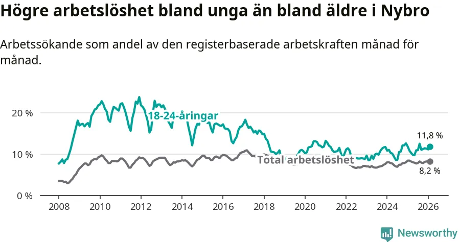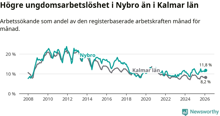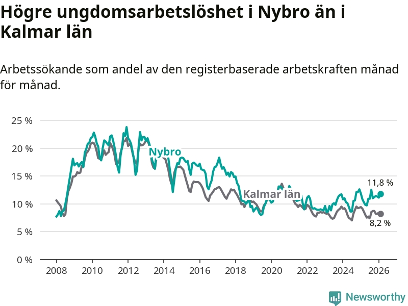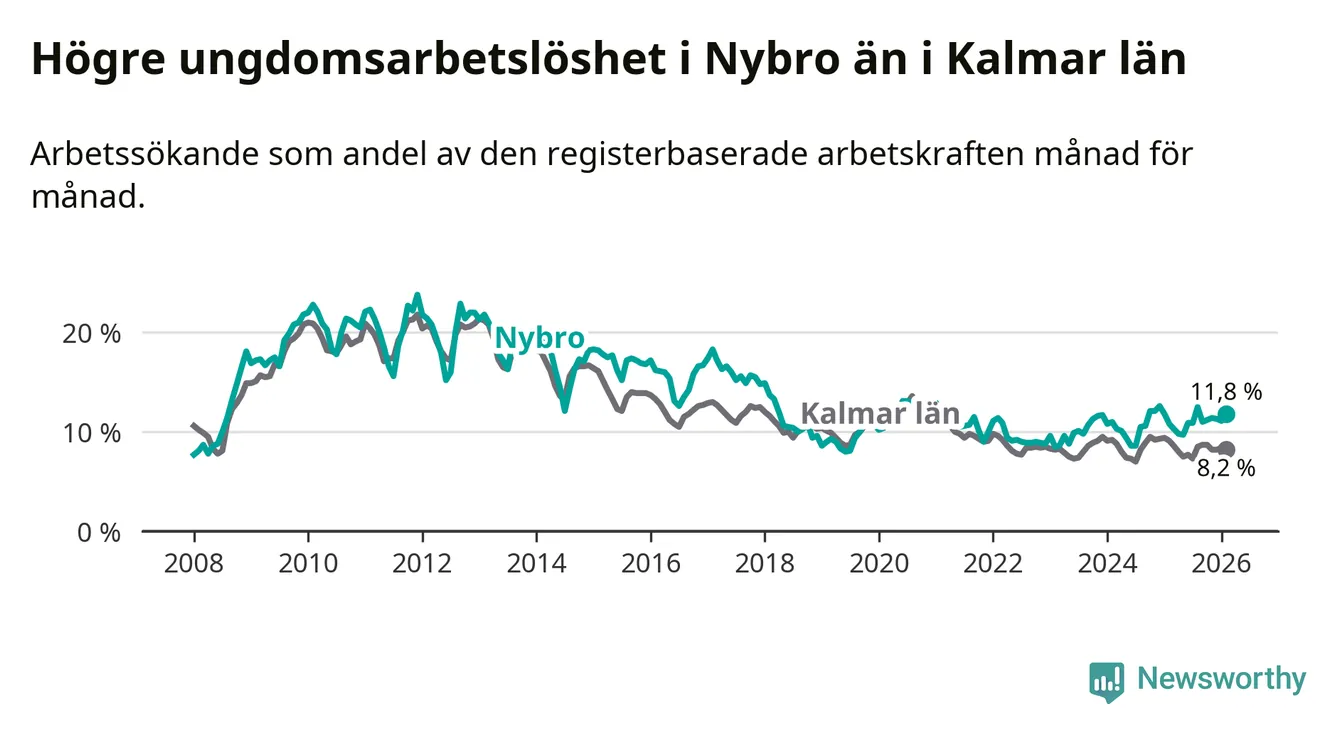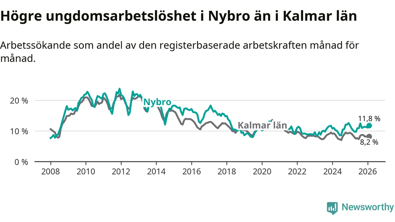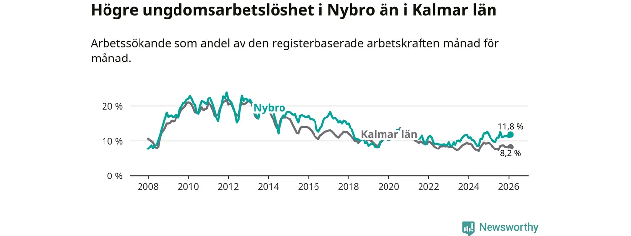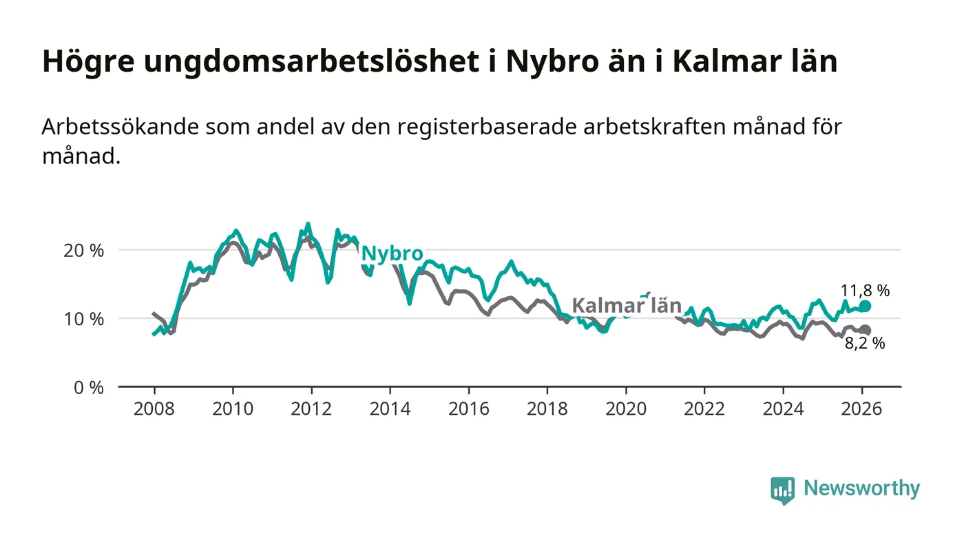 Precis som den totala arbetslösheten ligger ungdomsarbetslösheten i Nybro högre än i Kalmar län som helhet. Skillnaden mellan kommunen och länet är 3,6 procentenheter.
