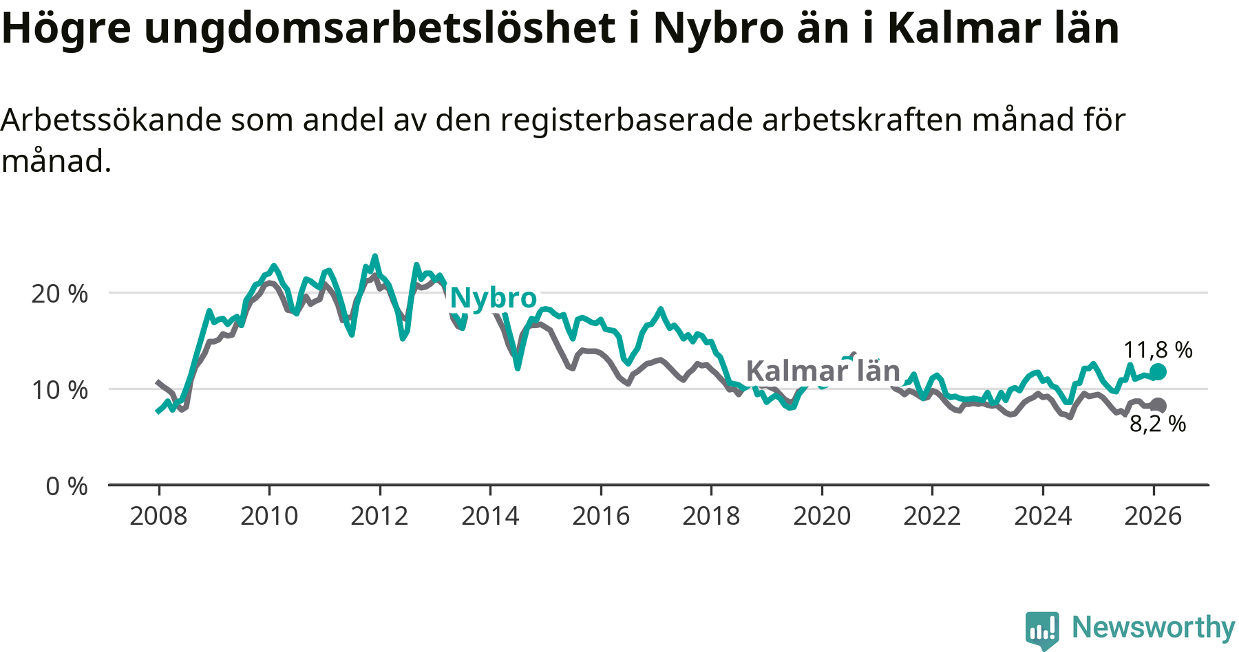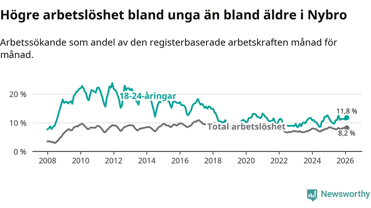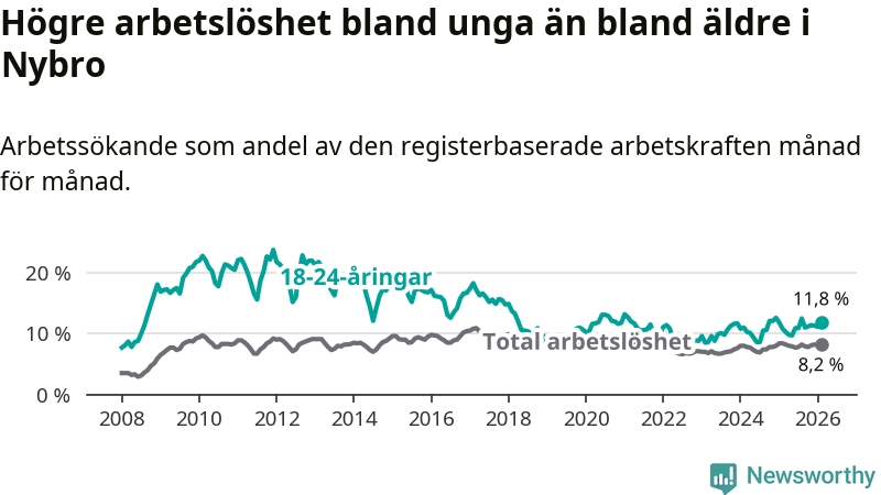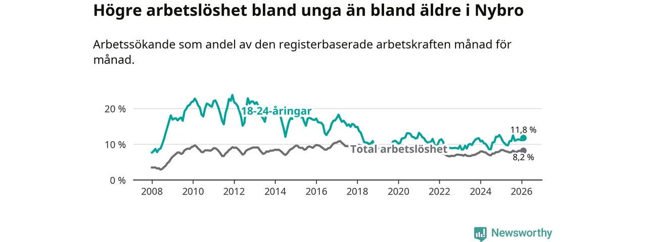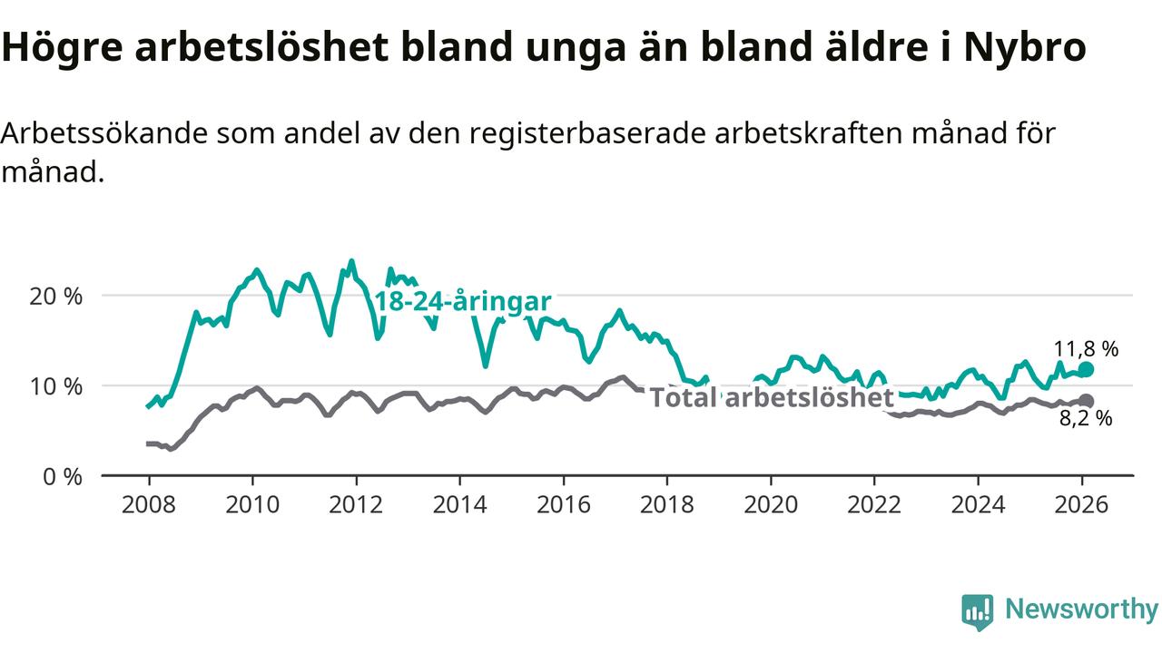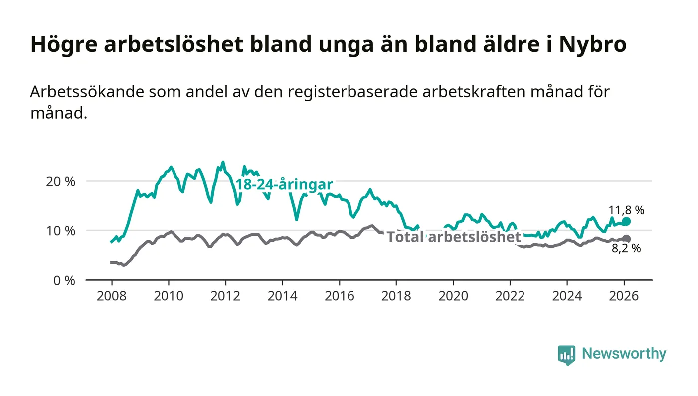Precis som den totala arbetslösheten ligger ungdomsarbetslösheten i Nybro högre än i Kalmar län som helhet. Skillnaden mellan kommunen och länet är 3,6 procentenheter.