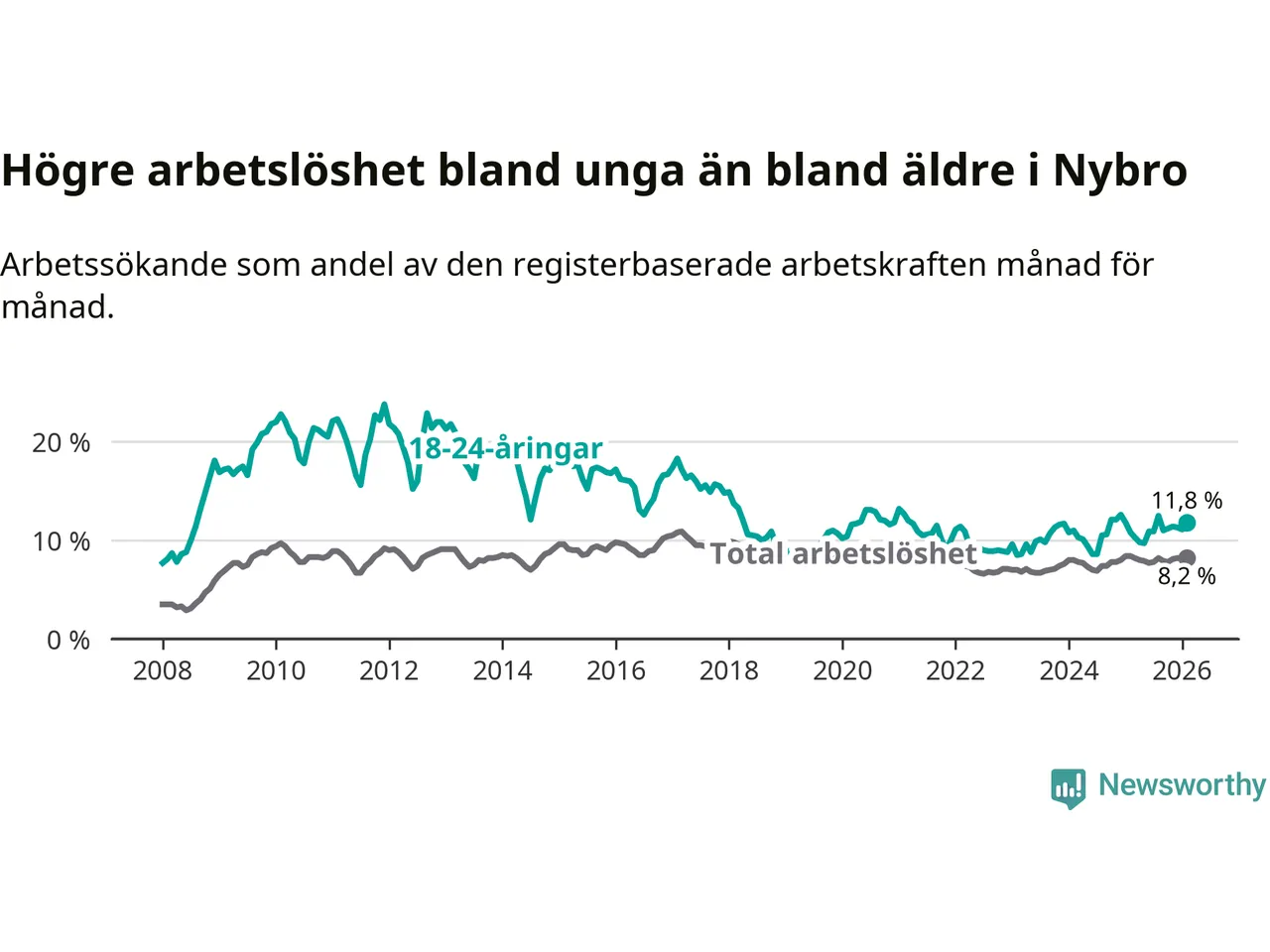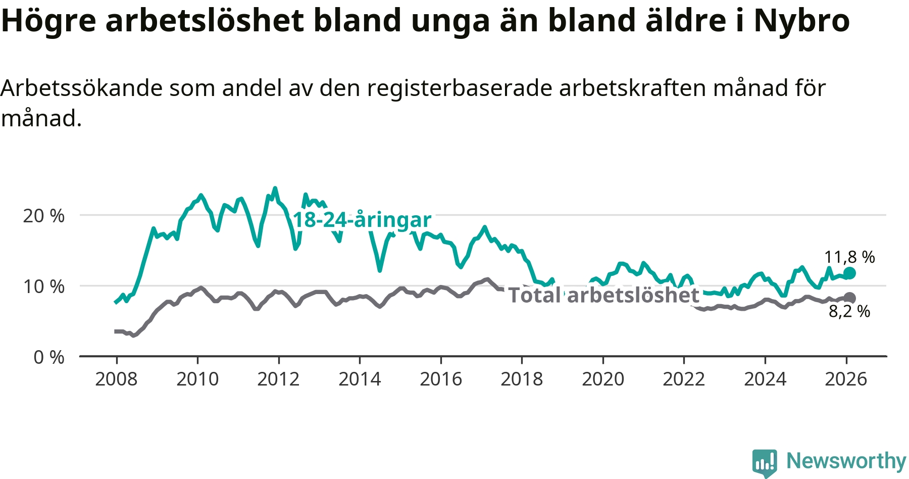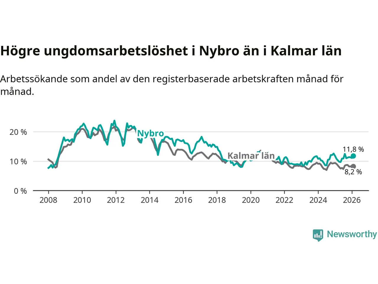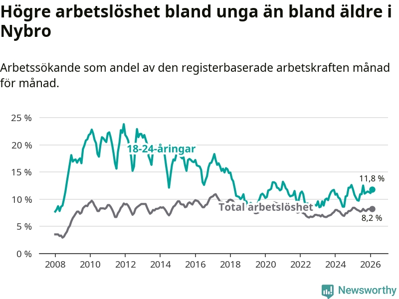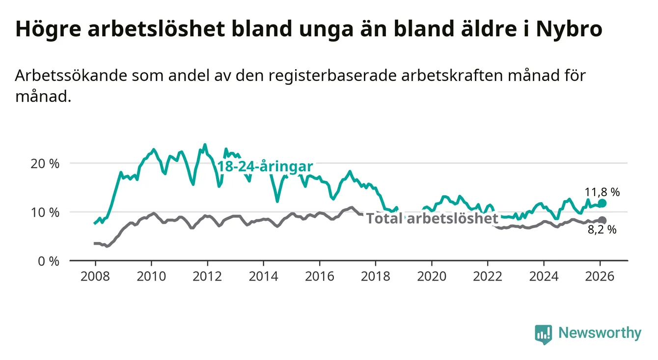 Precis som den totala arbetslösheten ligger ungdomsarbetslösheten i Nybro högre än i Kalmar län som helhet. Skillnaden mellan kommunen och länet är 3,6 procentenheter.