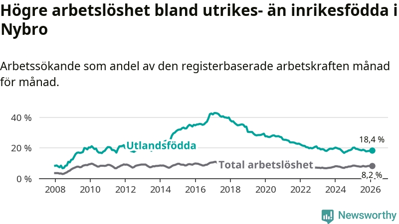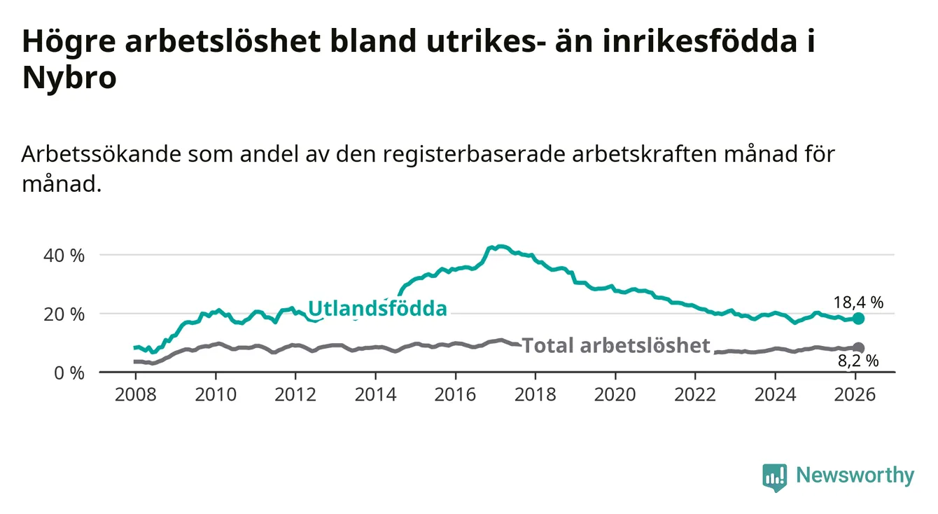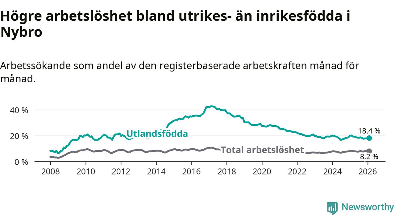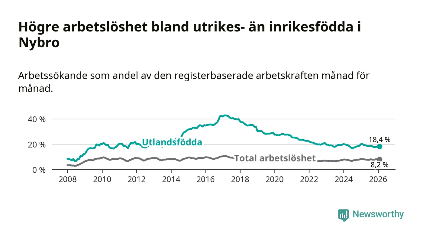 Arbetslösheten bland utlandsfödda var 18,4 procent i Nybro under februari månad, motsvarande 399 av 2 168 personer. Det är 1,8 procentenheter färre än vid samma tidpunkt i fjol (−35 om man räknar personer).
