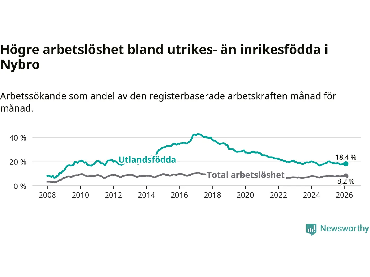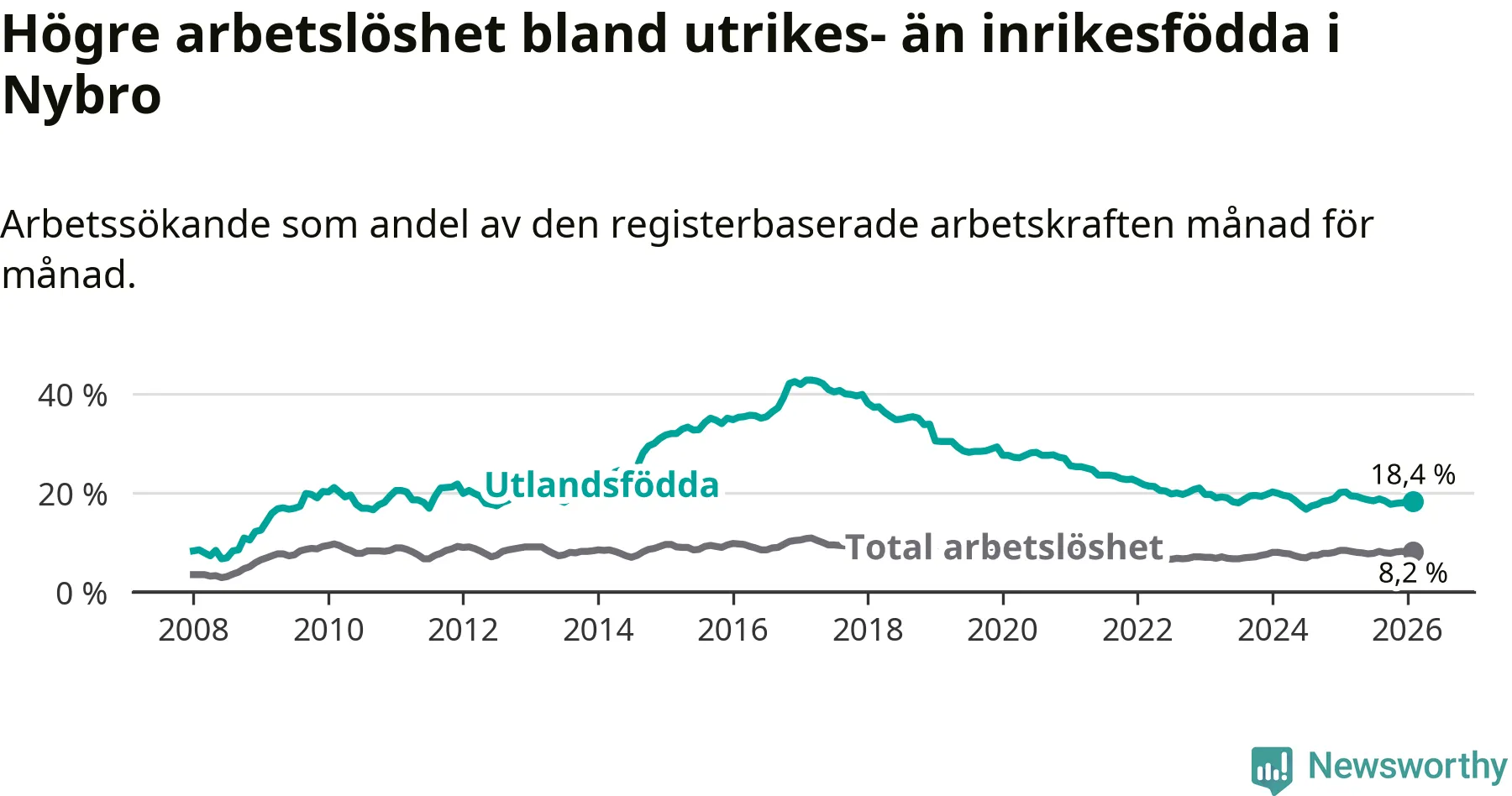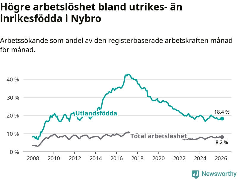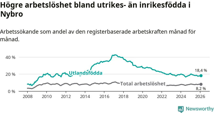 Arbetslösheten bland utlandsfödda var 18,4 procent i Nybro under februari månad, motsvarande 399 av 2 168 personer. Det är 1,8 procentenheter färre än vid samma tidpunkt i fjol (−35 om man räknar personer).