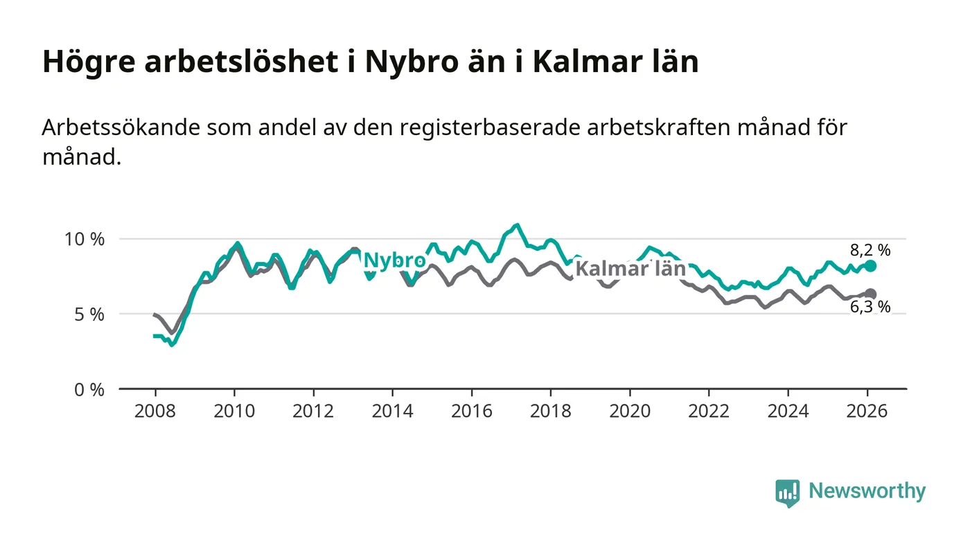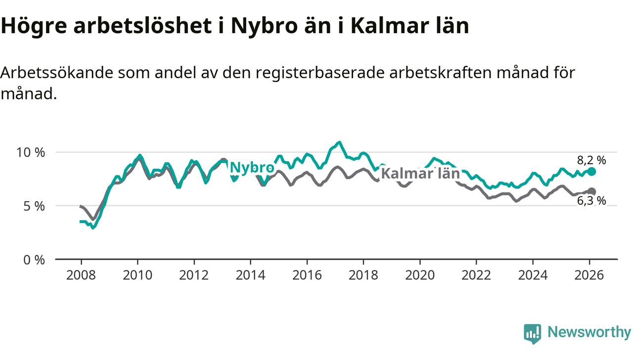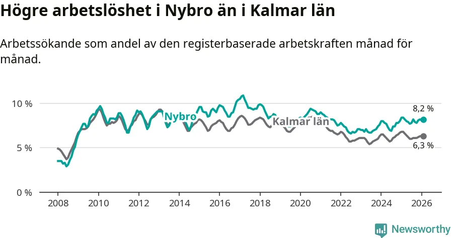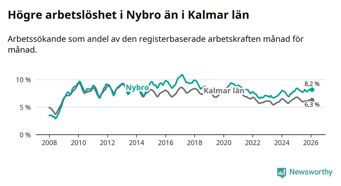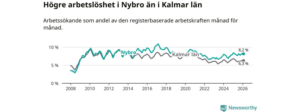 Under februari månad rapporterade Nybro kommun en total arbetslöshet på 8,2 procent. Det är en minskning jämfört med samma tidpunkt i fjol (−0,2 procentenheter). Även i Kalmar län sjunker arbetslösheten .