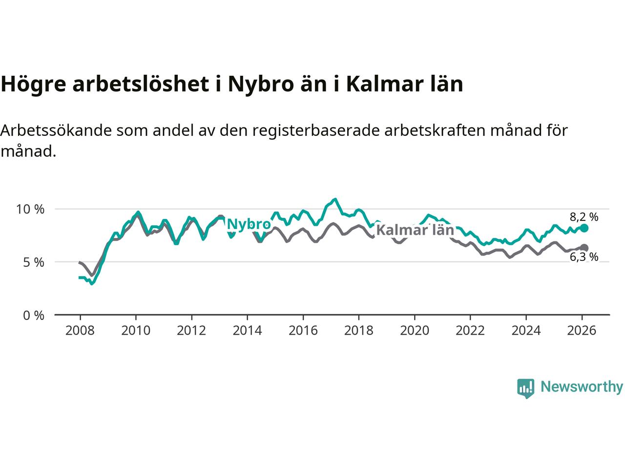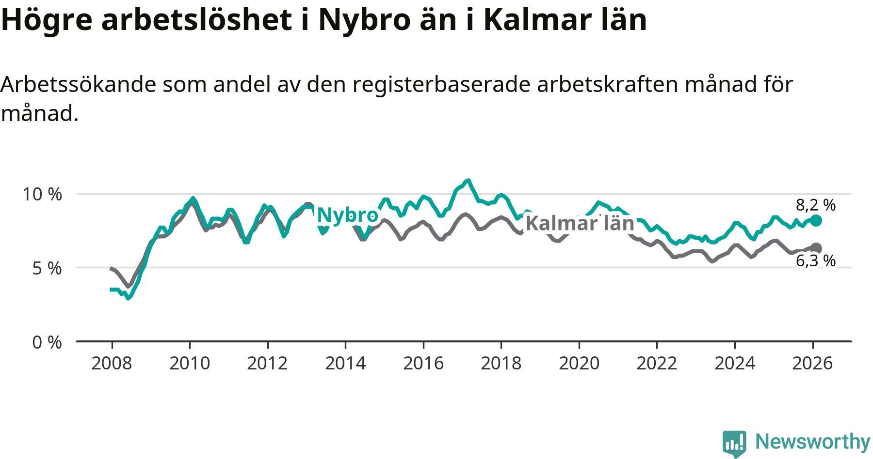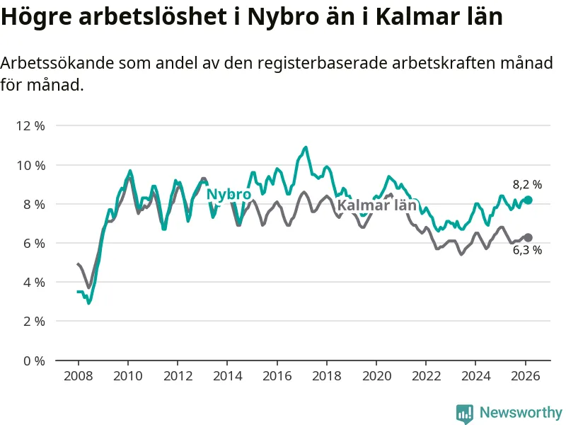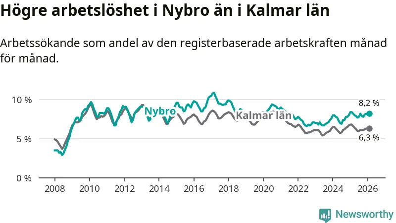 Under februari månad rapporterade Nybro kommun en total arbetslöshet på 8,2 procent. Det är en minskning jämfört med samma tidpunkt i fjol (−0,2 procentenheter). Även i Kalmar län sjunker arbetslösheten .