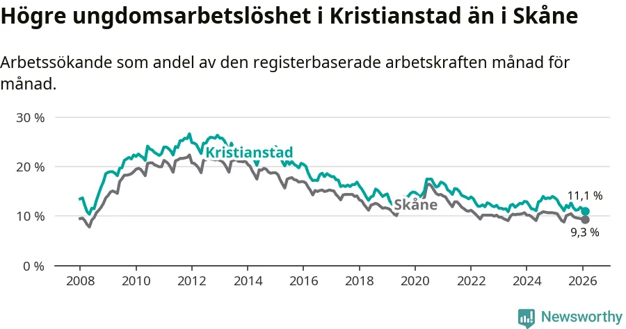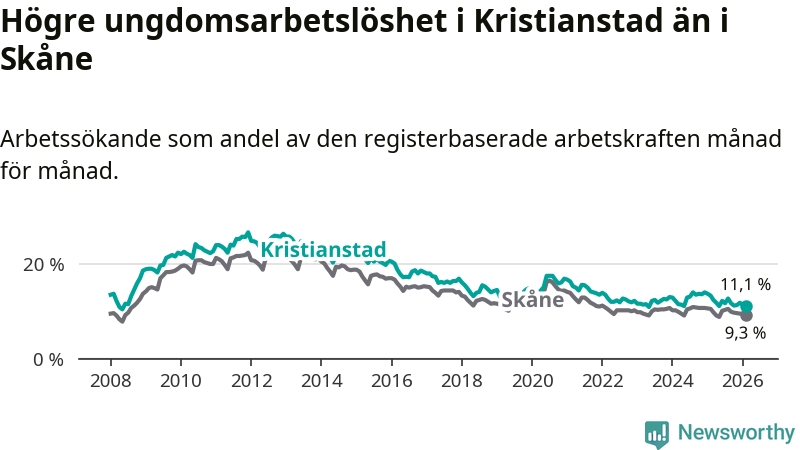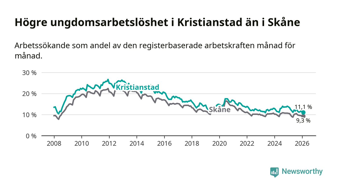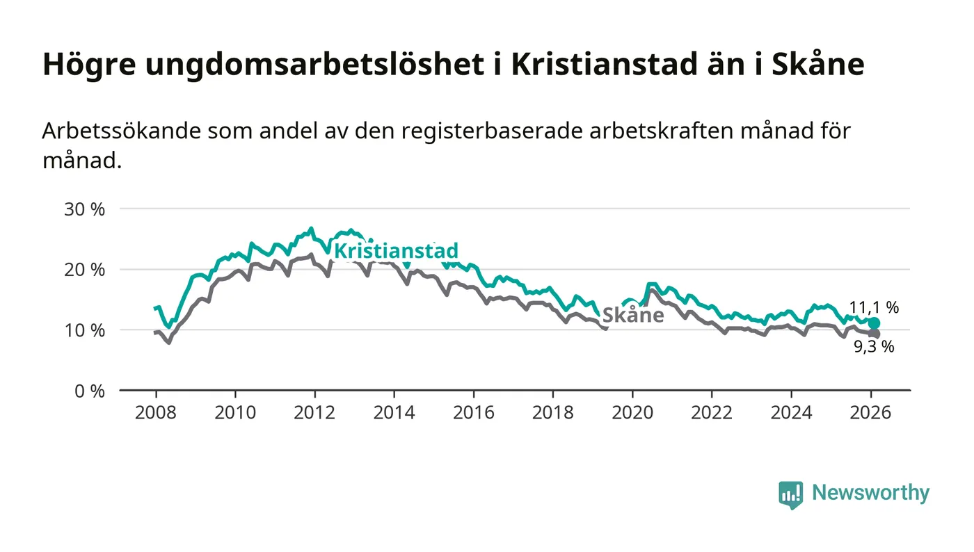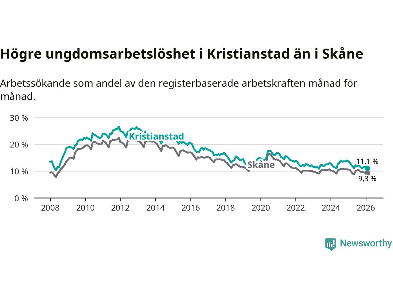 Precis som den totala arbetslösheten ligger ungdomsarbetslösheten i Kristianstad högre än i Skåne som helhet. Skillnaden mellan kommunen och länet är 1,8 procentenheter.