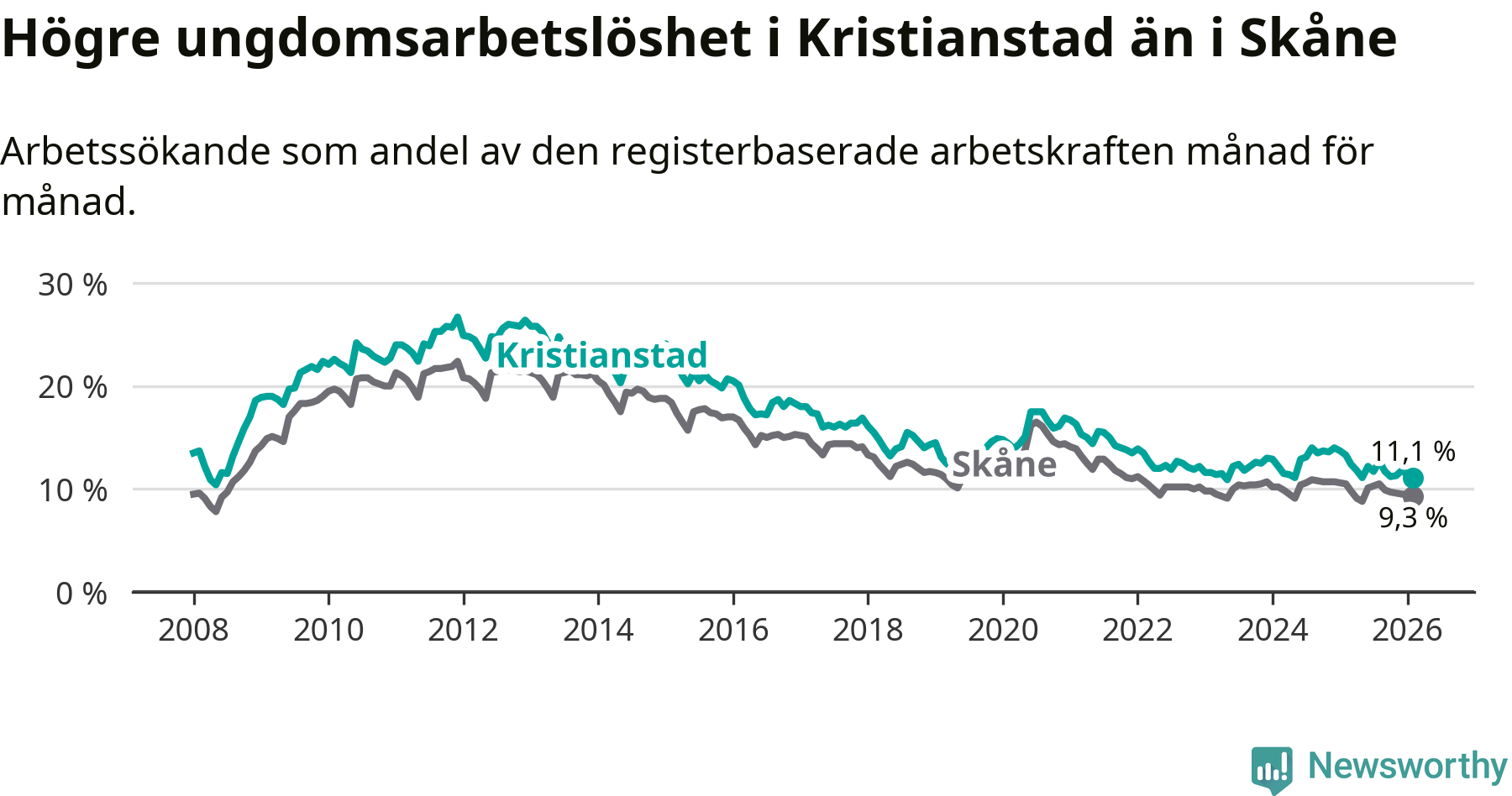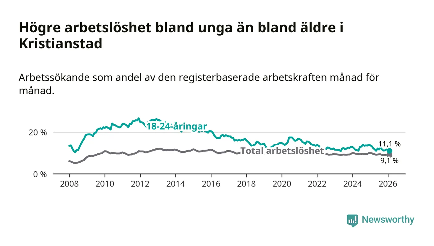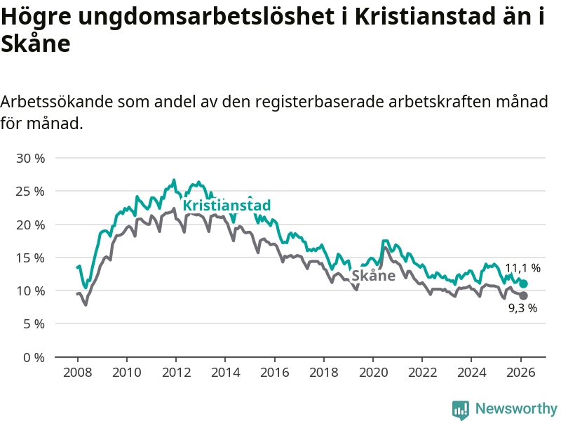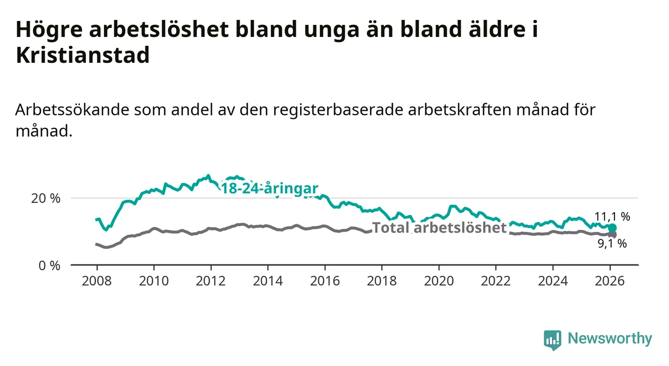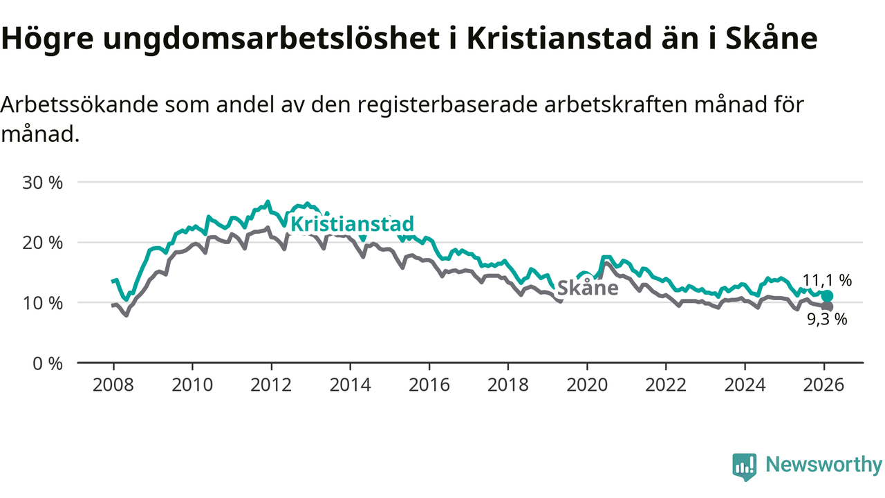 Precis som den totala arbetslösheten ligger ungdomsarbetslösheten i Kristianstad högre än i Skåne som helhet. Skillnaden mellan kommunen och länet är 1,8 procentenheter.