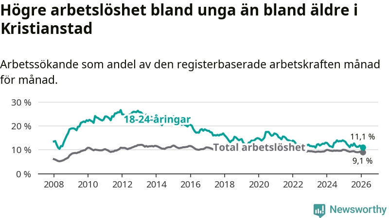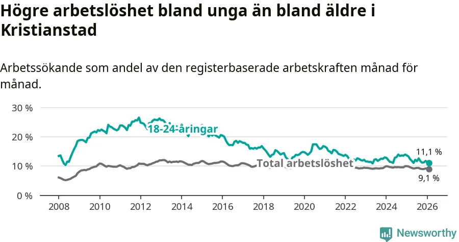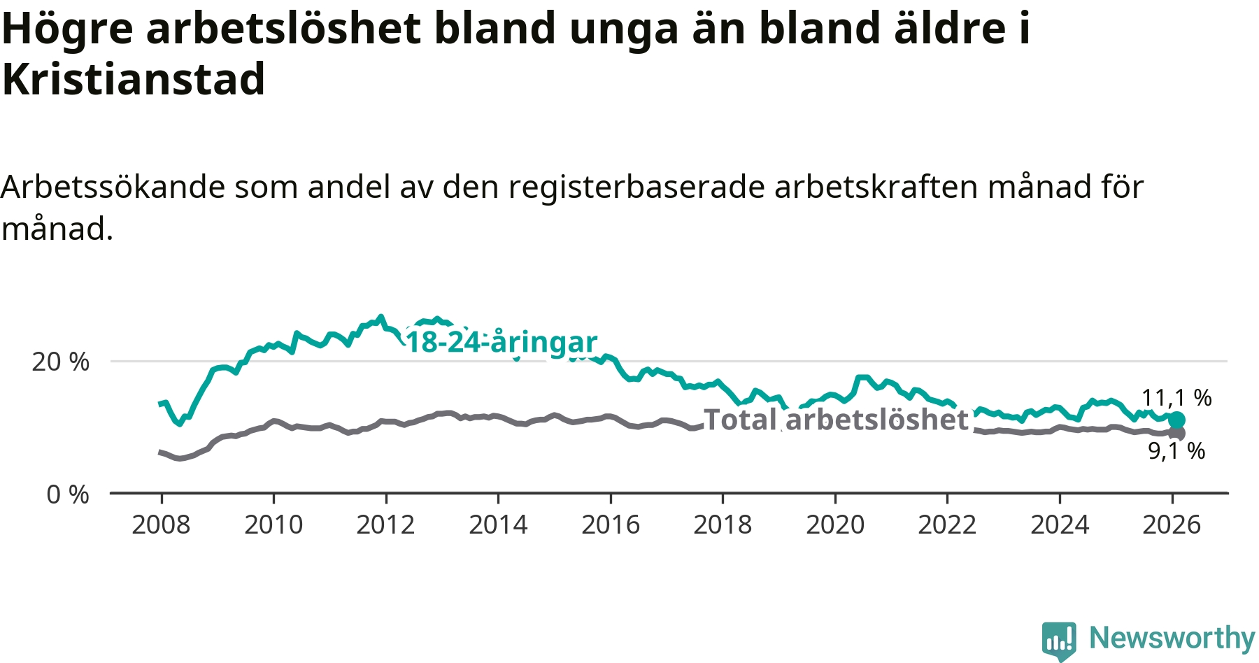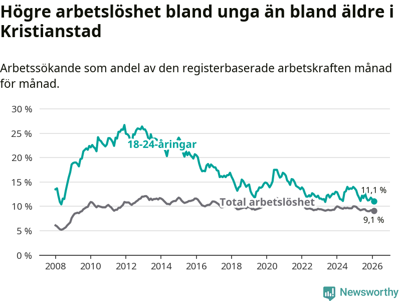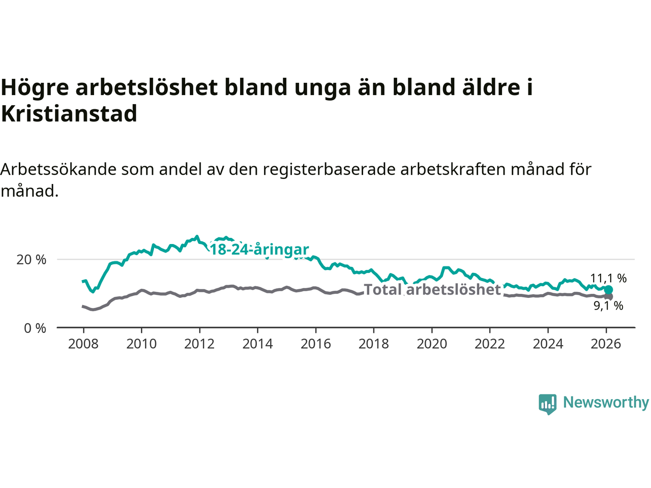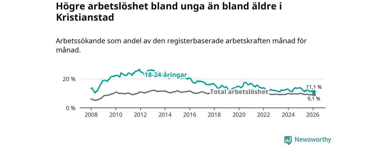 Precis som den totala arbetslösheten ligger ungdomsarbetslösheten i Kristianstad högre än i Skåne som helhet. Skillnaden mellan kommunen och länet är 1,8 procentenheter.