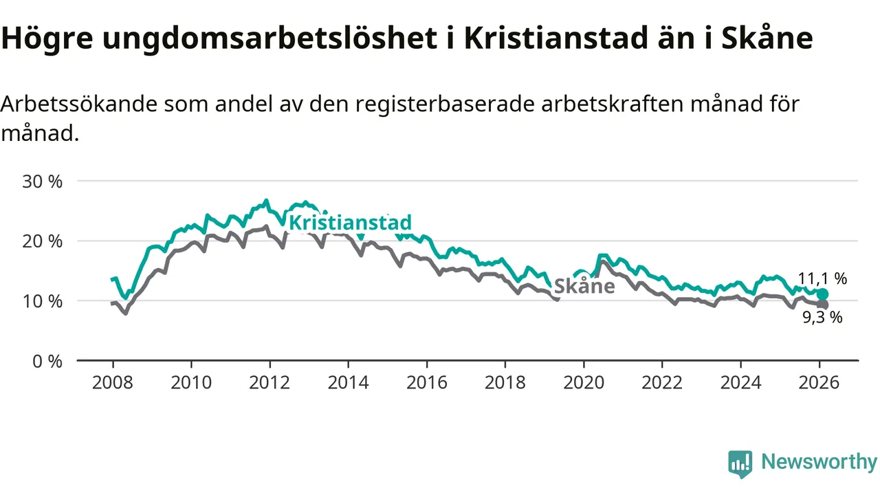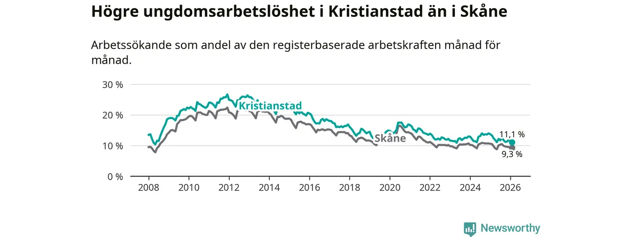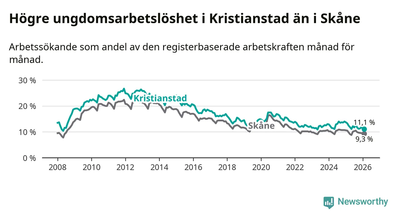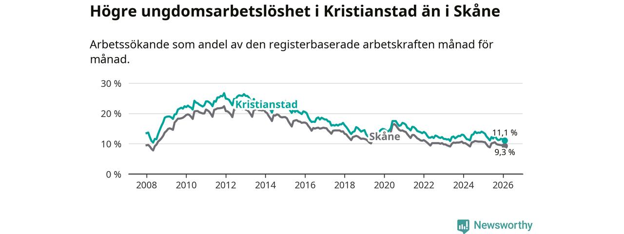 Graf: Arbetslöshet bland unga i Kristianstads kommun och Skåne län
