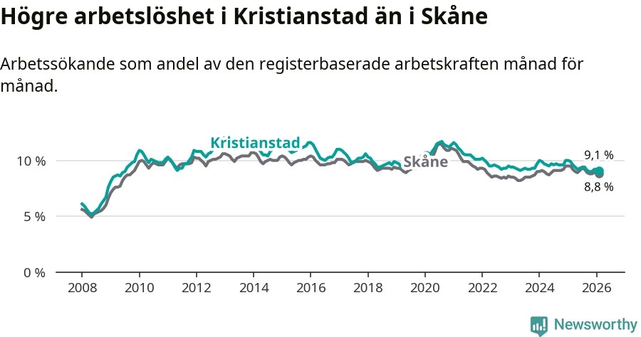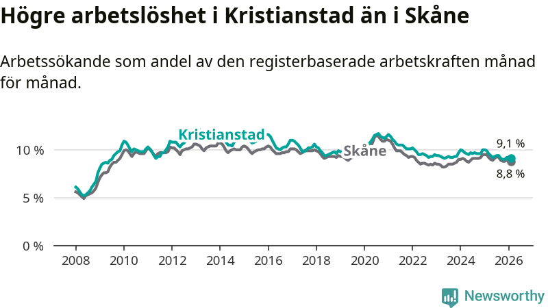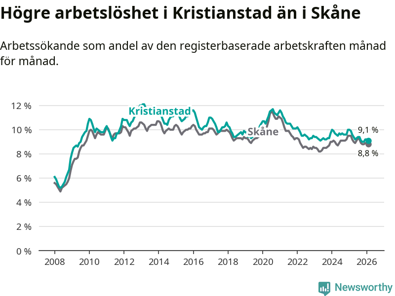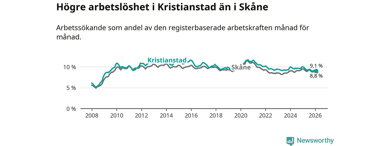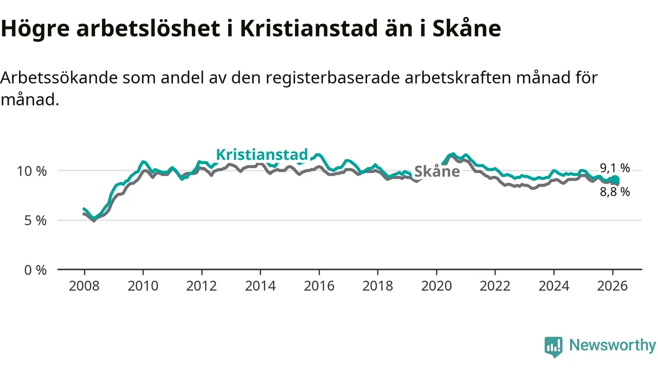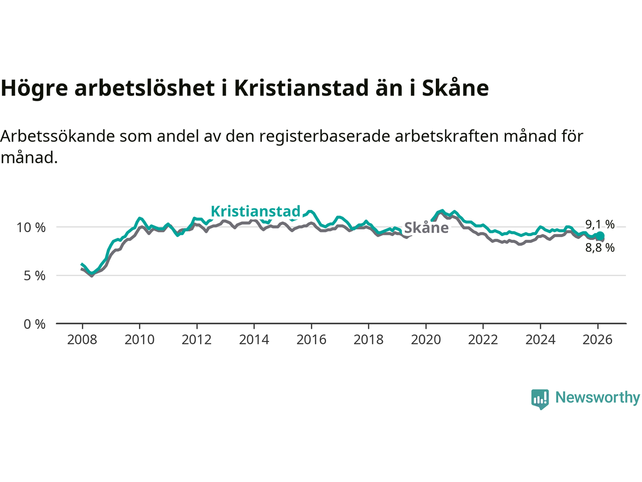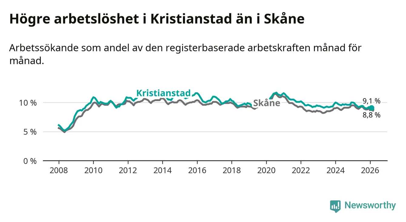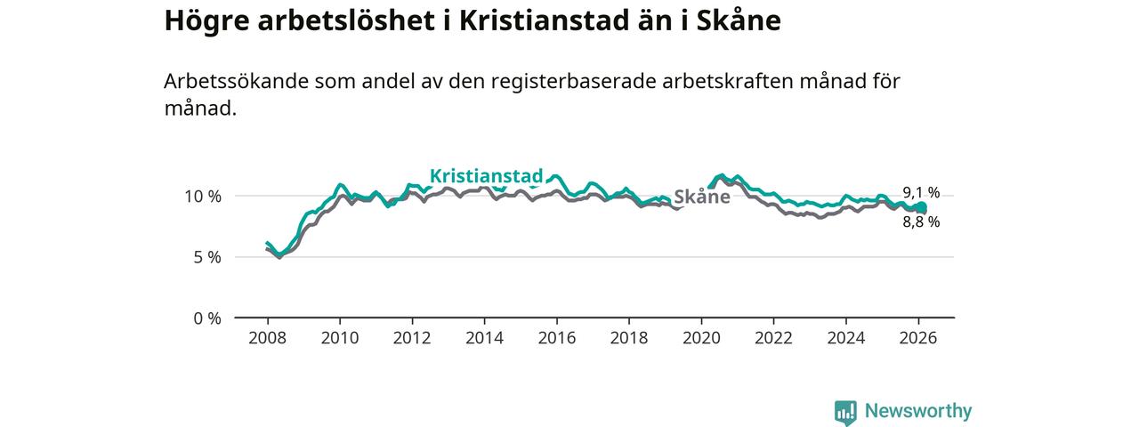 Under februari månad rapporterade Kristianstads kommun en total arbetslöshet på 9,1 procent. Det är en minskning jämfört med samma tidpunkt i fjol (−0,8 procentenheter). Även i Skåne län sjunker arbetslösheten .