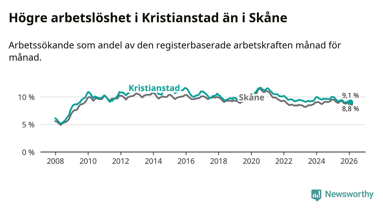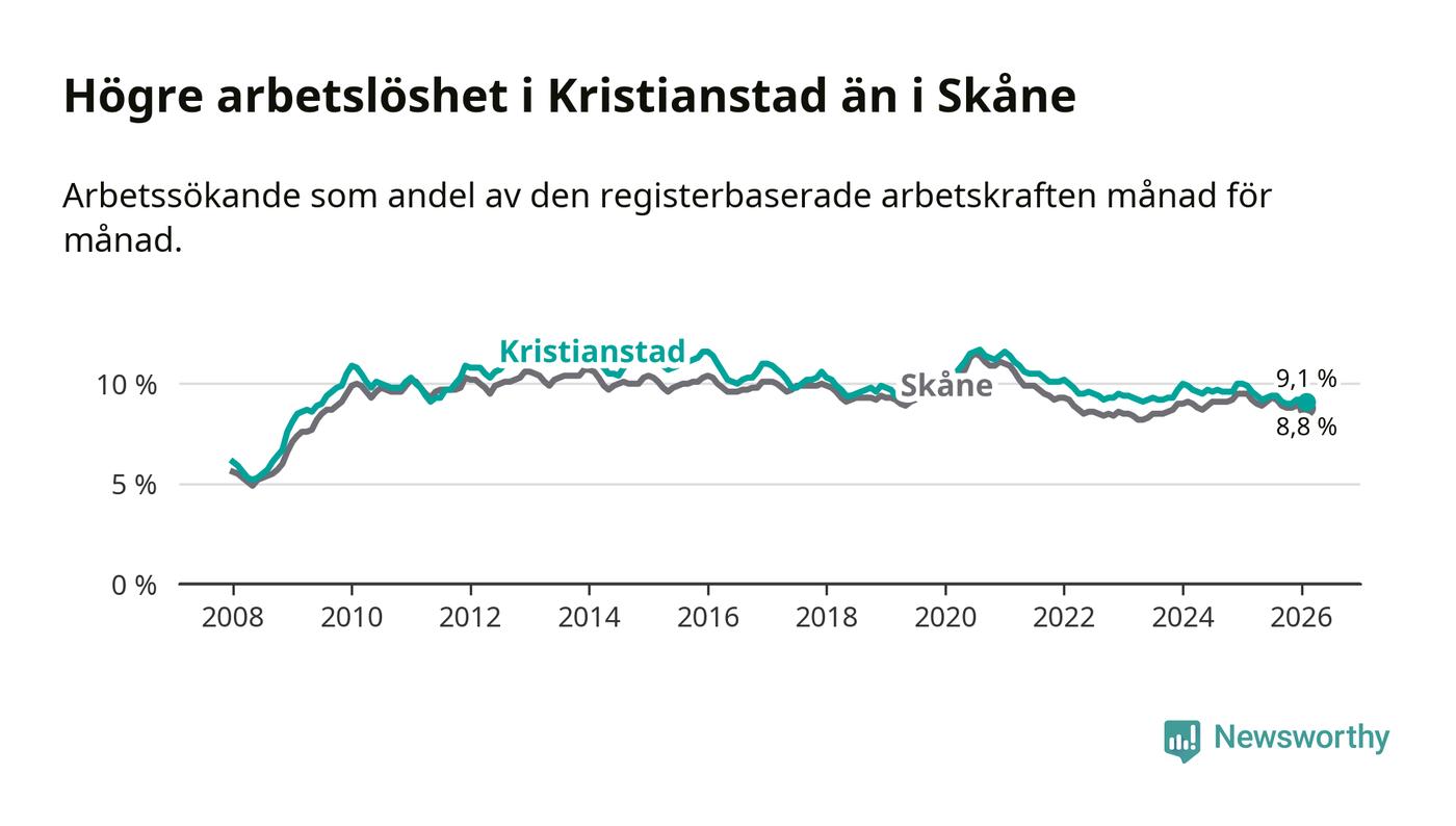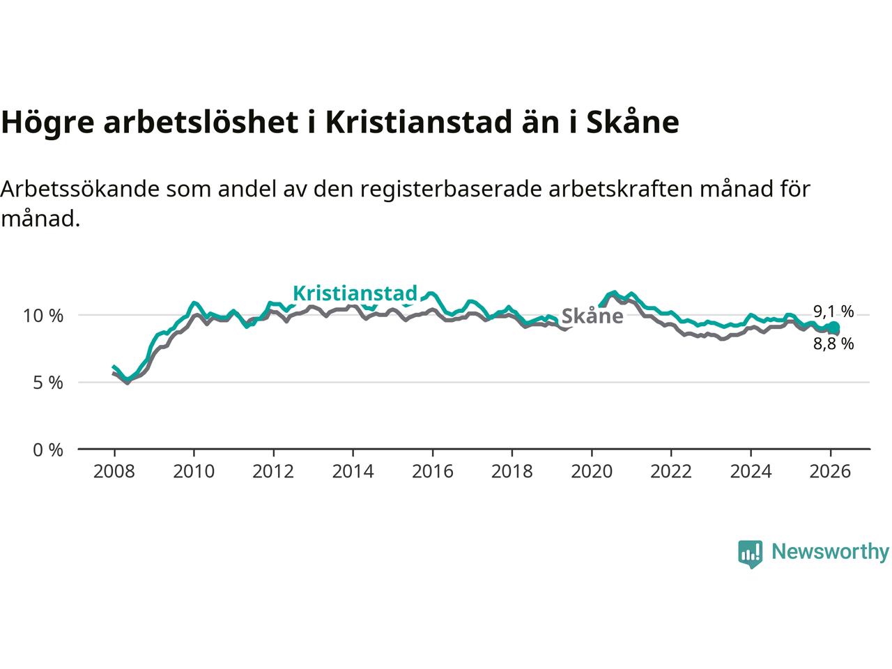 Även om arbetslösheten i Kristianstad alltså minskar, så ligger den fortfarande över snittet i hela Skåne län (9,1 procent i kommunen, jämfört med 8,8 procent i hela länet). Lomma har den lägsta arbetslösheten i länet (3,8 procent), medan Perstorp har den högsta (13,2 procent). För att Kristianstad skulle komma ner i samma arbetslöshetsnivå som Lomma skulle 2 217 personer behöva sysselsättas.