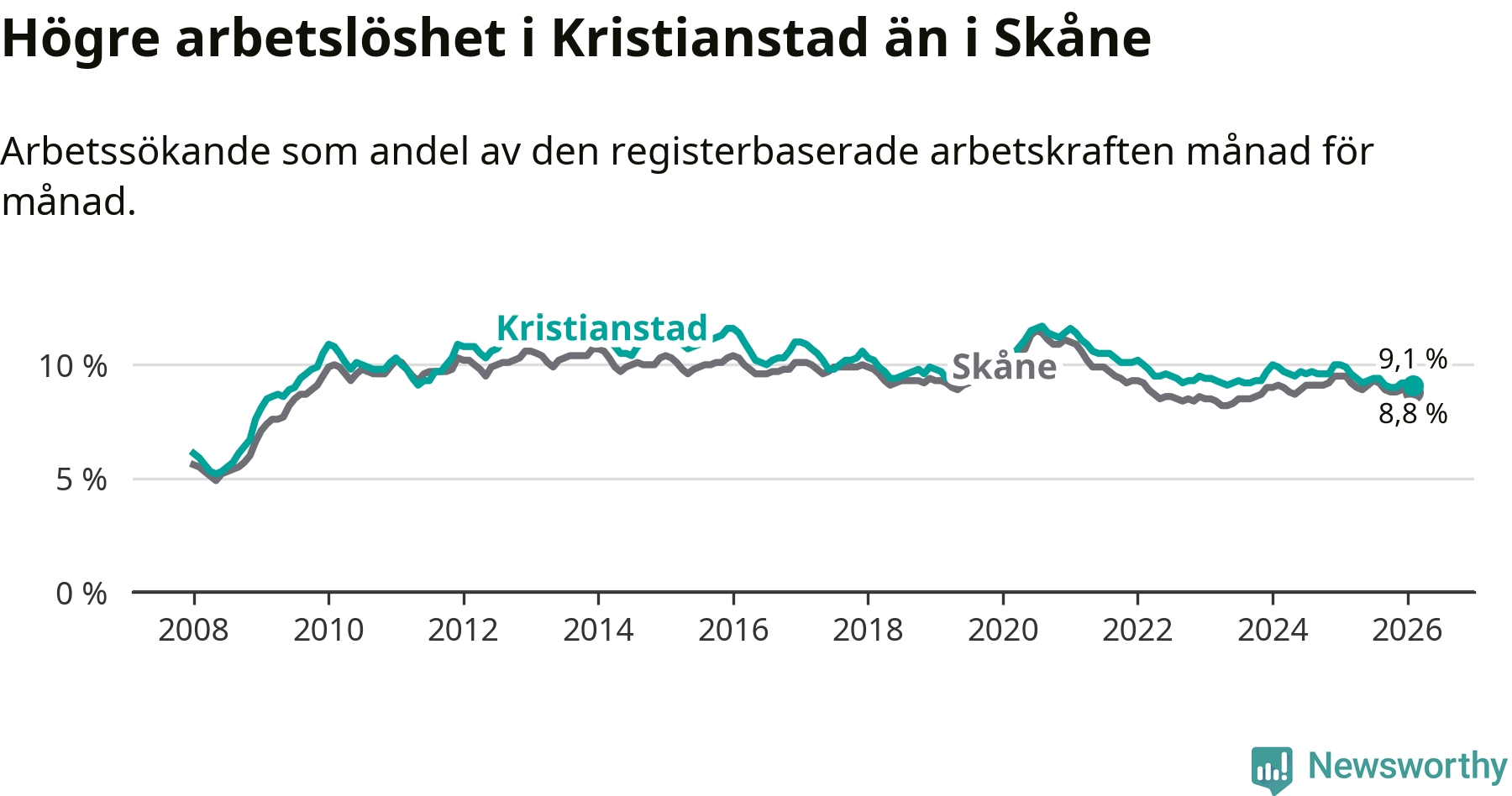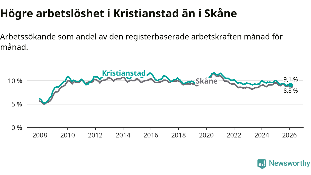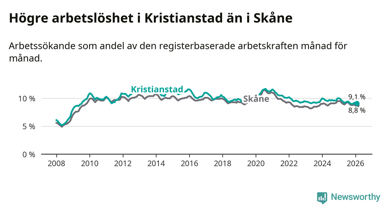 Graf: Arbetslöshet i Kristianstads kommun och Skåne län