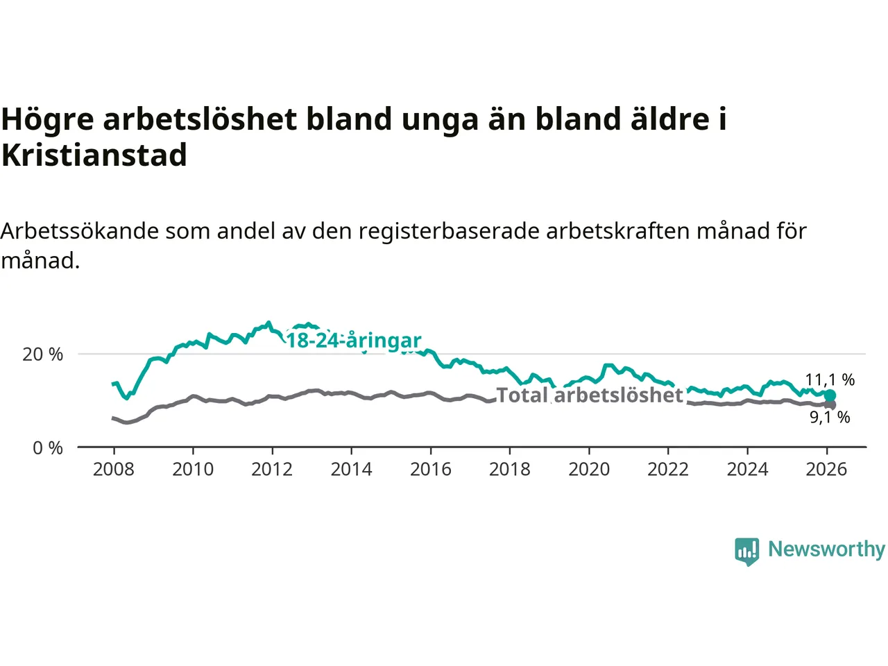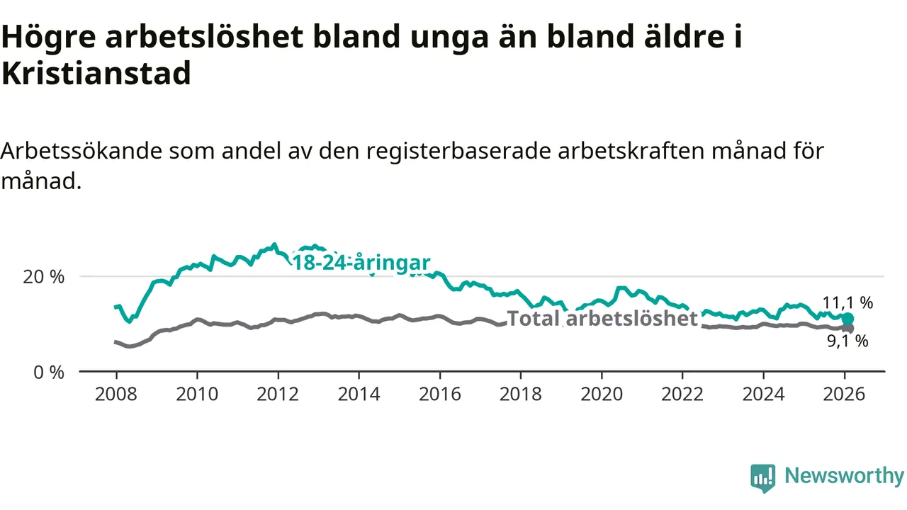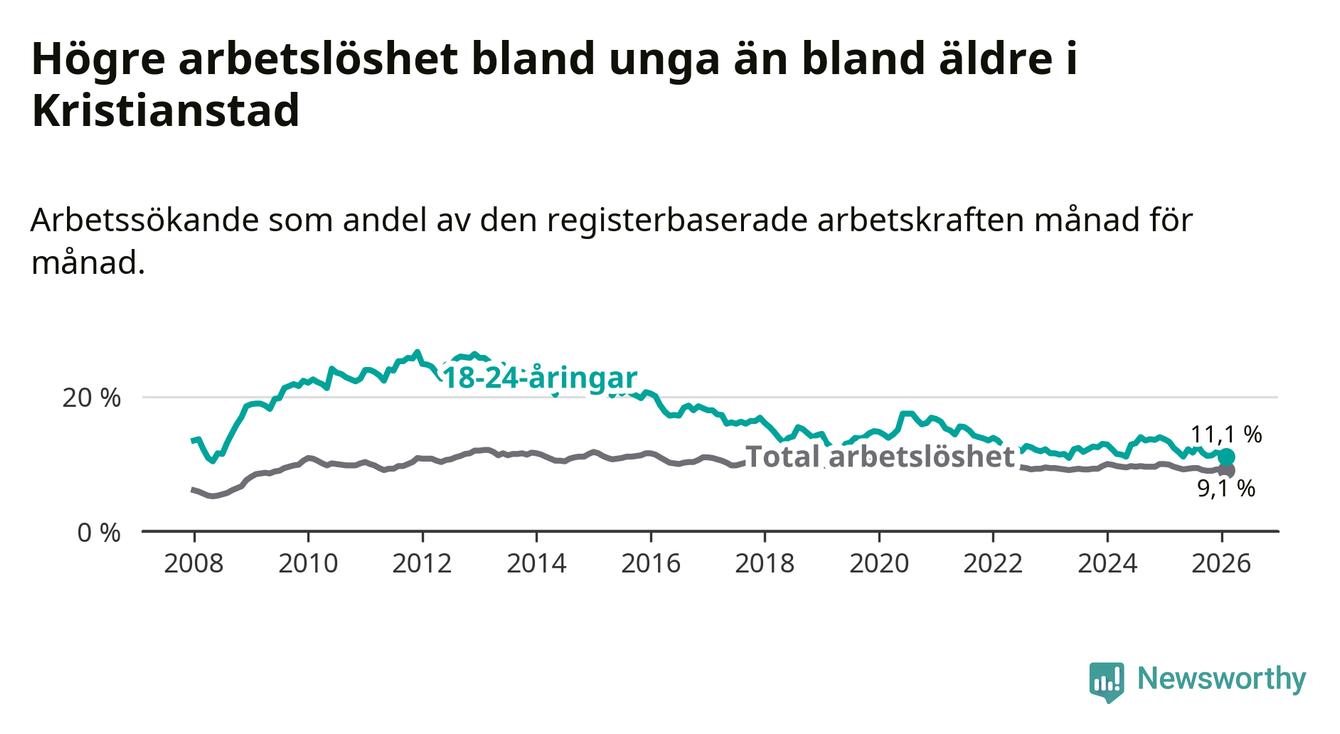 I och med den senaste månadens nedgång har de ungas arbetslöshet i Kristianstad sjunkit nio månader i följd (ner från 11,1 procent i maj 2025 till 11,1 procent nu).