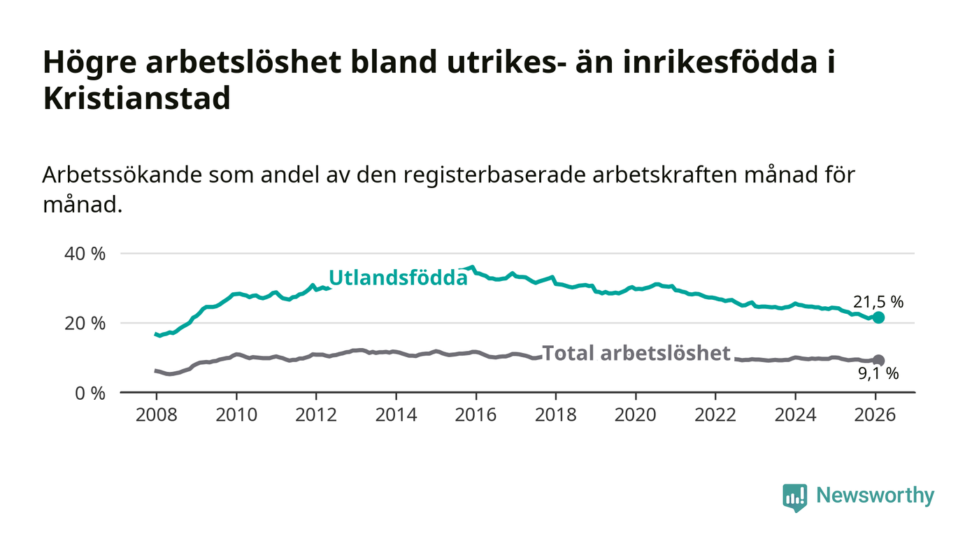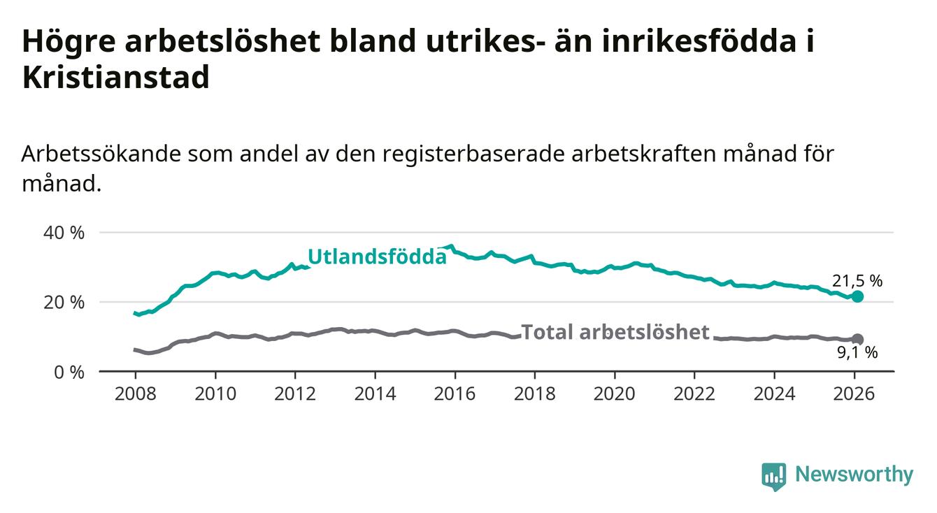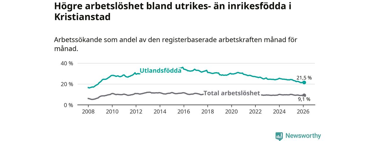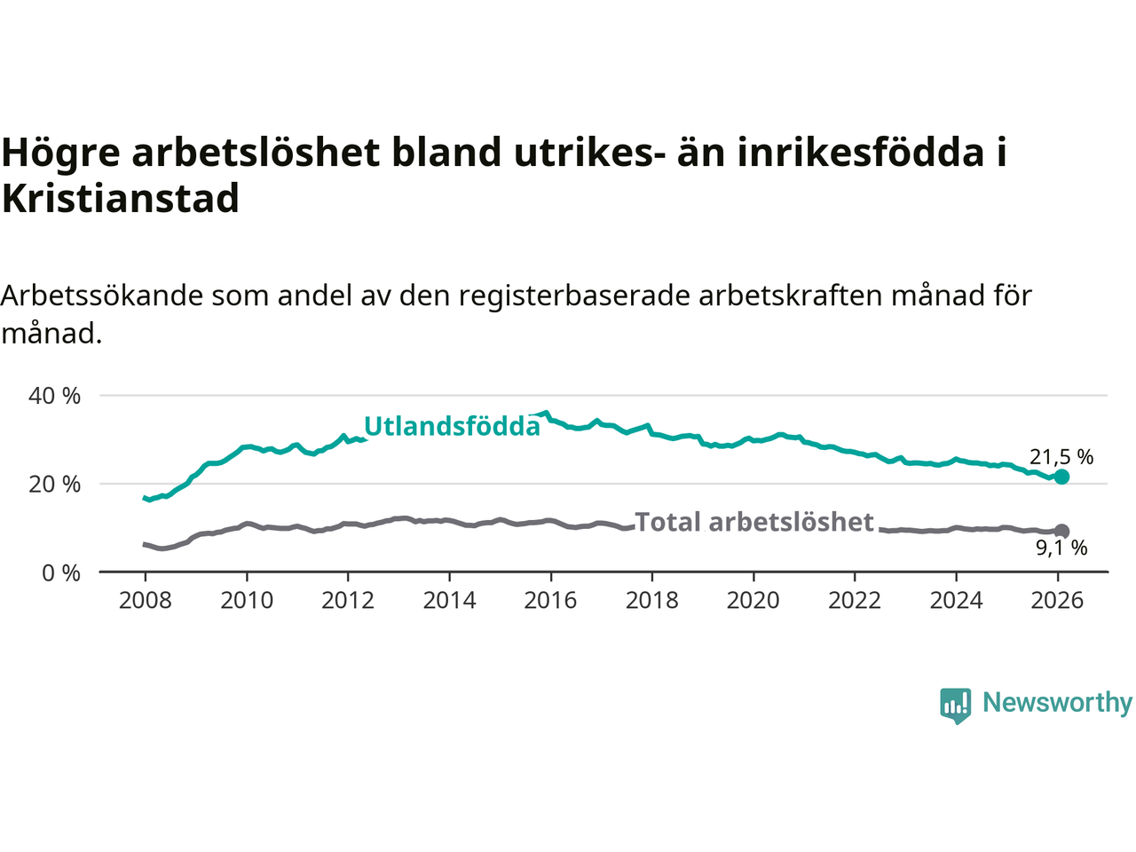 Arbetslösheten bland utlandsfödda var 21,5 procent i Kristianstad under februari månad, motsvarande 2 245 av 10 442 personer. Det är 2,6 procentenheter färre än vid samma tidpunkt i fjol (−256 om man räknar personer). Därmed är de utlandsföddas arbetslöshet lägre än vid samma tidpunkt i fjol för 18:e månaden i följd. Sedan augusti 2024 har arbetslösheten bland utlandsfödda minskat från 24,4 till 21,5 procent.